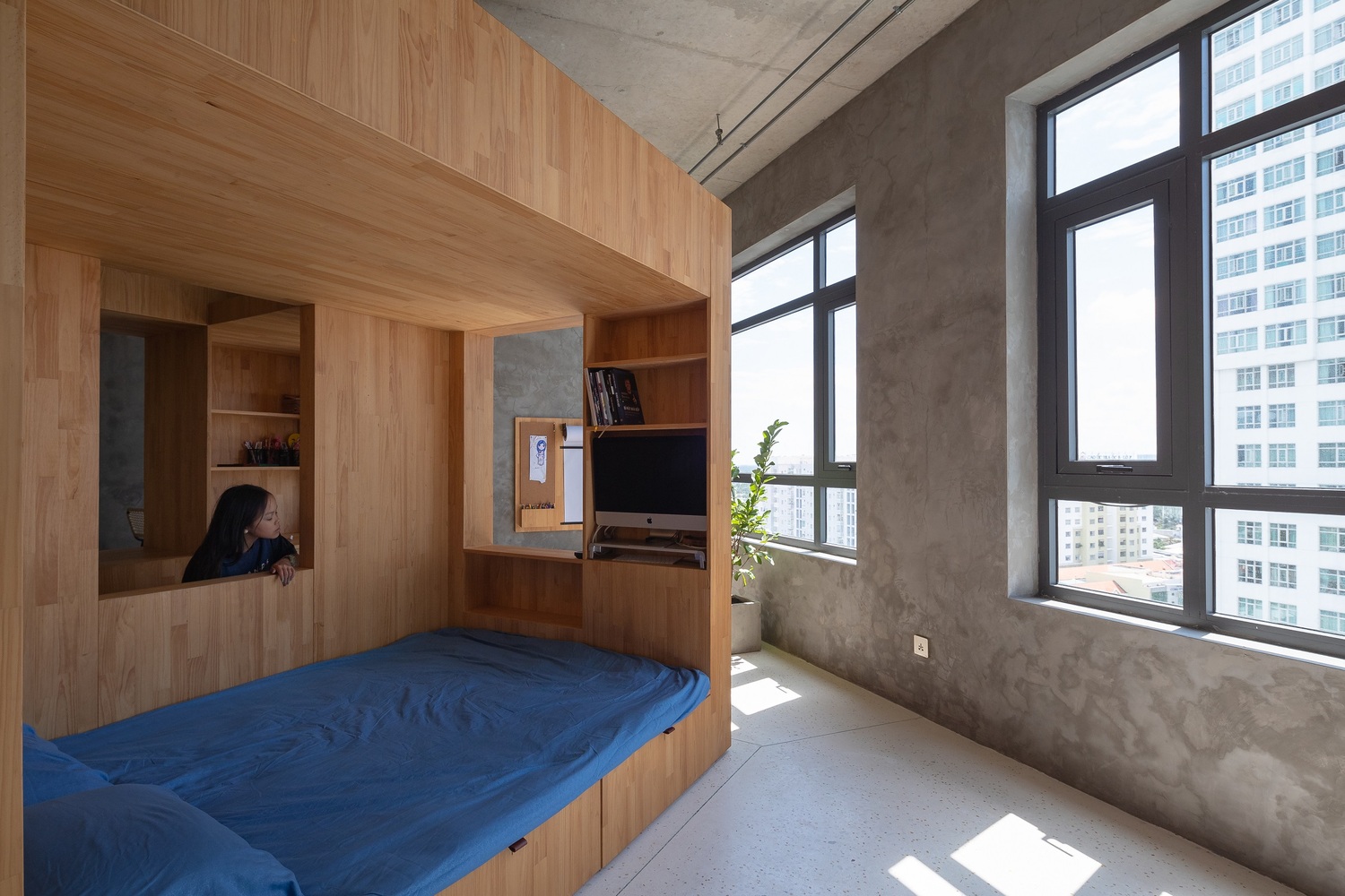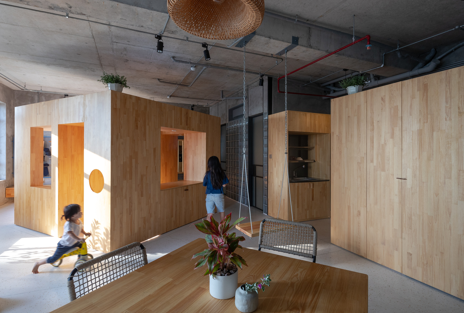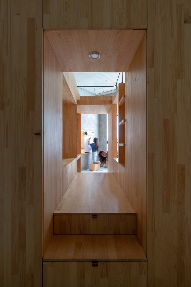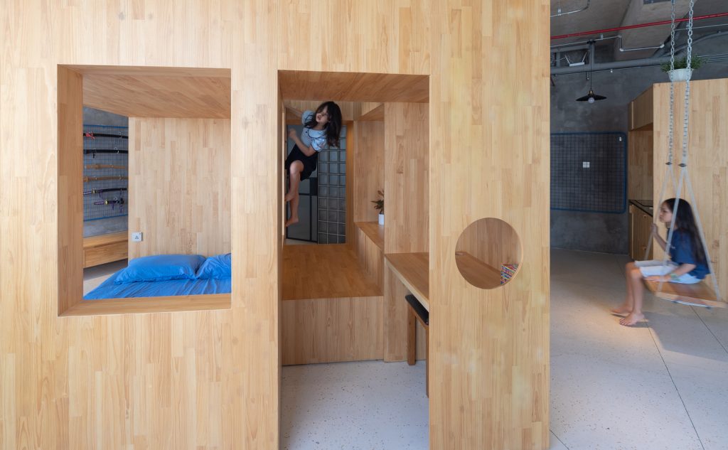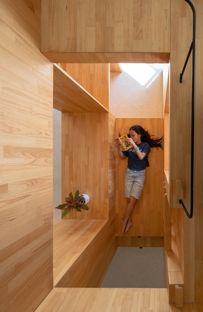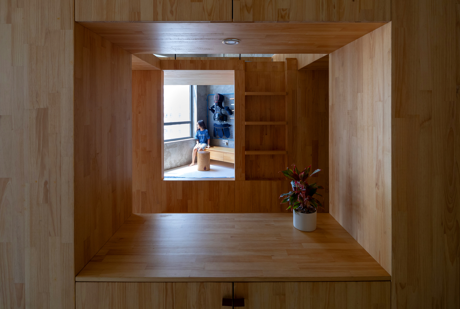 Tại trung tâm ngôi nhà, KTS đặt một hộp gỗ có kích thước 3m x 3m x 2,2m được bố trí giường tầng, không gian làm việc, học tập và tủ kệ. Các không gian bên trong hộp được kết nối theo cả chiều dọc và chiều ngang, vì vậy các hoạt động có thể diễn ra mà không bị gián đoạn. Chiếc hộp được xoay ở một góc 45 độ để tạo ra các góc mở, như vậy không gian sẽ rộng hơn và ánh sáng mặt trời có thể đi sâu hơn vào các khu vực bên trong như nhà bếp và nhà vệ sinh.