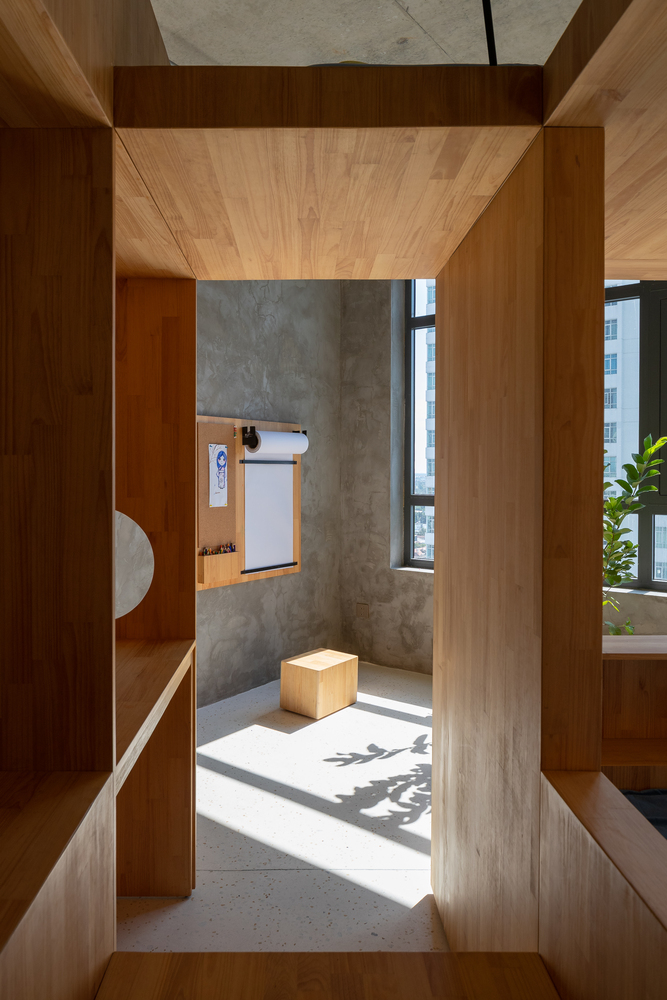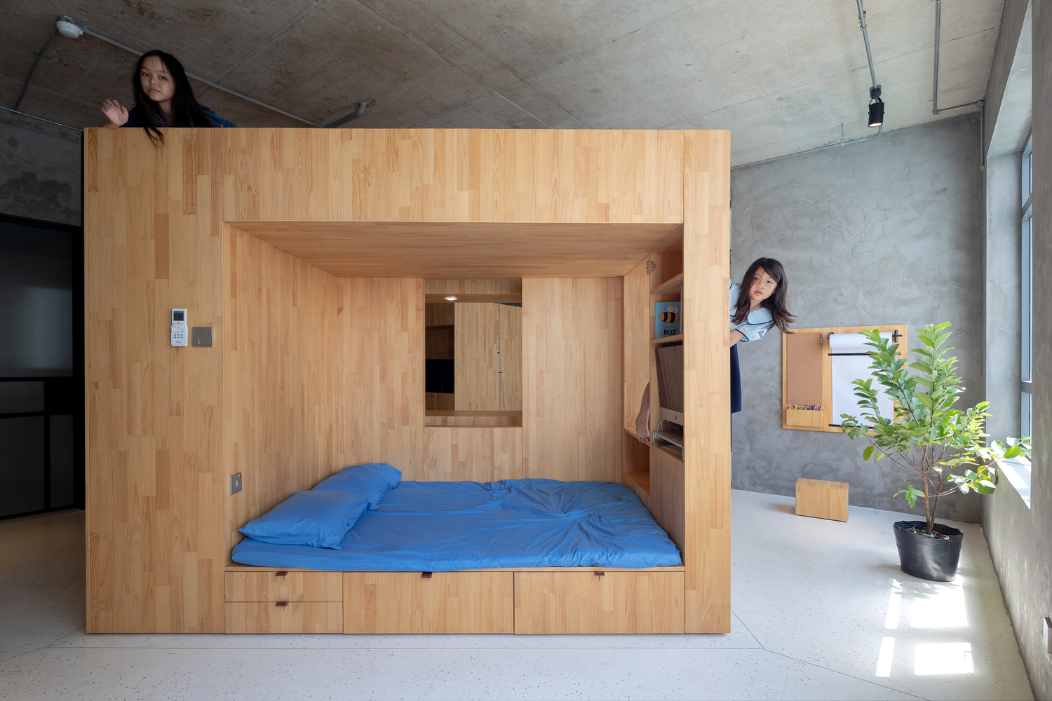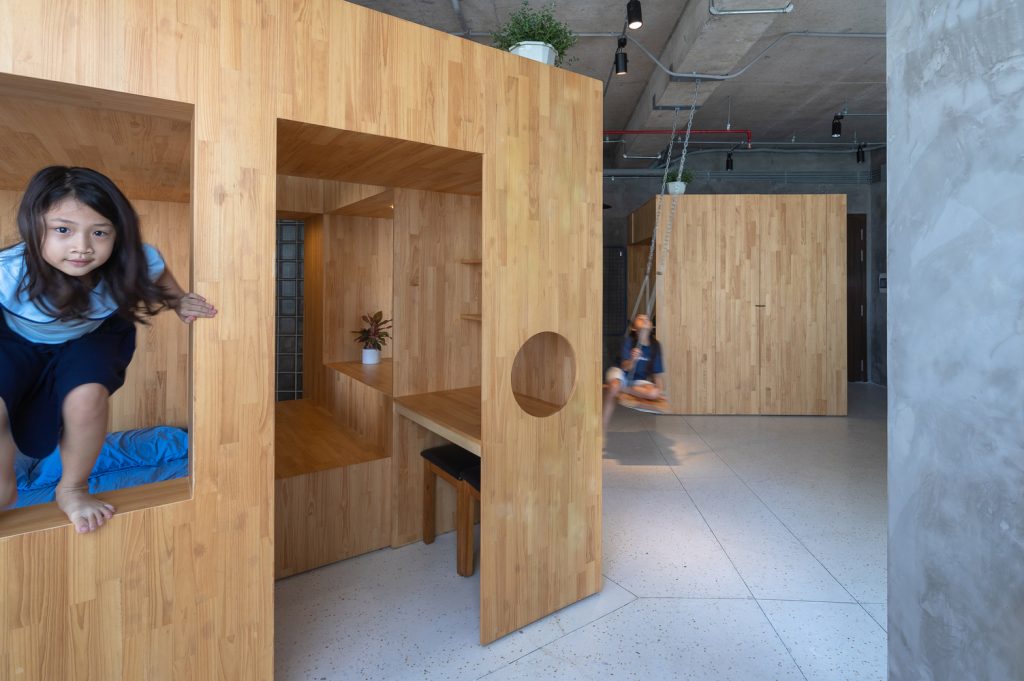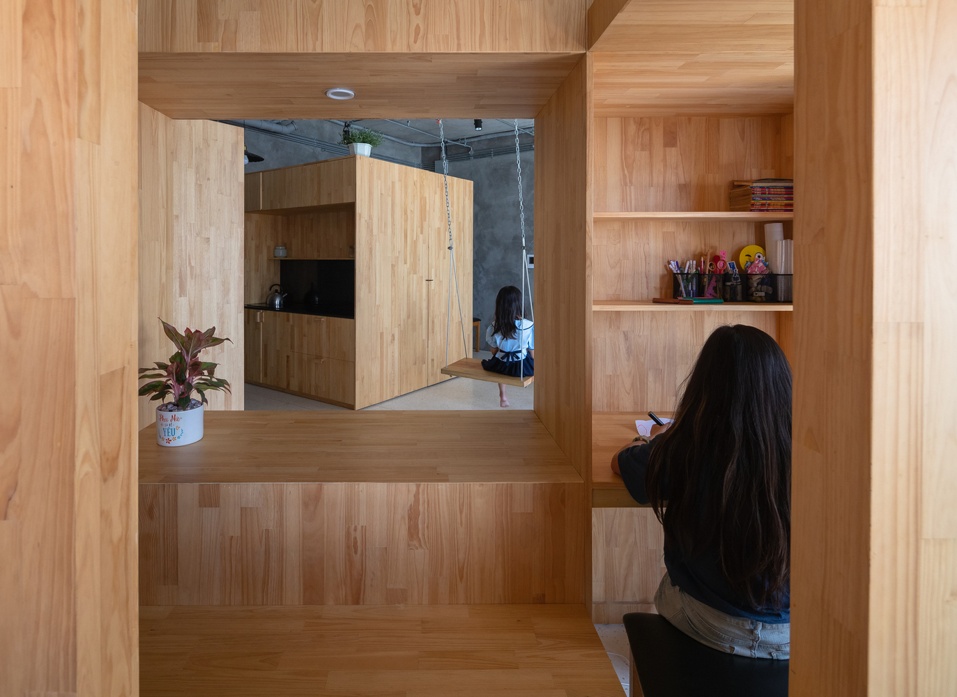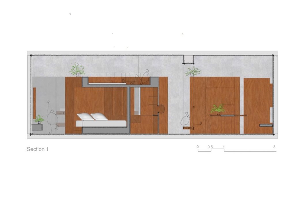 Tại trung tâm ngôi nhà, KTS đặt một hộp gỗ có kích thước 3m x 3m x 2,2m được bố trí giường tầng, không gian làm việc, học tập và tủ kệ. Các không gian bên trong hộp được kết nối theo cả chiều dọc và chiều ngang, vì vậy các hoạt động có thể diễn ra mà không bị gián đoạn. Chiếc hộp được xoay ở một góc 45 độ để tạo ra các góc mở, như vậy không gian sẽ rộng hơn và ánh sáng mặt trời có thể đi sâu hơn vào các khu vực bên trong như nhà bếp và nhà vệ sinh.