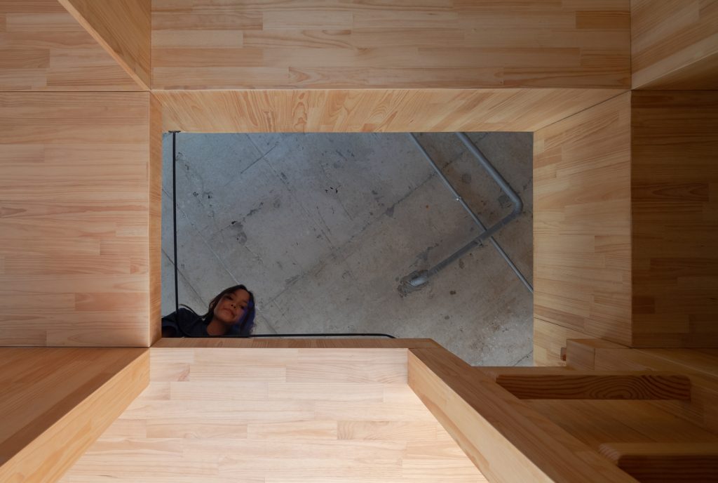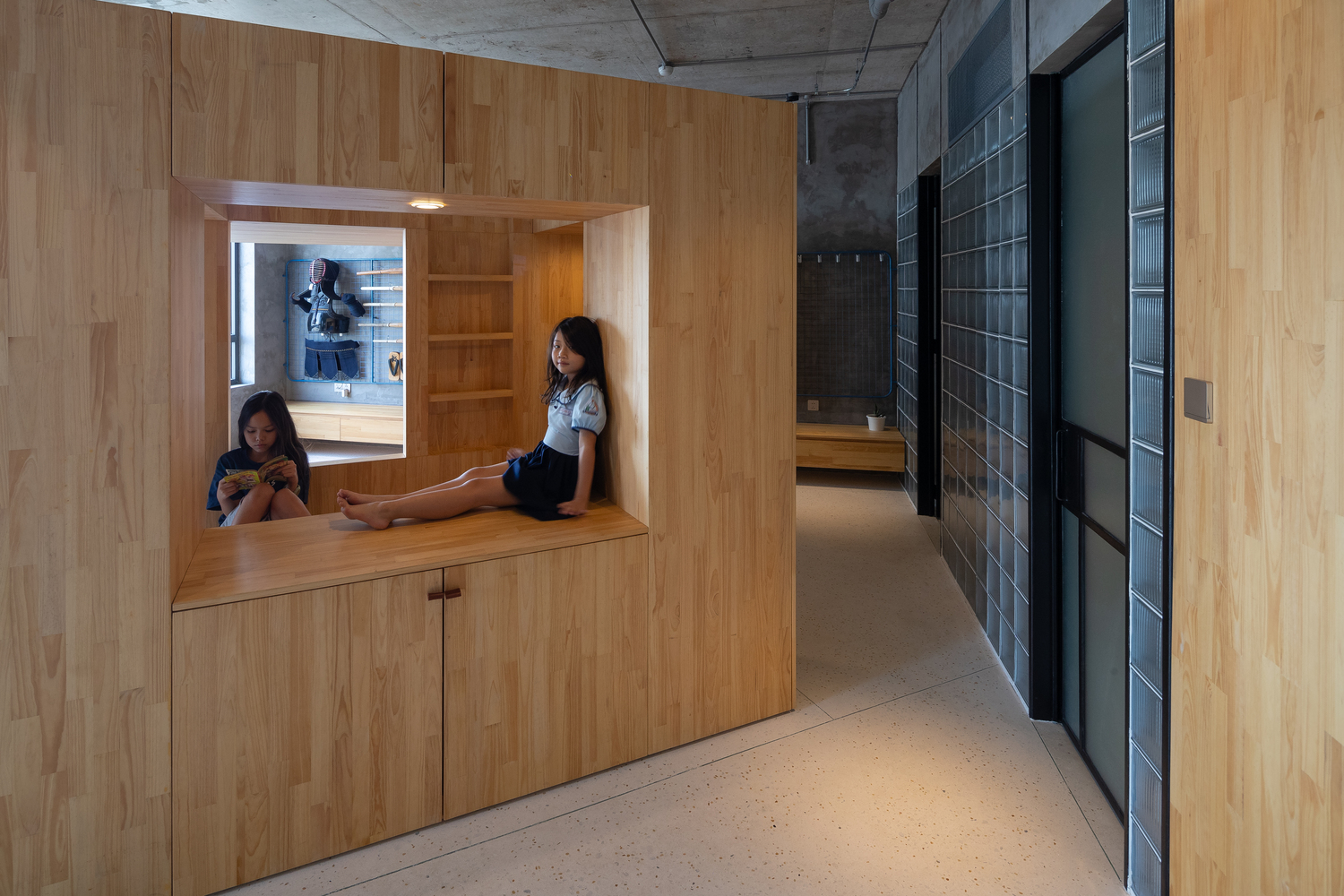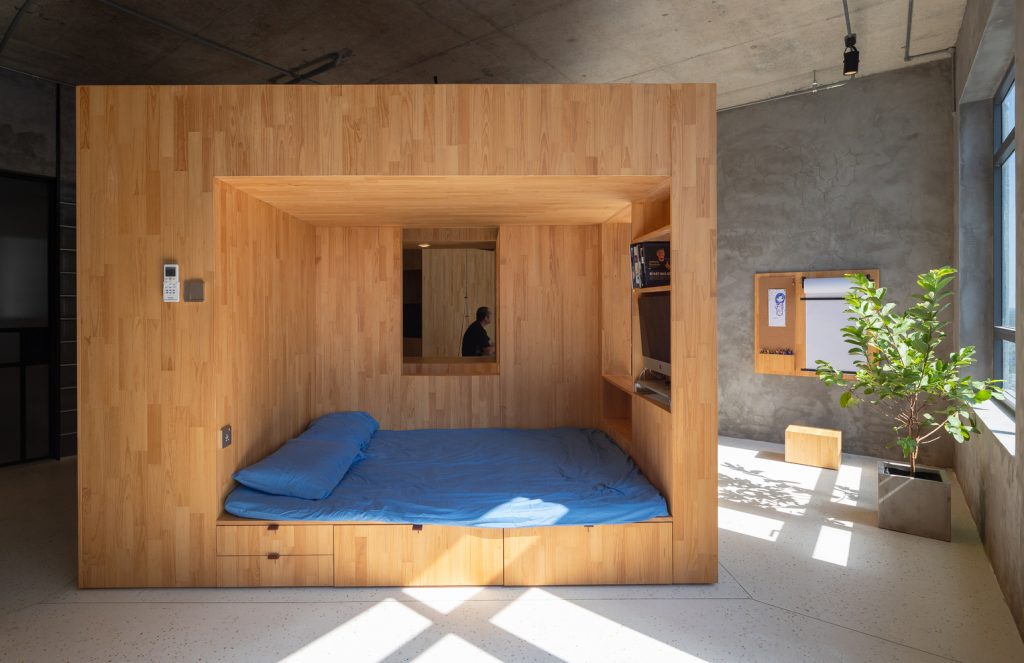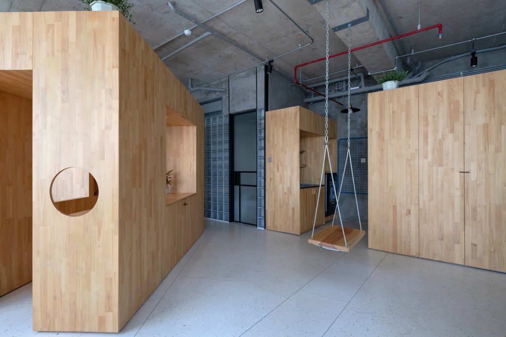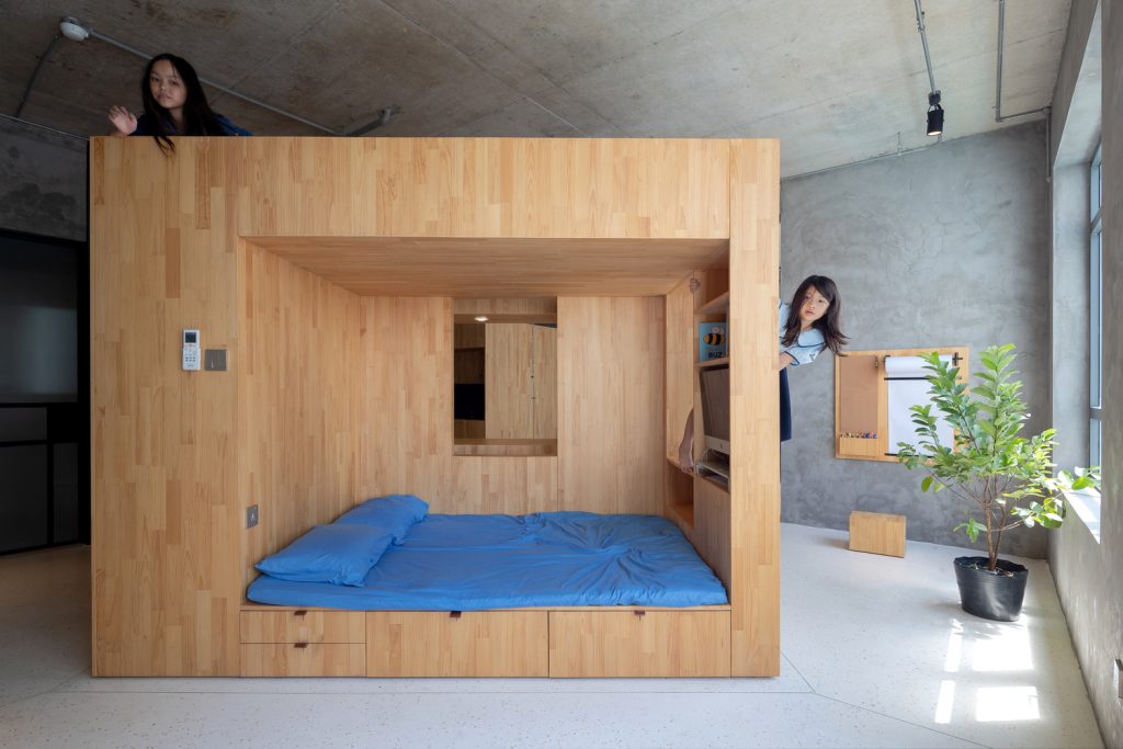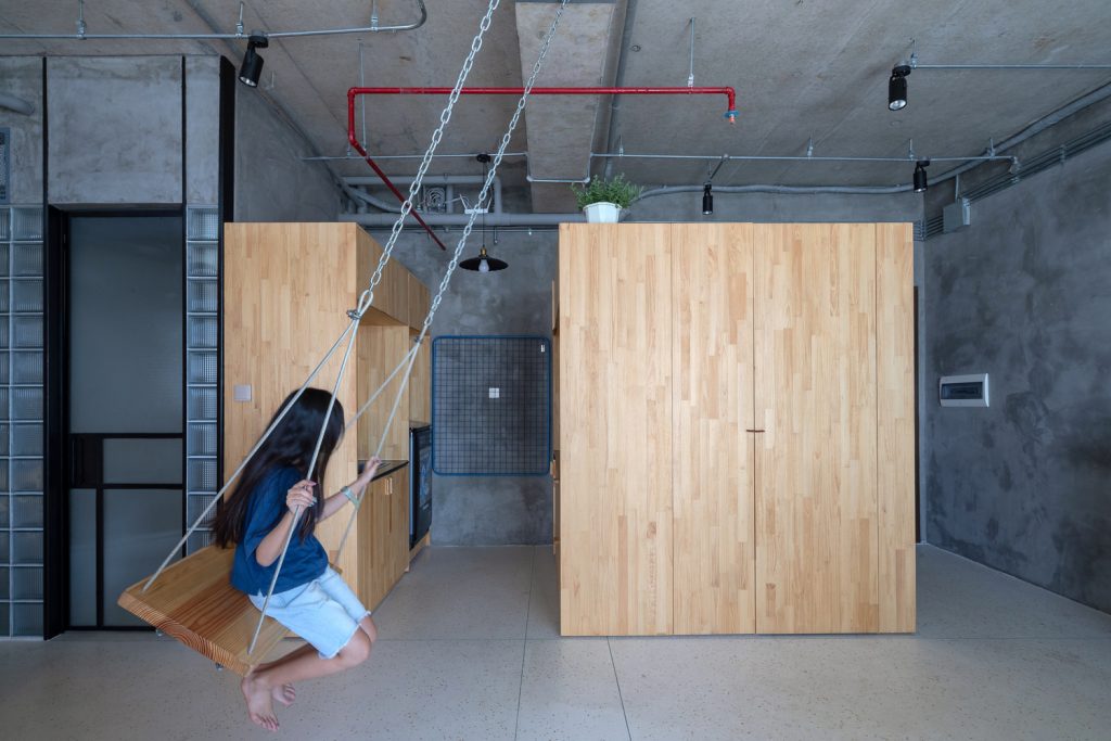 Tại trung tâm ngôi nhà, KTS đặt một hộp gỗ có kích thước 3m x 3m x 2,2m được bố trí giường tầng, không gian làm việc, học tập và tủ kệ. Các không gian bên trong hộp được kết nối theo cả chiều dọc và chiều ngang, vì vậy các hoạt động có thể diễn ra mà không bị gián đoạn. Chiếc hộp được xoay ở một góc 45 độ để tạo ra các góc mở, như vậy không gian sẽ rộng hơn và ánh sáng mặt trời có thể đi sâu hơn vào các khu vực bên trong như nhà bếp và nhà vệ sinh.