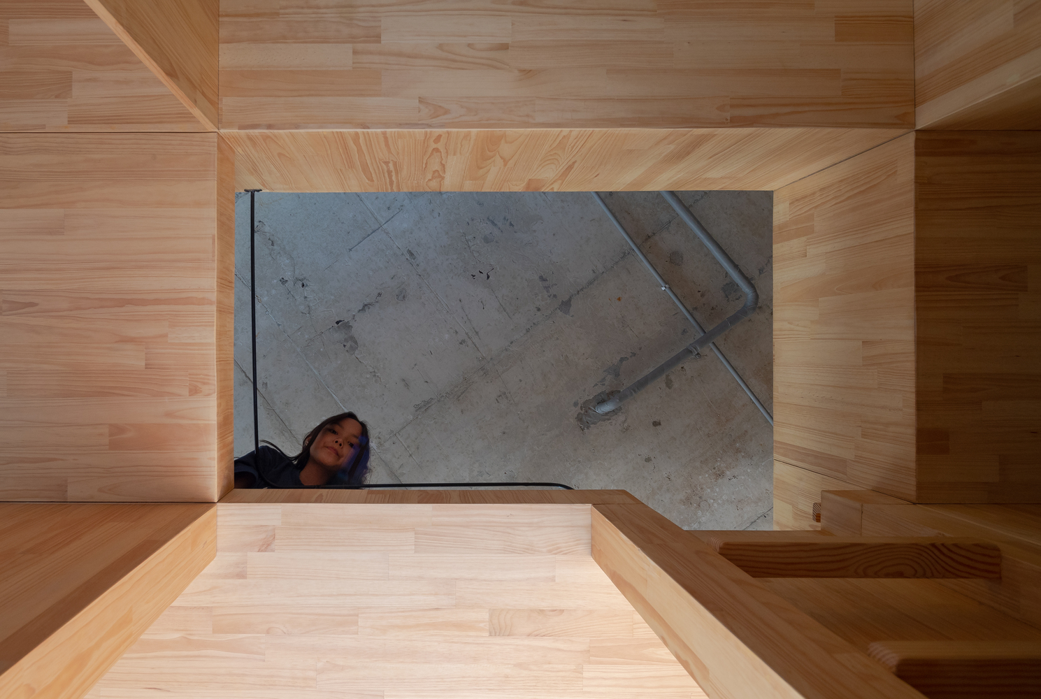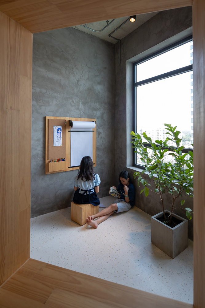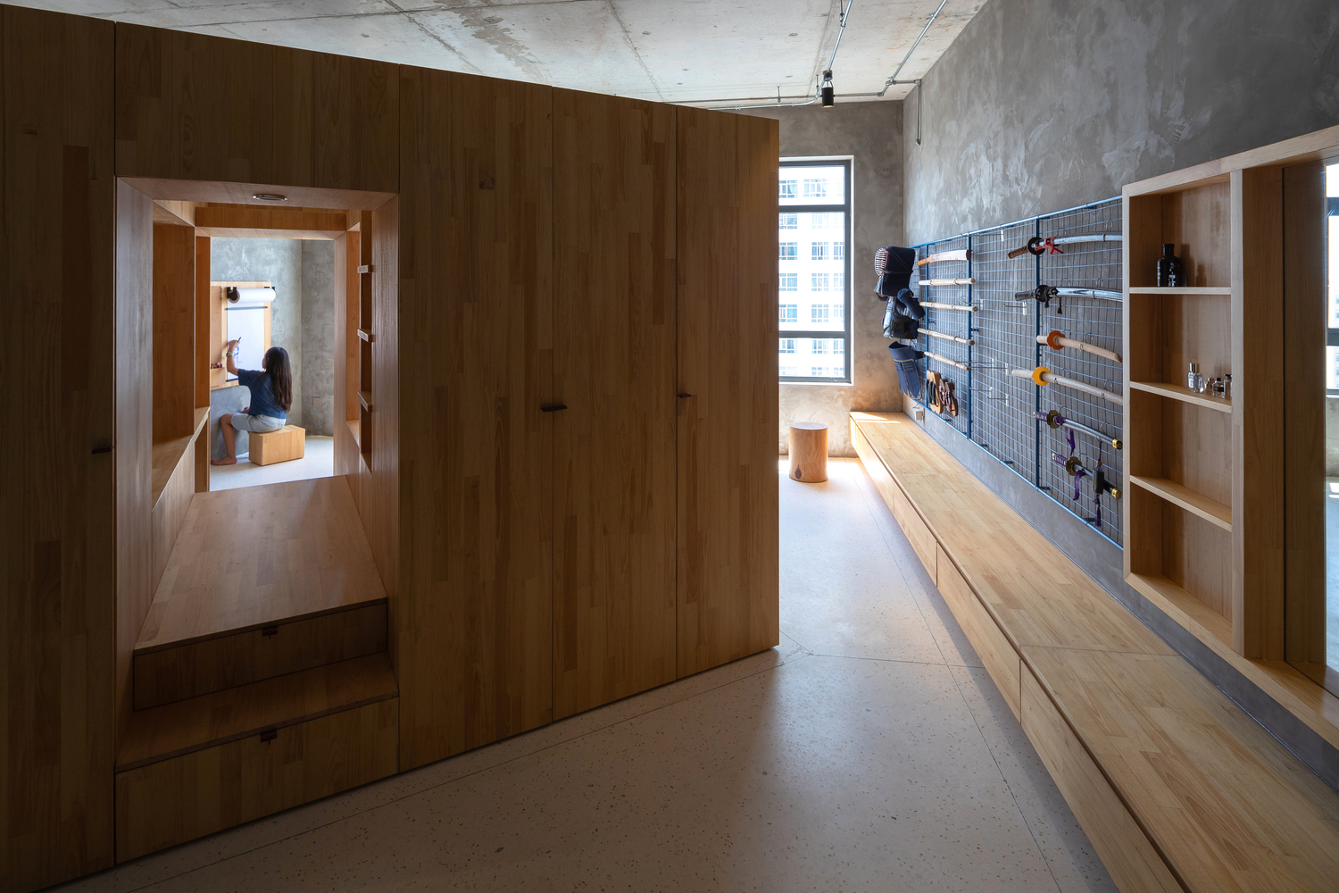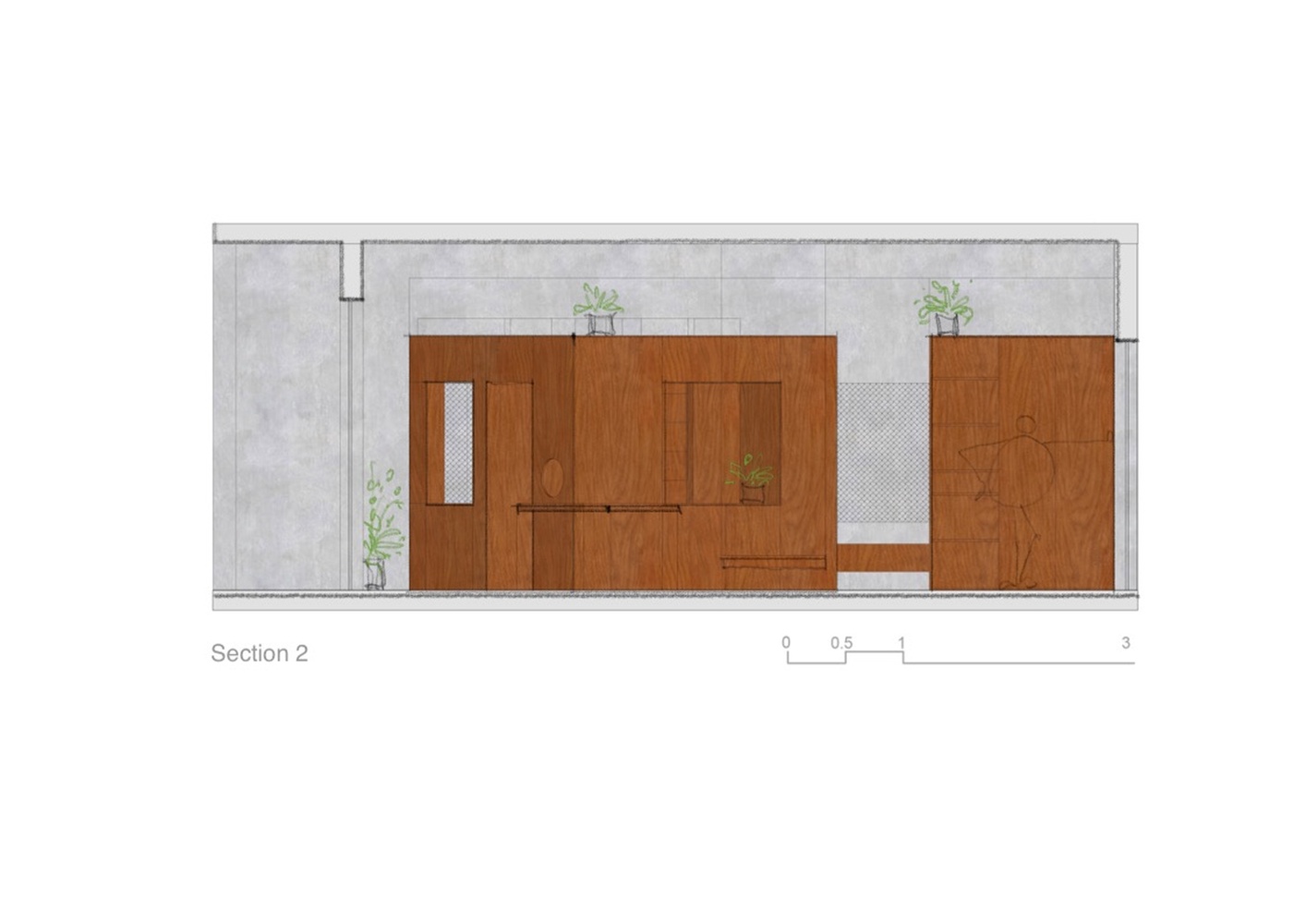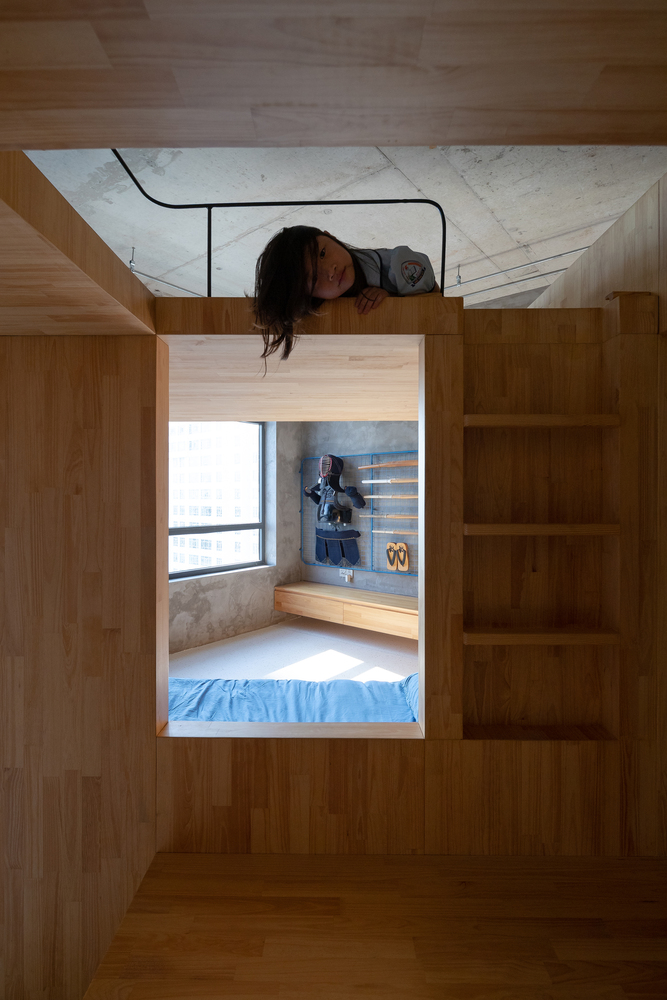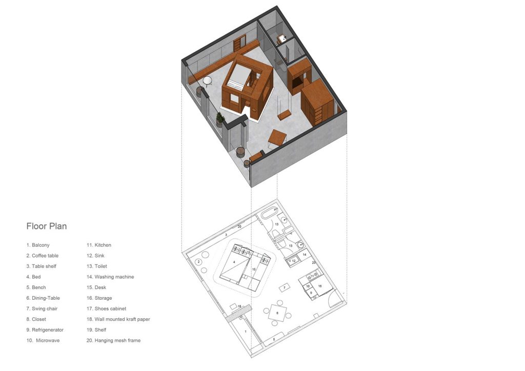 Tại trung tâm ngôi nhà, KTS đặt một hộp gỗ có kích thước 3m x 3m x 2,2m được bố trí giường tầng, không gian làm việc, học tập và tủ kệ. Các không gian bên trong hộp được kết nối theo cả chiều dọc và chiều ngang, vì vậy các hoạt động có thể diễn ra mà không bị gián đoạn. Chiếc hộp được xoay ở một góc 45 độ để tạo ra các góc mở, như vậy không gian sẽ rộng hơn và ánh sáng mặt trời có thể đi sâu hơn vào các khu vực bên trong như nhà bếp và nhà vệ sinh.