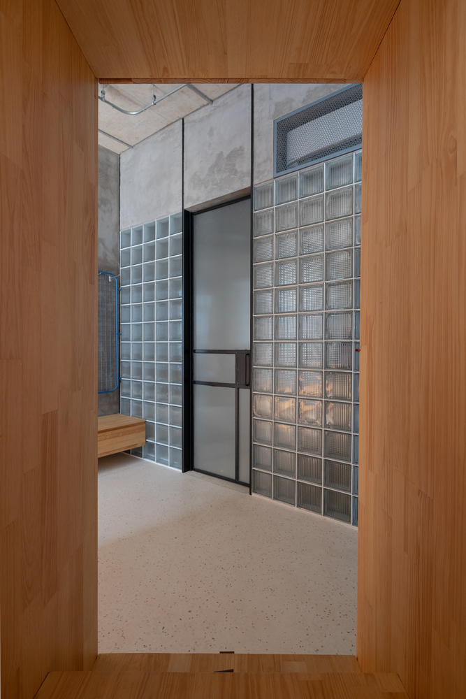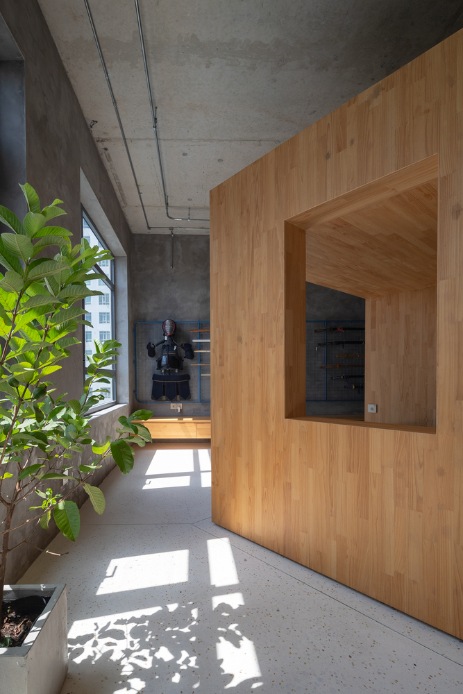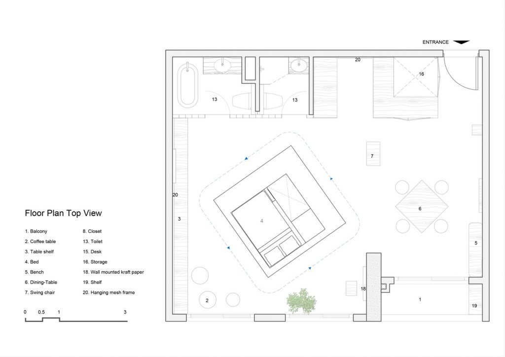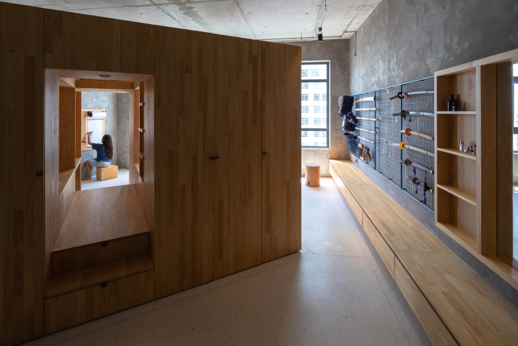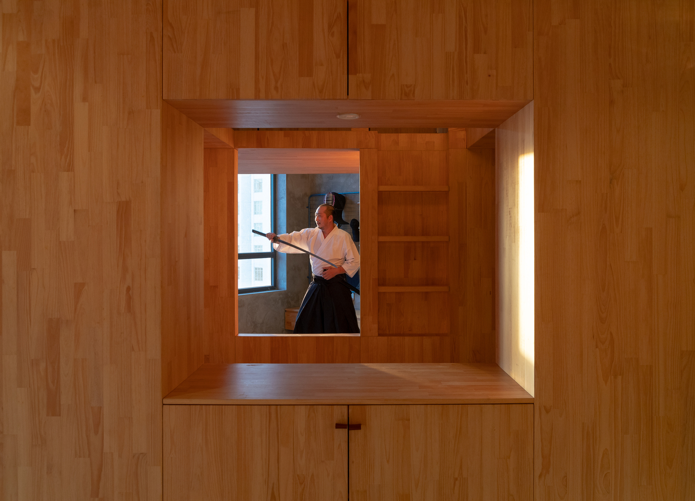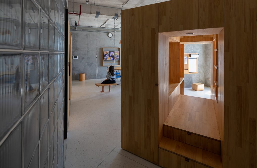 Tại trung tâm ngôi nhà, KTS đặt một hộp gỗ có kích thước 3m x 3m x 2,2m được bố trí giường tầng, không gian làm việc, học tập và tủ kệ. Các không gian bên trong hộp được kết nối theo cả chiều dọc và chiều ngang, vì vậy các hoạt động có thể diễn ra mà không bị gián đoạn. Chiếc hộp được xoay ở một góc 45 độ để tạo ra các góc mở, như vậy không gian sẽ rộng hơn và ánh sáng mặt trời có thể đi sâu hơn vào các khu vực bên trong như nhà bếp và nhà vệ sinh.