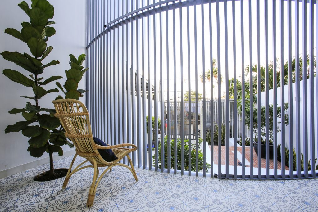 Ngôi nhà được thiết kế theo phong cách kiến trúc hiện đại đồng thời sử dụng một số vật liệu truyền thống như mái ngói đỏ, gạch hoa văn xi măng, gralito. Hàng rào phía trước được tạo hình lõm từ một hàng thanh thép, không chỉ cung cấp một hàng rào bảo vệ mà còn tạo ấn tượng thị giác.