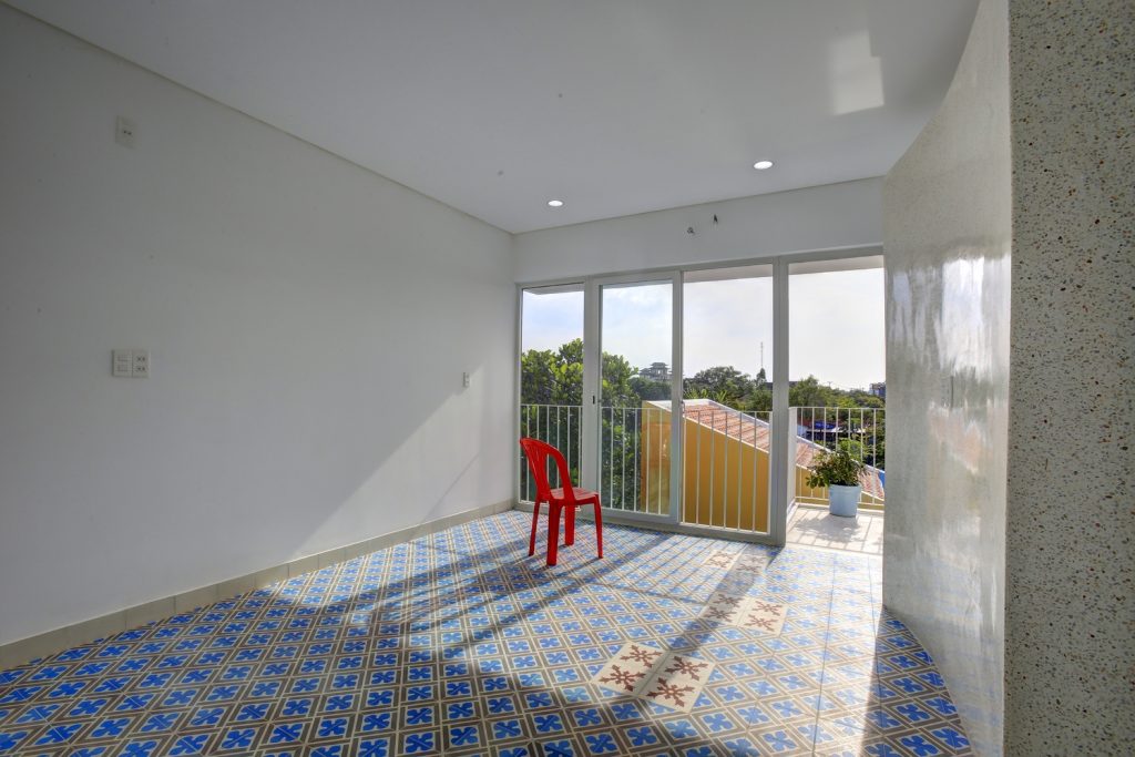 Các phòng ngủ được đặt ở tầng một. Phòng ngủ của bố mẹ ở phía sau, cửa sổ nhìn ra sân sau, trồng một cây xoài xinh xắn. Các bé trai hiện đang ở chung một phòng ngủ phía trước và sẽ được cải tạo thành không gian chung cho gia đình khi chúng lớn lên. Sau đó, tầng hai và phòng sau ở tầng trệt sẽ được thiết kế lại thành phòng ngủ riêng cho hai đứa trẻ khi đã lớn.