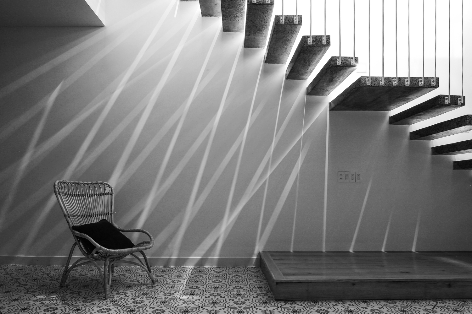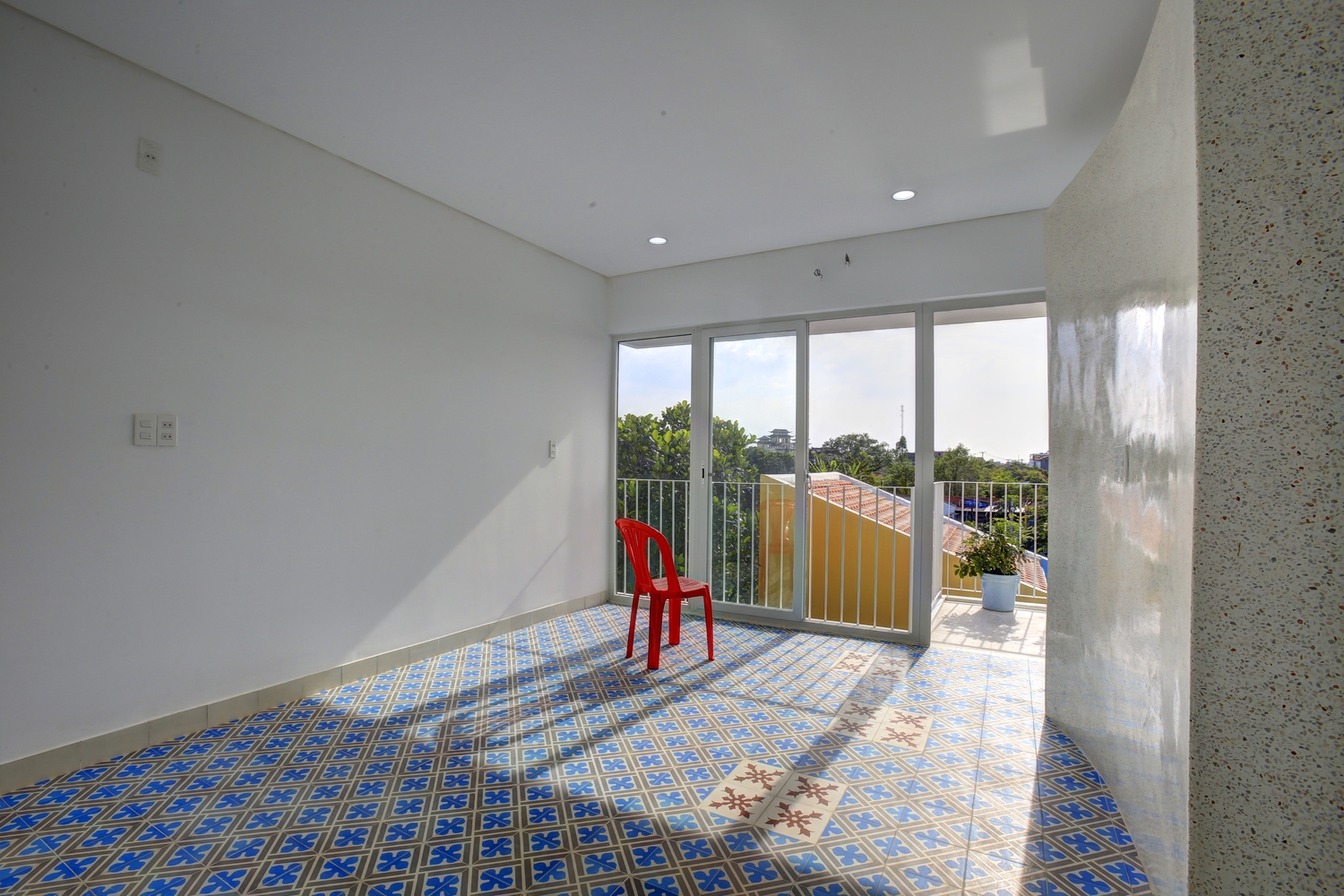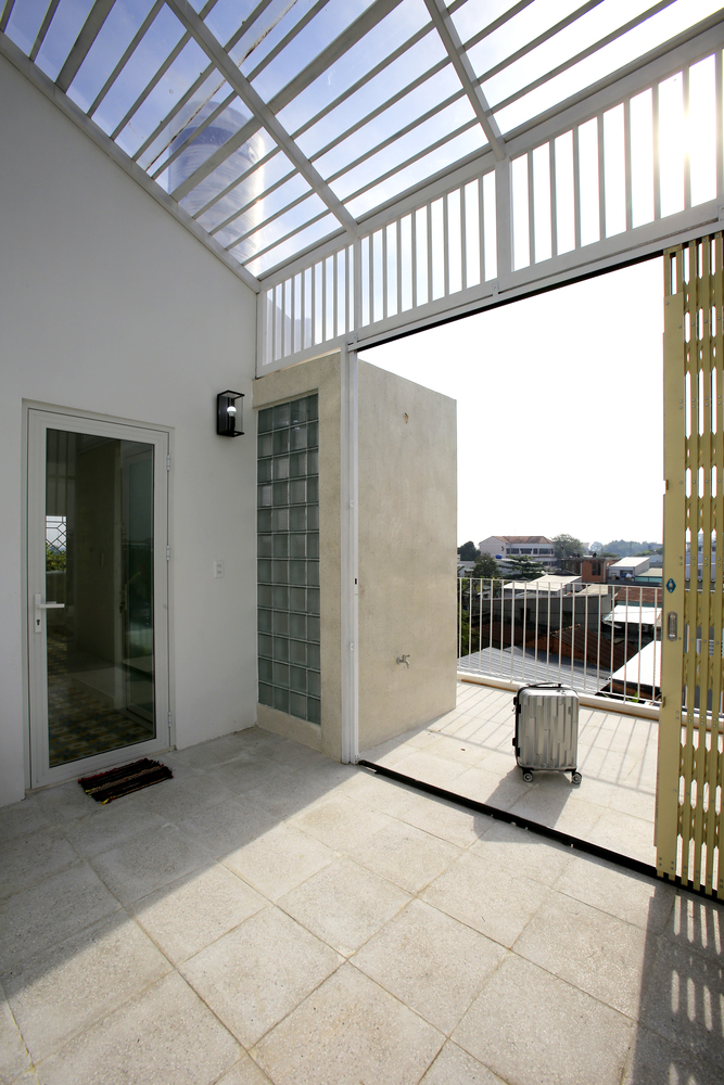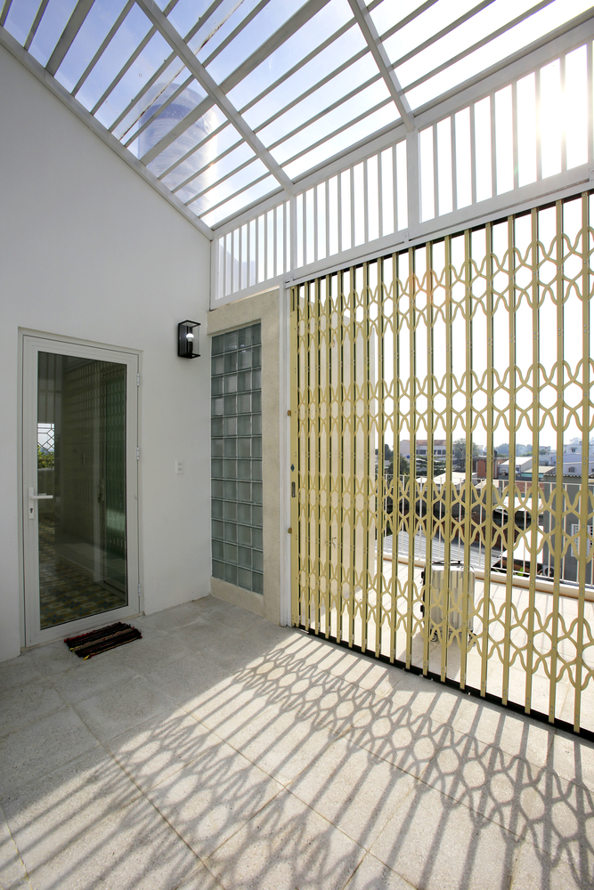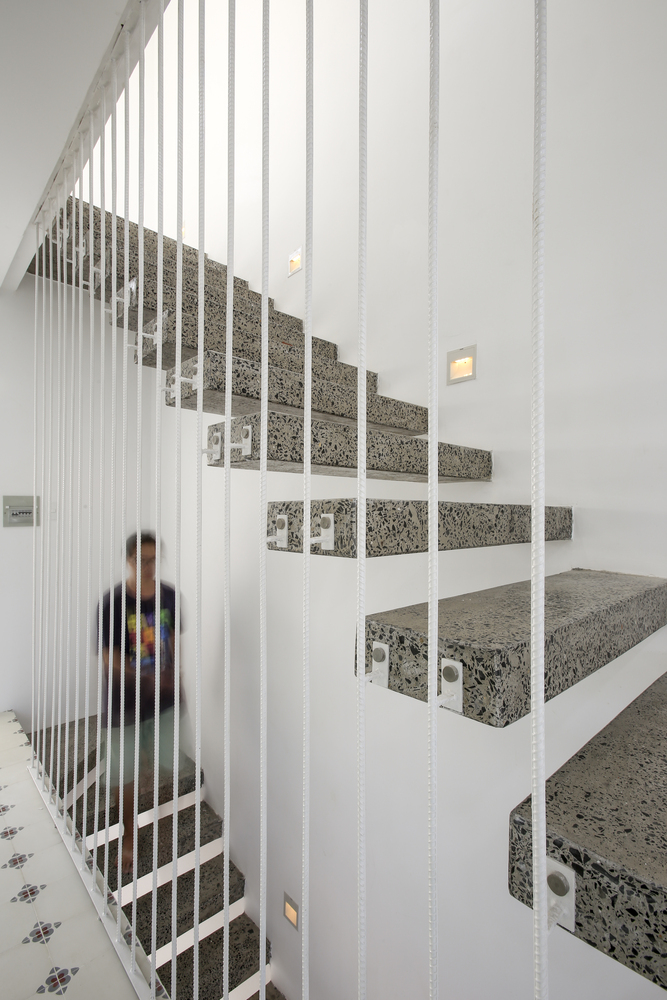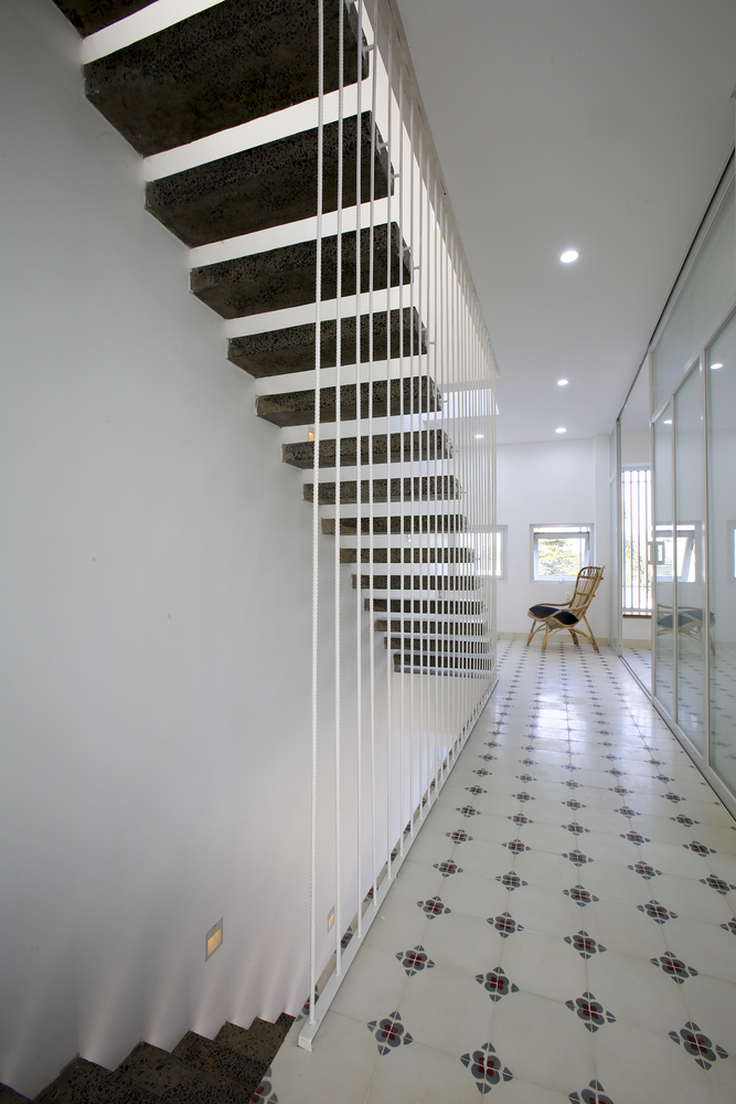Các phòng ngủ được đặt ở tầng một. Phòng ngủ của bố mẹ ở phía sau, cửa sổ nhìn ra sân sau, trồng một cây xoài xinh xắn. Các bé trai hiện đang ở chung một phòng ngủ phía trước và sẽ được cải tạo thành không gian chung cho gia đình khi chúng lớn lên. Sau đó, tầng hai và phòng sau ở tầng trệt sẽ được thiết kế lại thành phòng ngủ riêng cho hai đứa trẻ khi đã lớn.