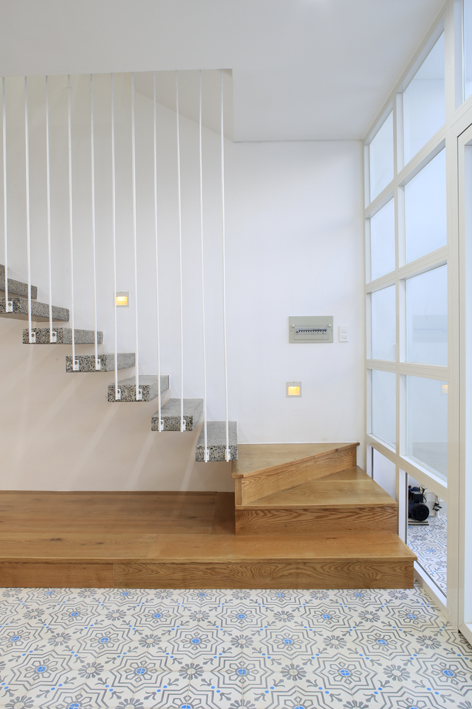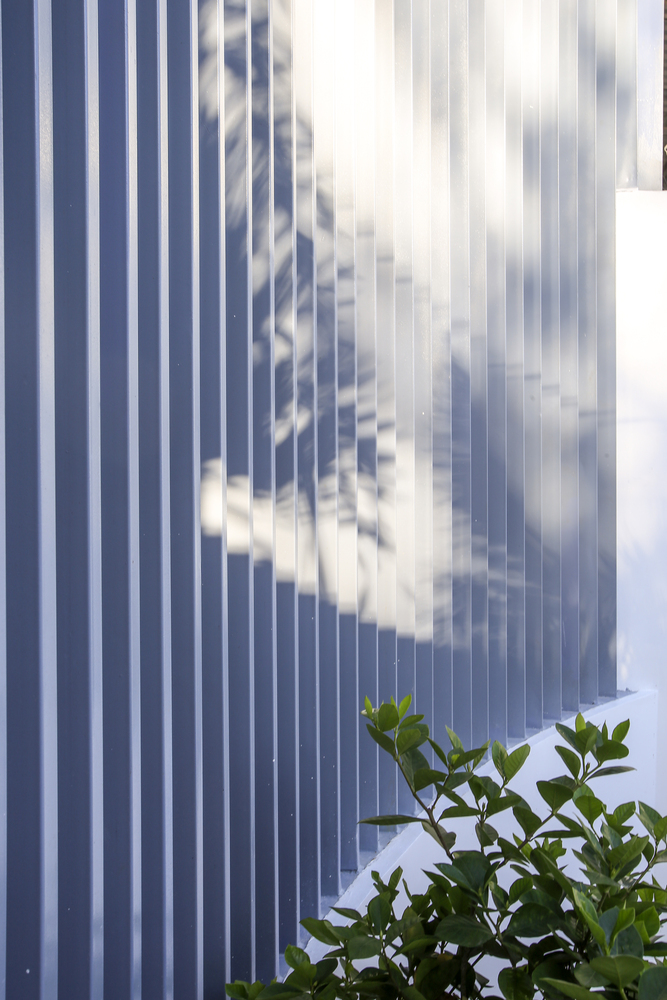 Ngôi nhà được thiết kế theo phong cách kiến trúc hiện đại đồng thời sử dụng một số vật liệu truyền thống như mái ngói đỏ, gạch hoa văn xi măng, gralito. Hàng rào phía trước được tạo hình lõm từ một hàng thanh thép, không chỉ cung cấp một hàng rào bảo vệ mà còn tạo ấn tượng thị giác.