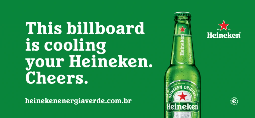 Heineken, công ty sử dụng 100% năng lượng tái tạo trong quá trình sản xuất của mình, vừa cho lắp đặt tại Brazil một biển quảng cáo sử dụng năng lượng mặt trời được thiết kế đặc biệt để có thể làm mát cho bia của bạn!