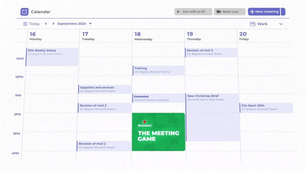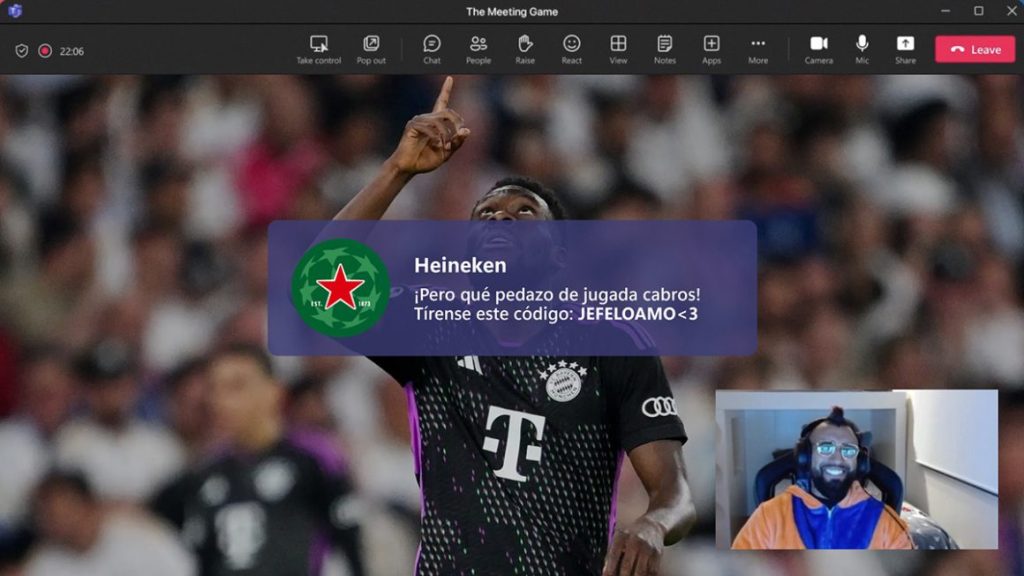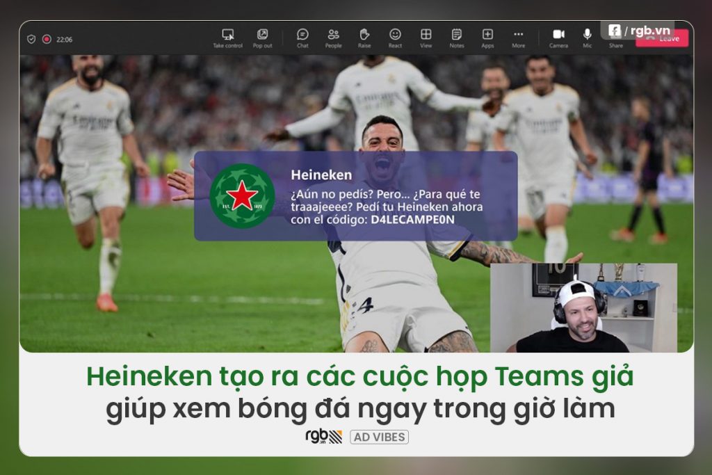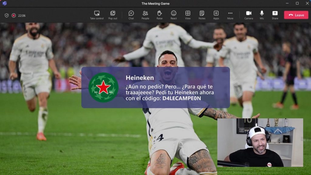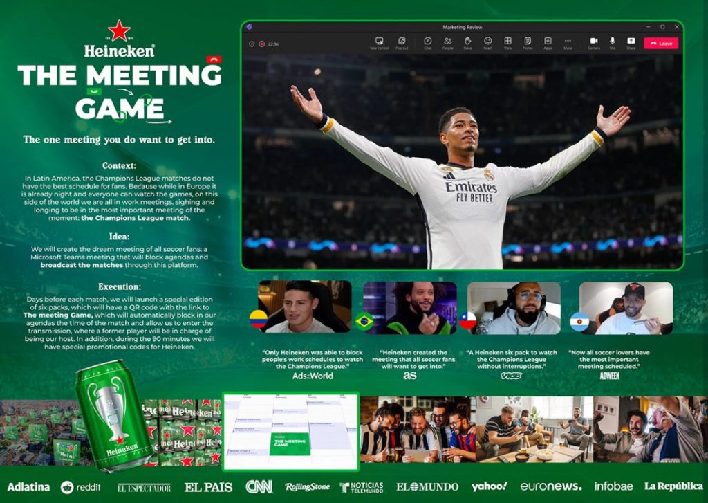 Kết hợp đam mê bóng đá với công việc? Đó là thách thức mà Heineken đã giải quyết một cách sáng tạo với chiến dịch “The Meeting Game“, nhắm đến người hâm mộ UEFA Champions League tại Mỹ Latinh. Trong khu vực này, các trận đấu thường diễn ra vào giữa buổi chiều, trùng với giờ làm việc. Heineken đã nảy ra một ý tưởng độc đáo: biến các cuộc họp Microsoft Teams thành cơ hội xem bóng đá ngay tại văn phòng.