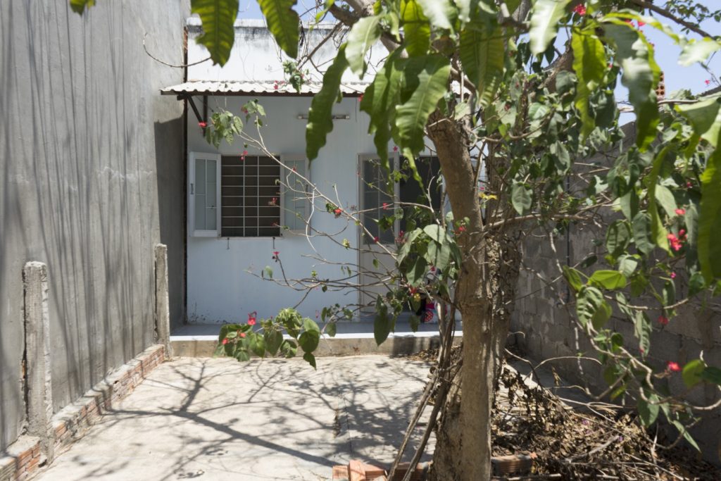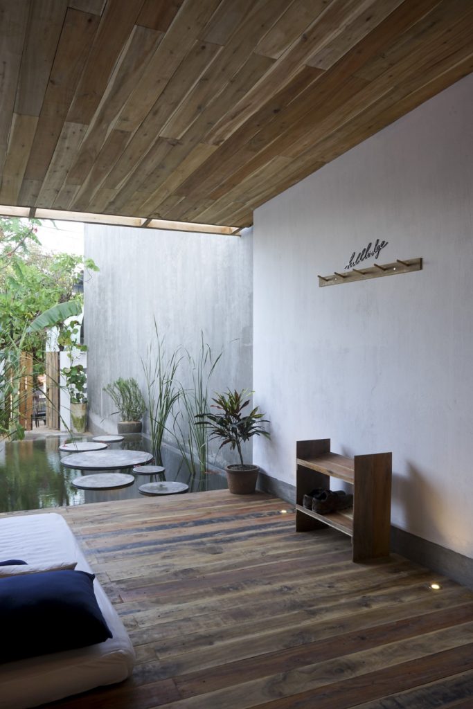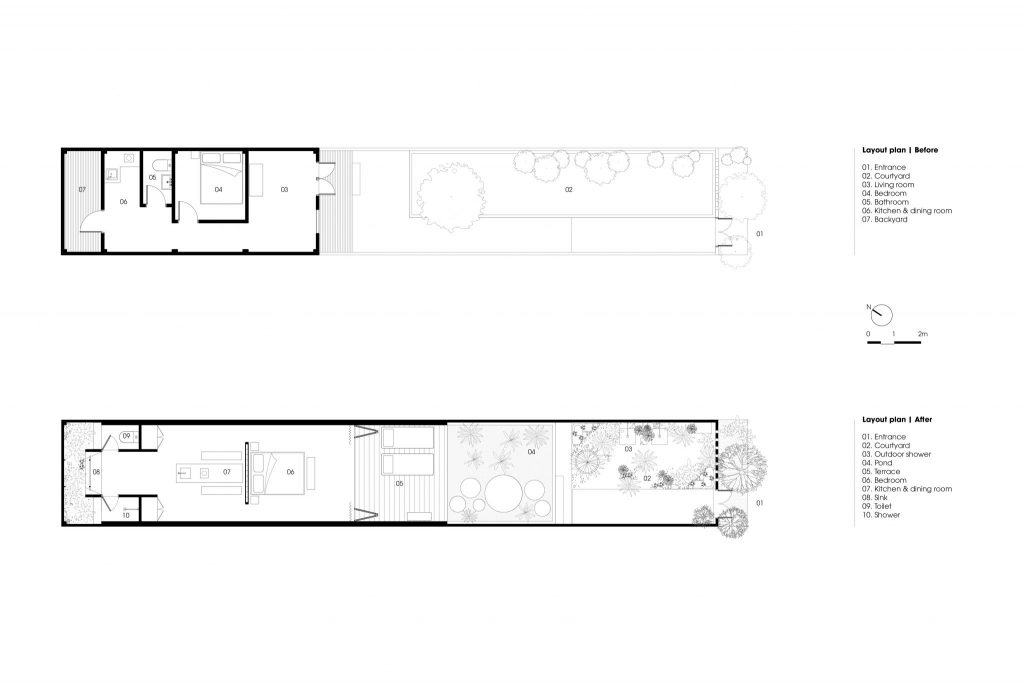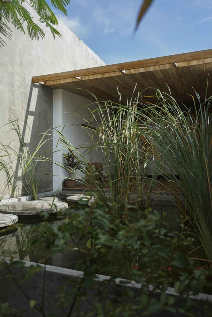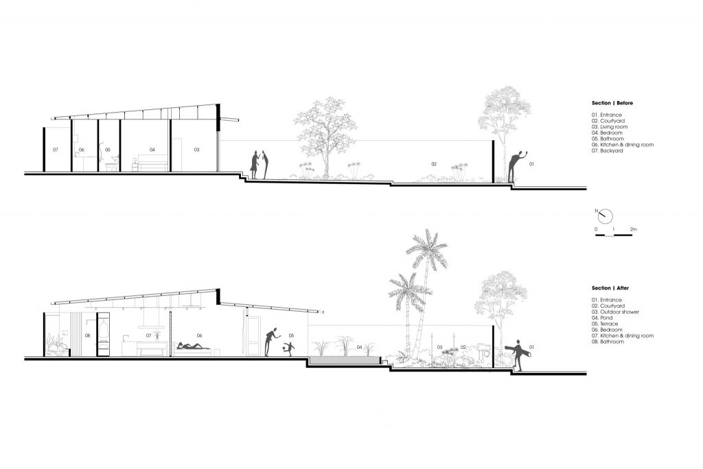 Phương án thiết kế là giữ lại khung nhà sẵn có gồm tường bao và mái, tổ chức các không gian chức năng bên trong và xây thêm một mái hiên rộng liên kết với cảnh quan bên ngoài.