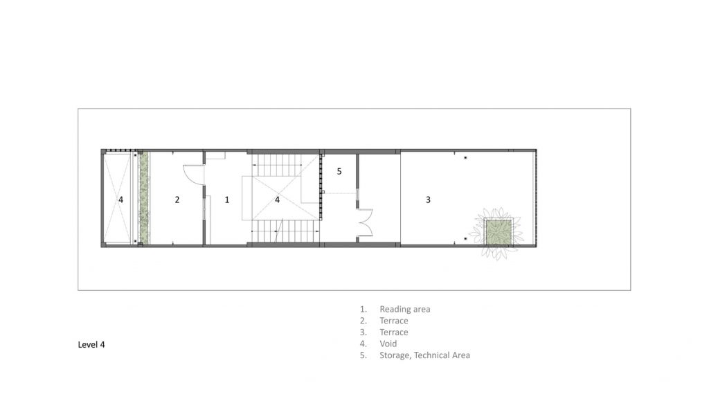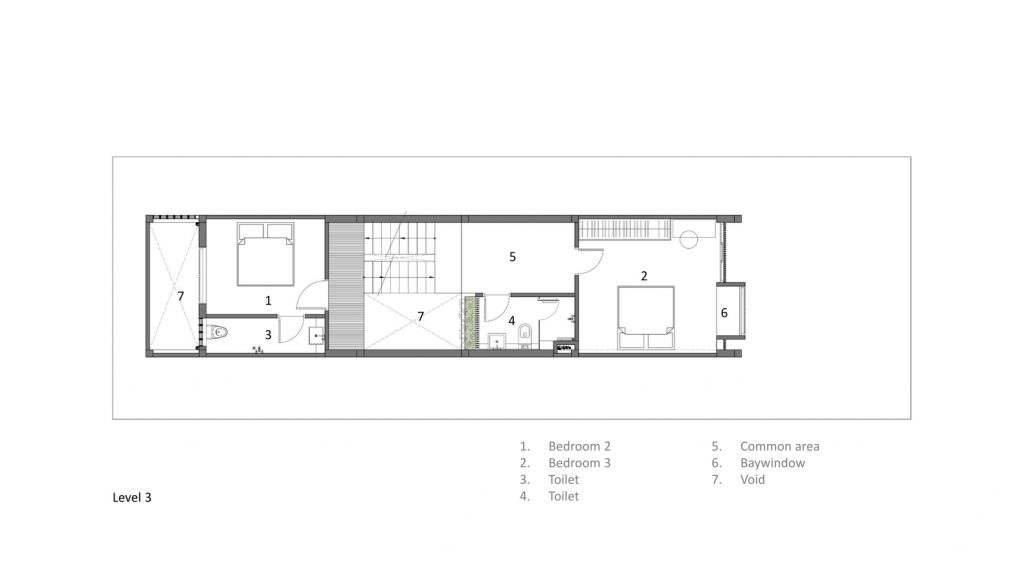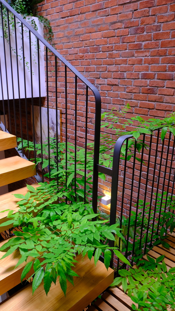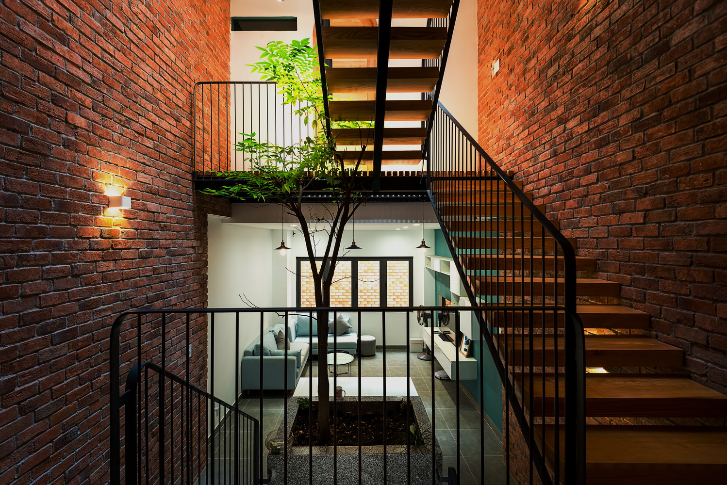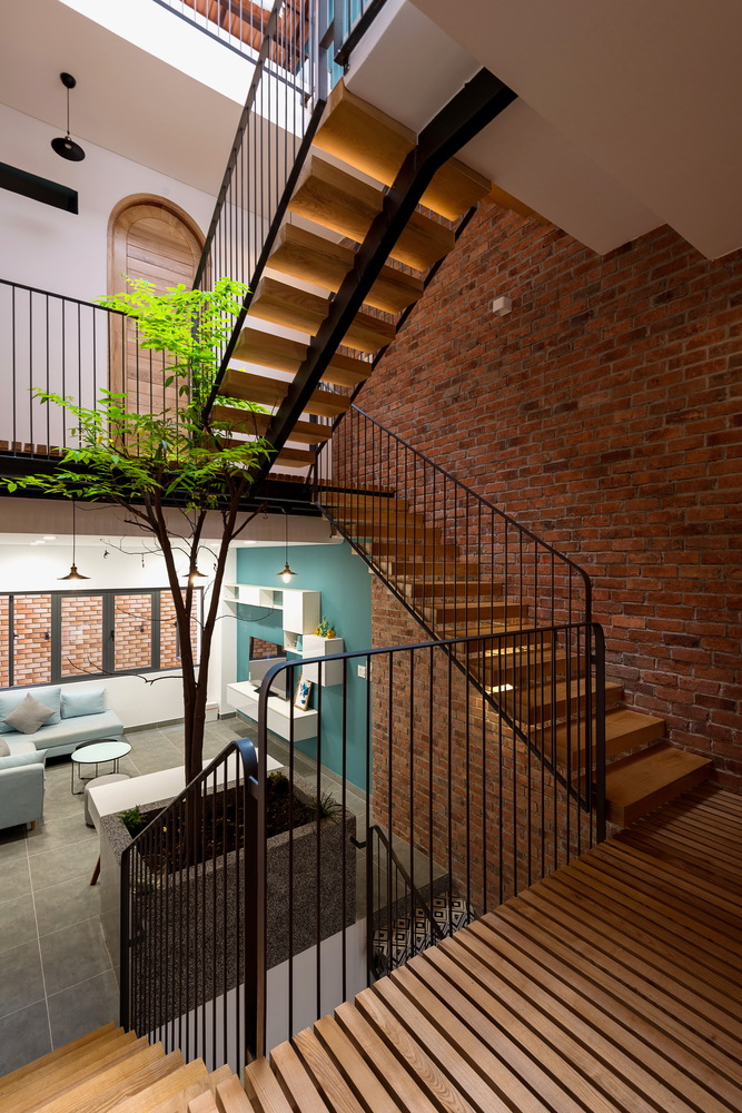 Tiêu chí là diện tích vừa đủ cho các phòng, gần 1/3 diện tích xây dựng được dùng chung cho giếng trời. Chất liệu bậc cầu thang là gỗ với kết cấu thép, chất liệu sàn hành lang là thanh gỗ, gạch đỏ cổ kính cho toàn bộ phần tường tại giếng trời, đây là không gian kết nối cho tất cả các khu vực trong nhà. Mọi người có thể giao tiếp với nhau thông qua khoảng trống này.