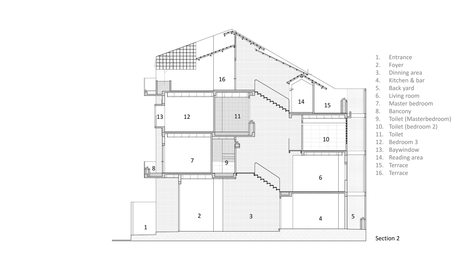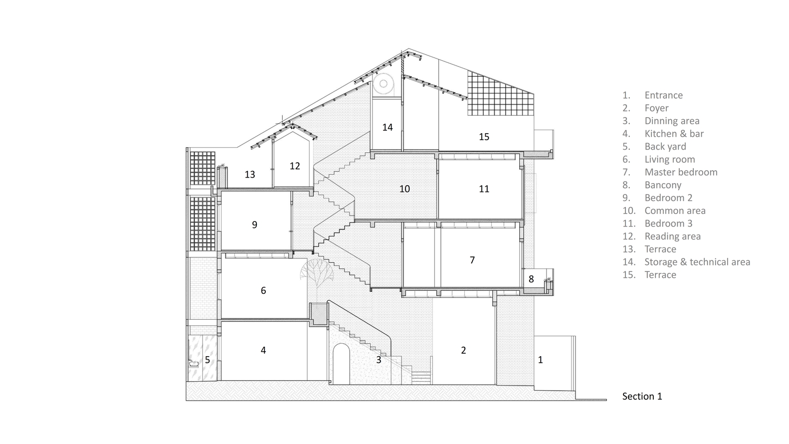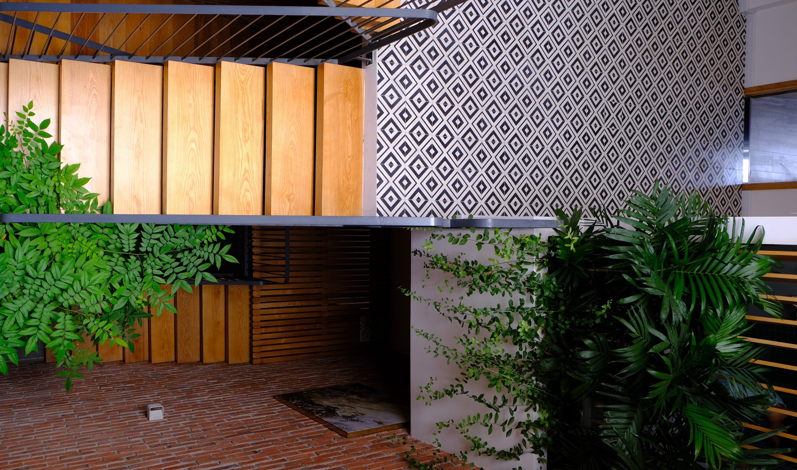 Tiêu chí là diện tích vừa đủ cho các phòng, gần 1/3 diện tích xây dựng được dùng chung cho giếng trời. Chất liệu bậc cầu thang là gỗ với kết cấu thép, chất liệu sàn hành lang là thanh gỗ, gạch đỏ cổ kính cho toàn bộ phần tường tại giếng trời, đây là không gian kết nối cho tất cả các khu vực trong nhà. Mọi người có thể giao tiếp với nhau thông qua khoảng trống này.