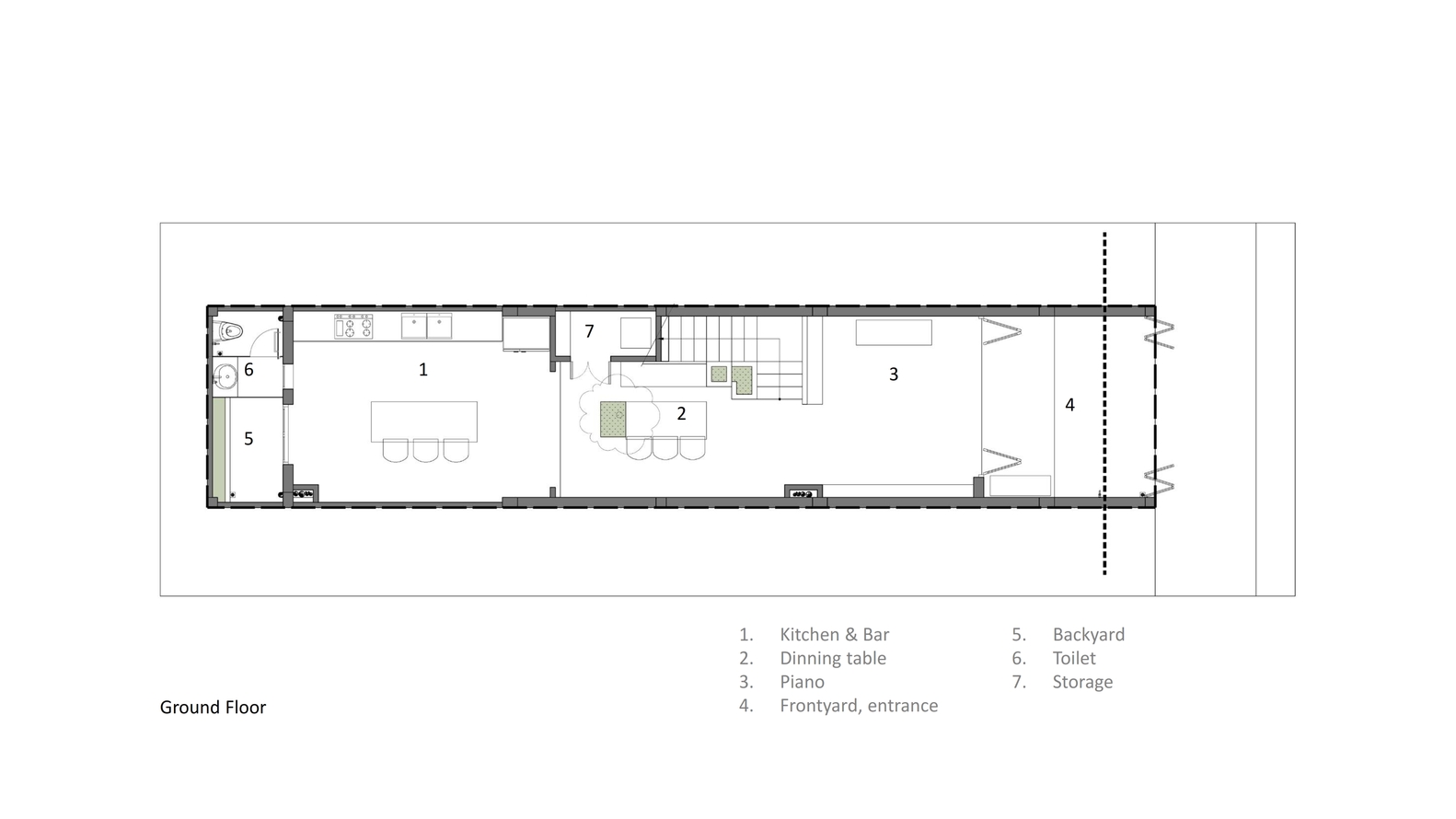 Tầng trệt bắt đầu với lối vào, không gian để đàn piano, khu vực chính là bếp và quầy bar phía sau nhà, bàn ăn được đặt tại khu vực giếng trời. Trong khi đó, phòng khách được đặt ở tầng lửng để giải phóng diện tích cho tầng trệt. Nơi đây có hướng nhìn ra cửa chính, phòng ngủ chính, diện tích này phù hợp với nhà lệch tầng, tạo thêm không gian sinh động trong ngôi nhà.