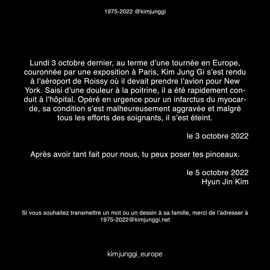 Trong chia sẻ mới nhất từ trang cá nhân chính thức, đại diện gia đình và cộng sự của Kim Jung Gi đã thông báo về cái chết bất ngờ và đáng tiếc của vị họa sĩ đại tài tại Paris.