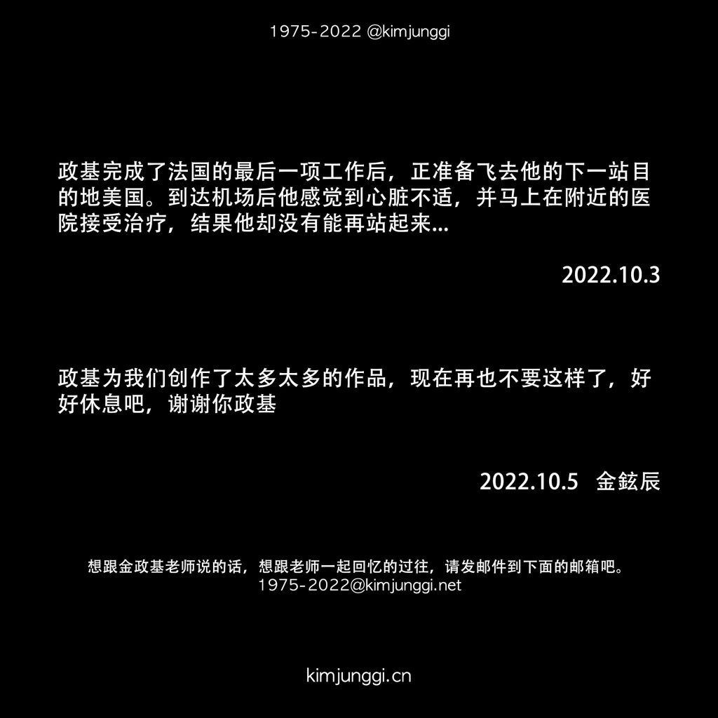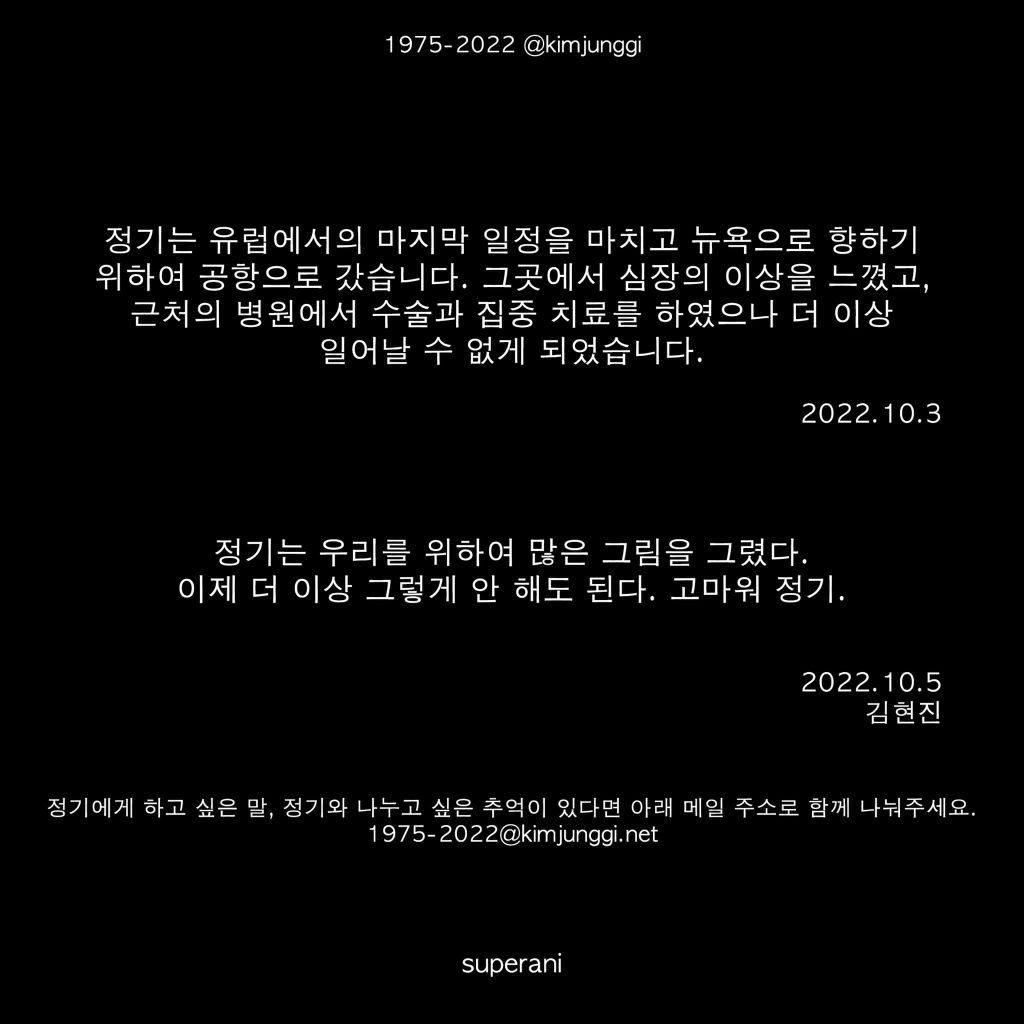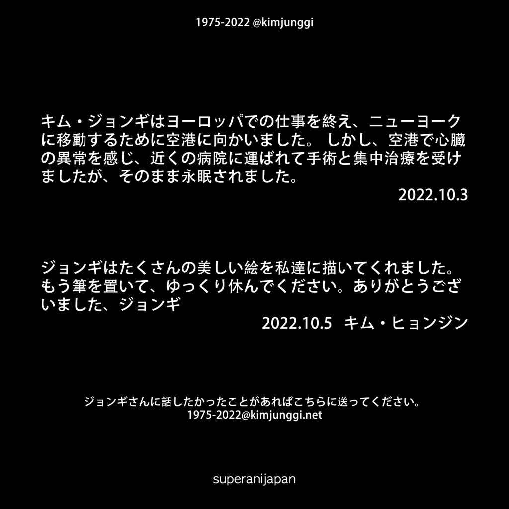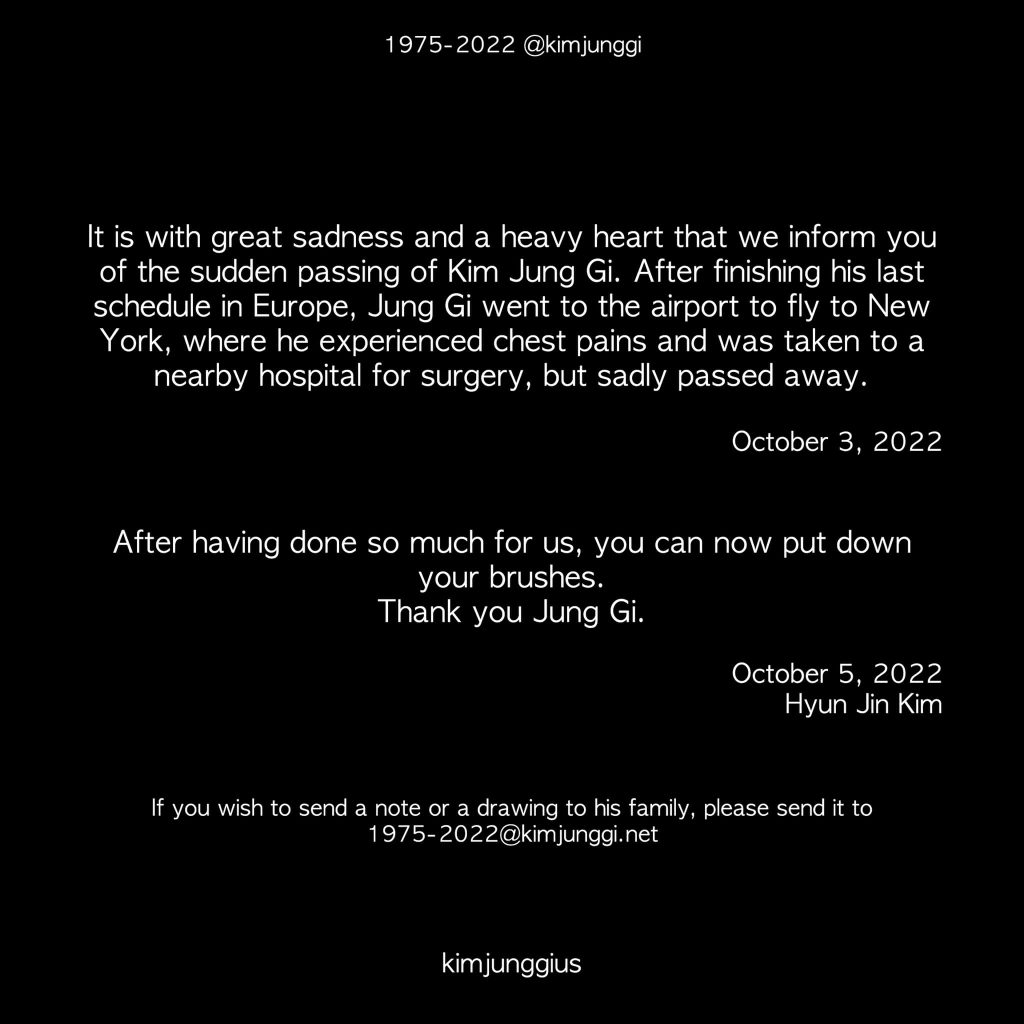 Theo chia sẻ: “Chúng tôi rất đau lòng khi phải thông báo đến với mọi người về việc Kim Jung Gi đã qua đời. Sau khi hoàn thành công việc tại châu Âu, ông đã lên đường để tiếp tục bay về New York, khi đó ông bắt đầu bị đau ngực và được chuyển ngay về bệnh viện để tiến hành mổ, nhưng đáng tiếc rằng ông đã không qua khỏi. Sau khi đã cống hiến cả đời mình cho chúng tôi, giờ đây ông đã có thể đặt bút xuống rồi. Cảm ơn Jung Gi vì tất cả”.