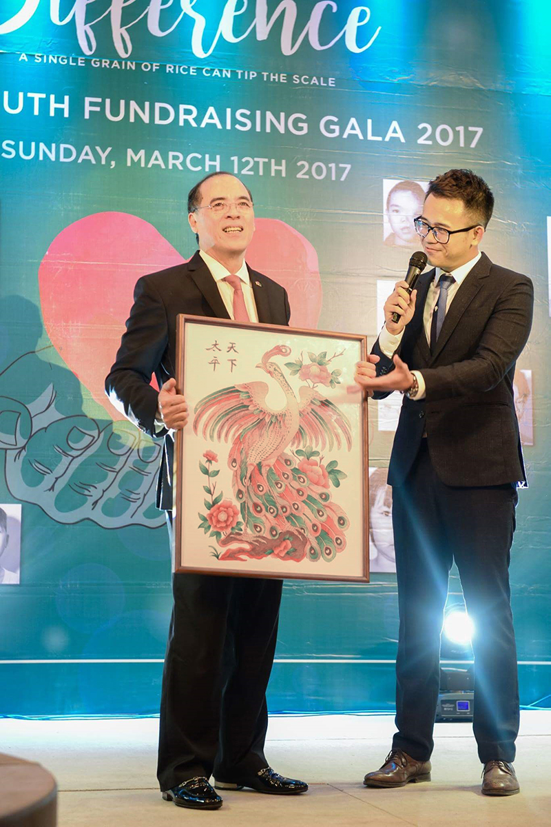Bác chủ tịch khách sạn Elegant Suites đã mua bức tranh “Thiên Hạ Thái Bình” của Xuân Lam với giá 50tr VNĐ để ủng hộ cho quỹ từ thiện Dartmouth