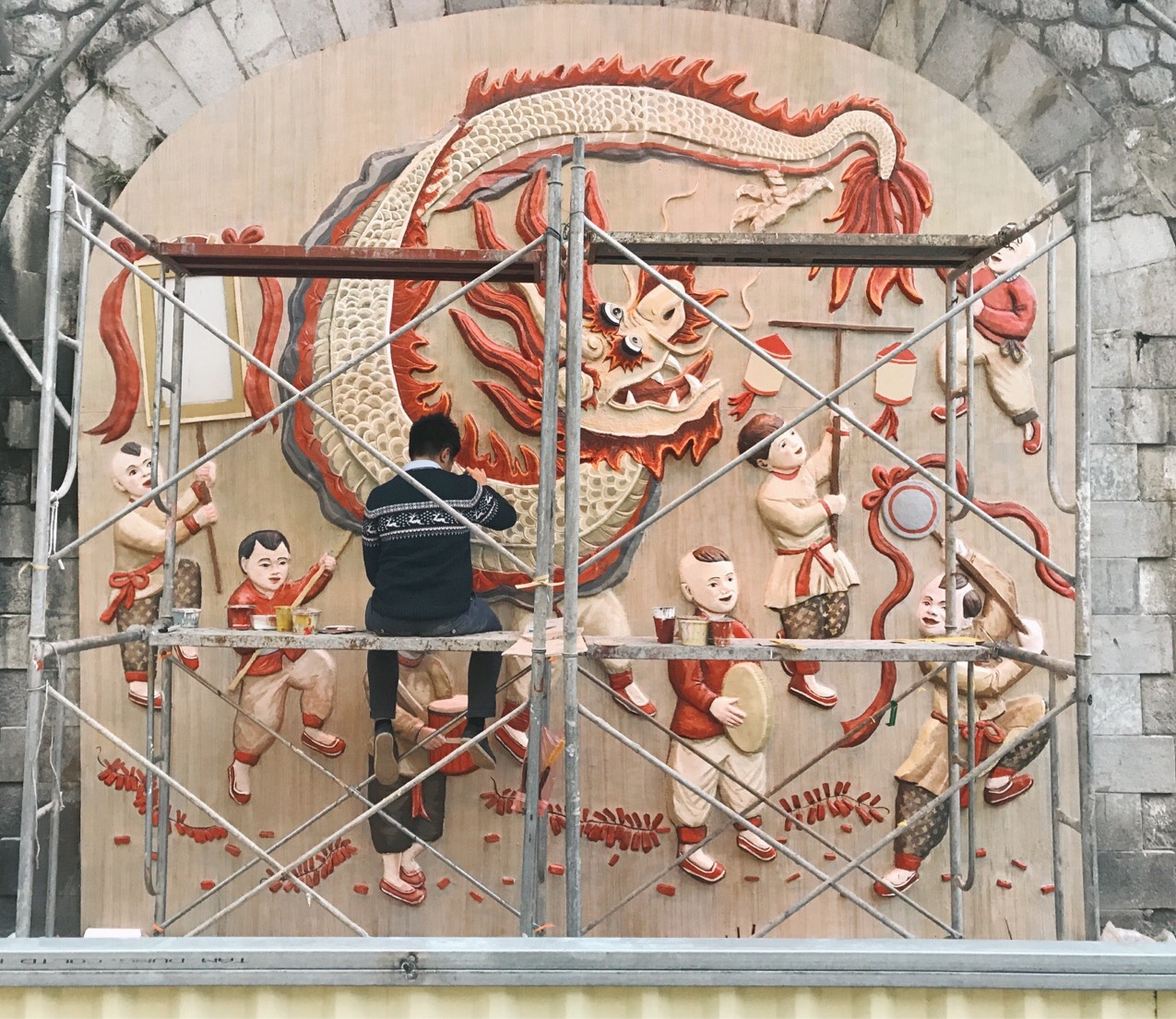 Tác phẩm phù điêu “Tuần Lễ Thời Trang Phố Cổ” trước và sau khi hoàn thành.