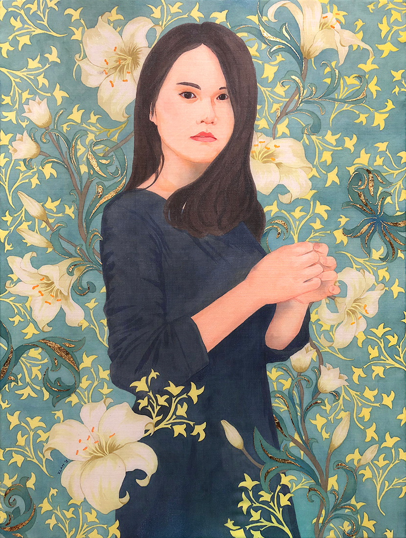 “Chân dung Ngọc mèo”, màu nước và vàng lá trên lụa, 60x 80cm, 2018