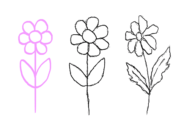 Nếu bạn muốn thế, thì không có bài hướng dẫn nào cho bạn. Bởi vì vẽ – sự sáng tạo – tức là để đôi tay bạn thả lỏng trong khi tập trung vào hiệu quả sau cùng thay vì tạo ra những đường nét hoàn hảo. Đó là điều bạn cần phải học – cách để thả lỏng, phác thảo nhanh và phóng khoáng. Chúng ta hãy thử vẽ bông hoa lại nào? Nhưng lần này theo những quy tắc đơn giản sau: