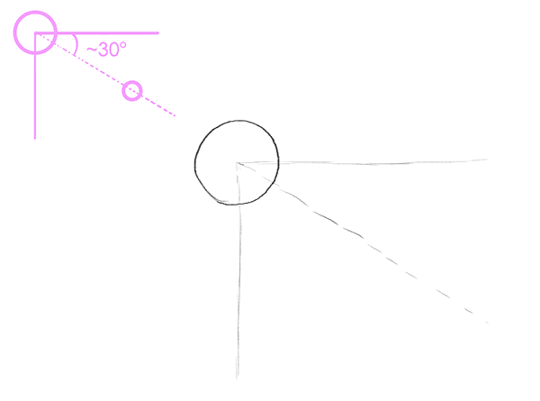 Giỡ hãy tưởng tượng hai đoạn thẳng vẽ từ tâm đường tròn. Tưởng tượng có một đường thẳng thứ 3 nối giữa hai đường tròn. Bạn có thể thấy nó tạo ra một góc gì? Vẽ đường nét này trên hình của bạn, không cần thêm hình tròn thứ hai bây giờ.Nếu bạn có vấn đề với các góc độ, hãy thử chia ba mỗi góc, sau đó chia ba lần nữa với mỗi góc một phần ba đó. Mỗi góc sẽ là 10 độ.