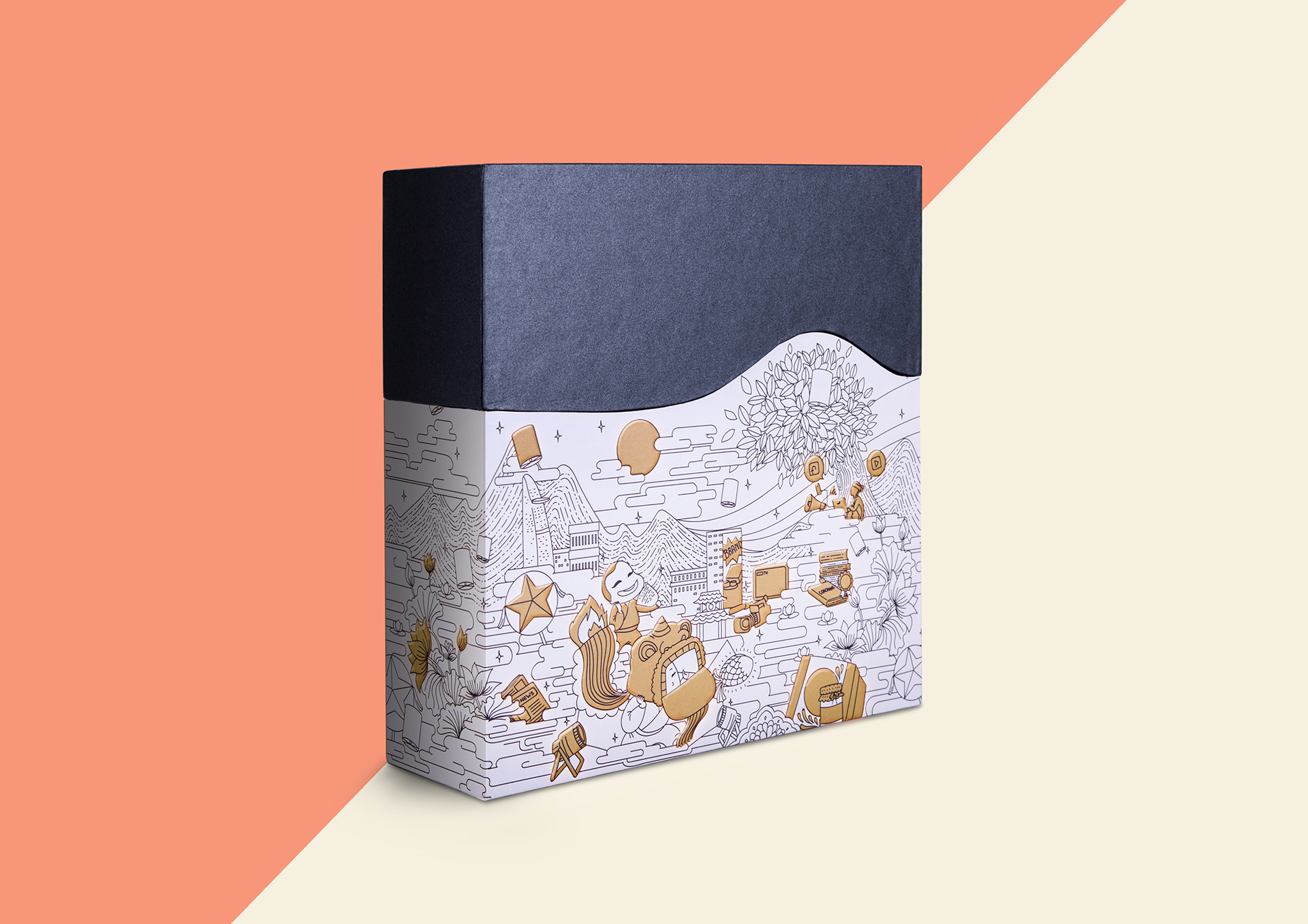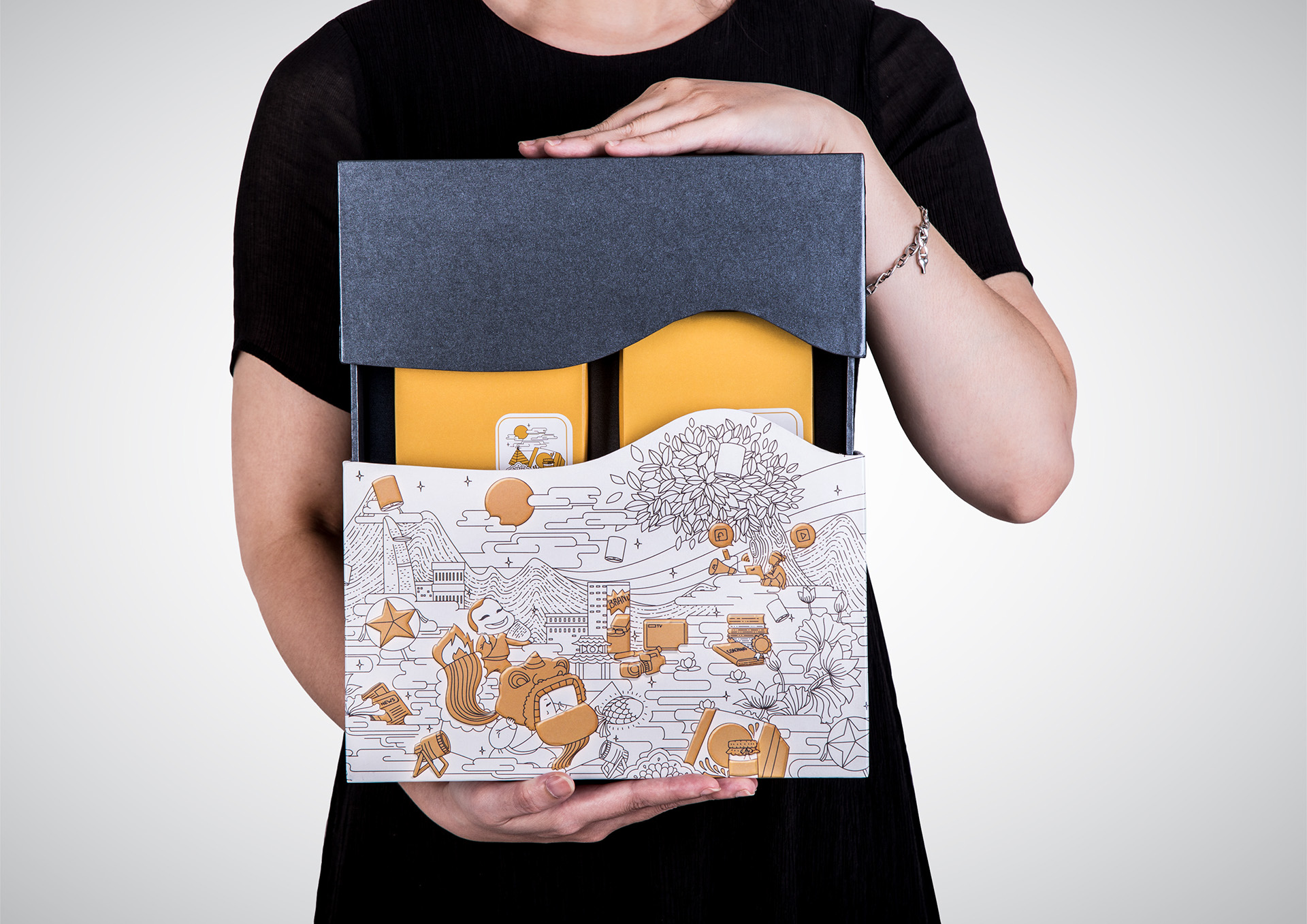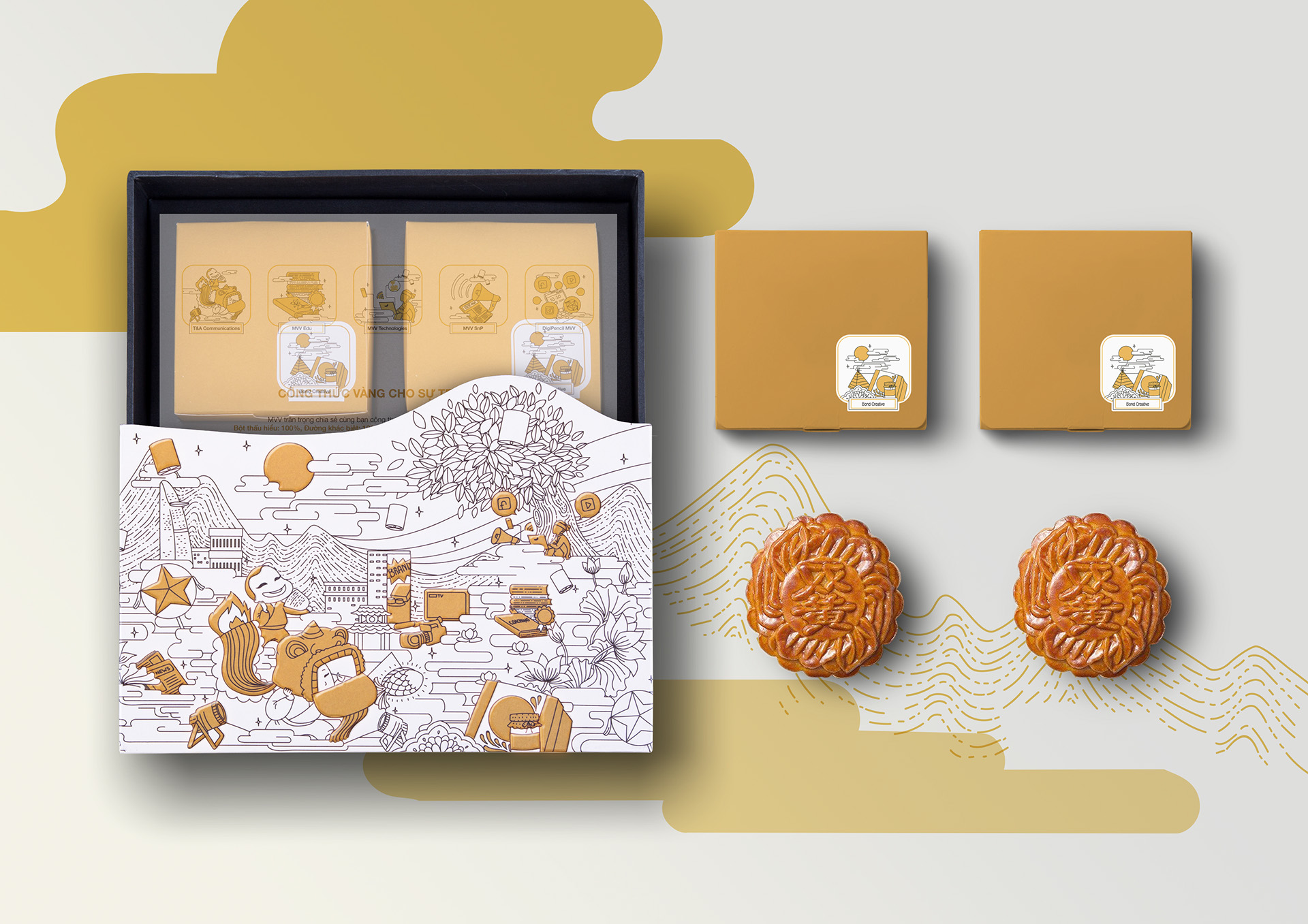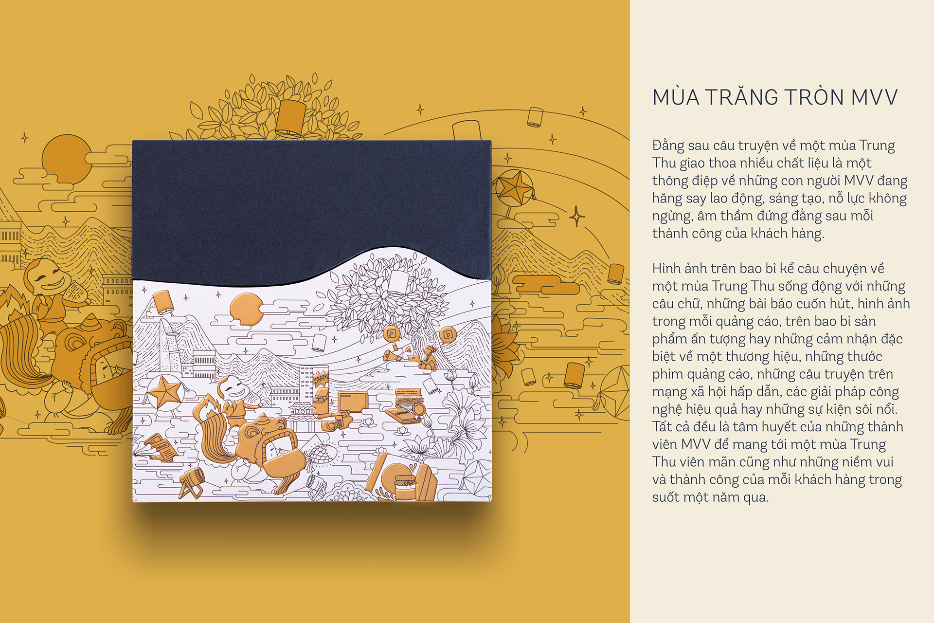 Khác với những hộp bánh thường thấy trên thị trường, thiết kế bao bì bánh Trung Thu MVV được tạo nên bởi phong cách vẽ minh họa cùng màu sắc đơn giản theo bộ nhận diện thương hiệu của MVV. Đồng thời trên bao bì, còn có nhưng chi tiết giàu bản sắc như hình ảnh ông địa, chú cuội, đèn ông sao, múa lân,… trên nền các phương tiện truyền thông hiện đại như Facebook, Youtube.