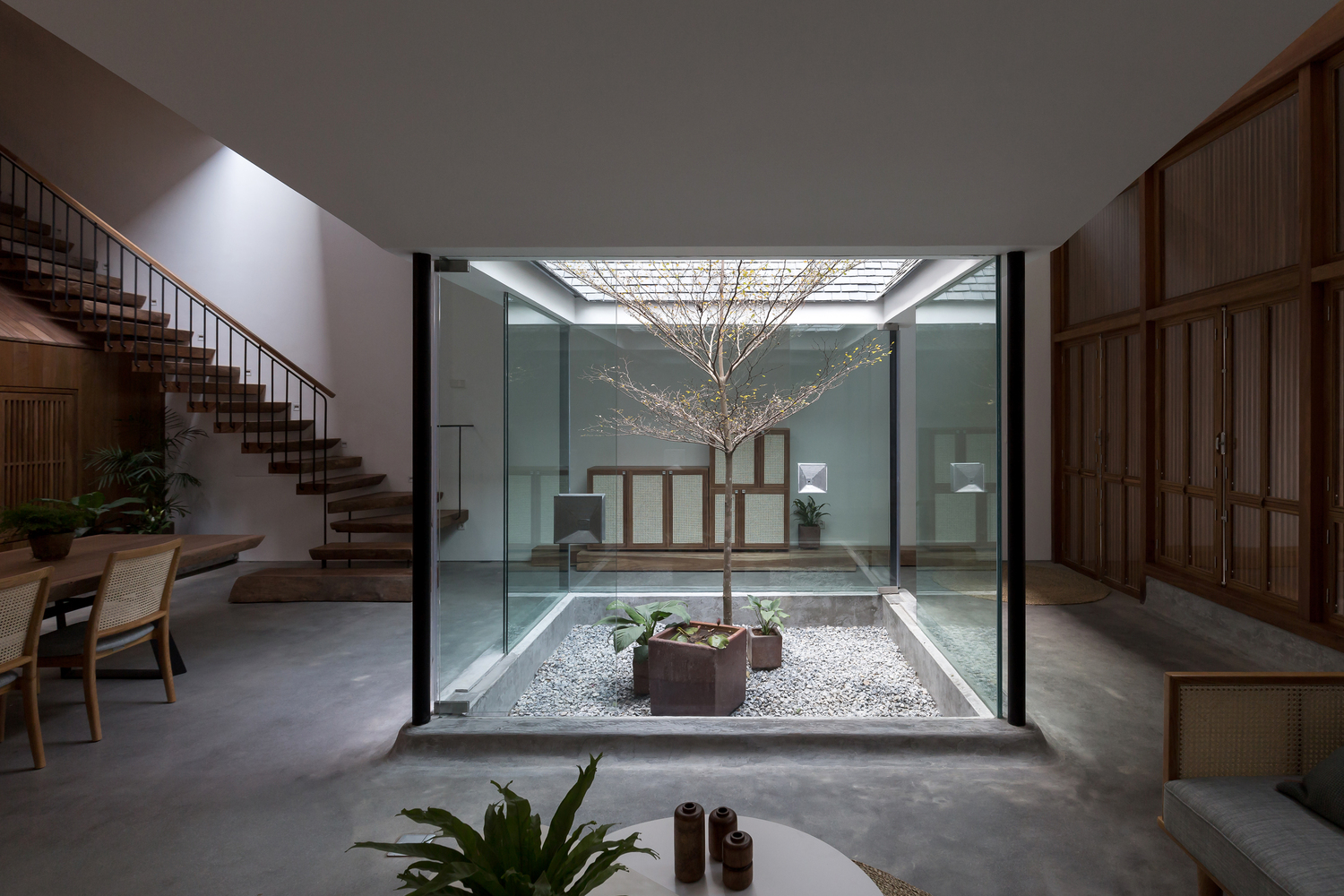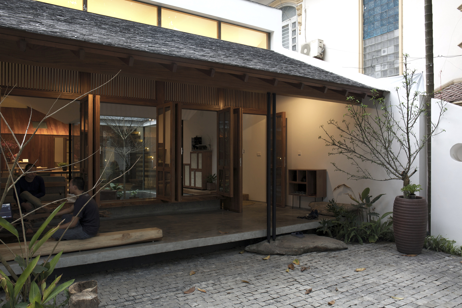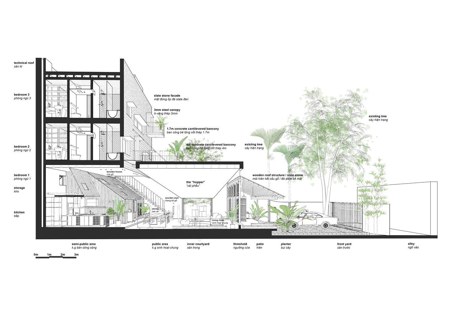 Hàng hiên, ngưỡng cửa, sân trong, mái nhà, tỷ lệ là những “thành phần” quý giá được chọn lọc từ truyền thống để hoàn toàn phù hợp với không gian đương đại của Hopper House. Nhóm KTS không sao chép các “thành phần” đó cho Hopper House, họ sử dụng chúng làm đầu vào để phân tích, sắp xếp và tạo ra thiết kế không gian và chức năng của ngôi nhà.