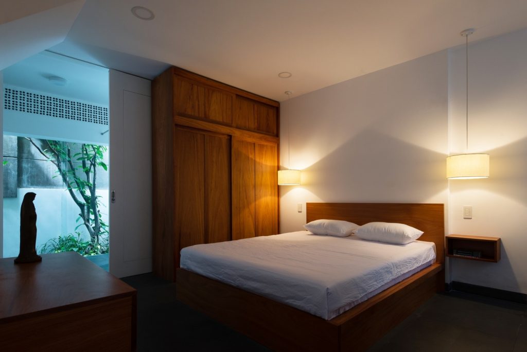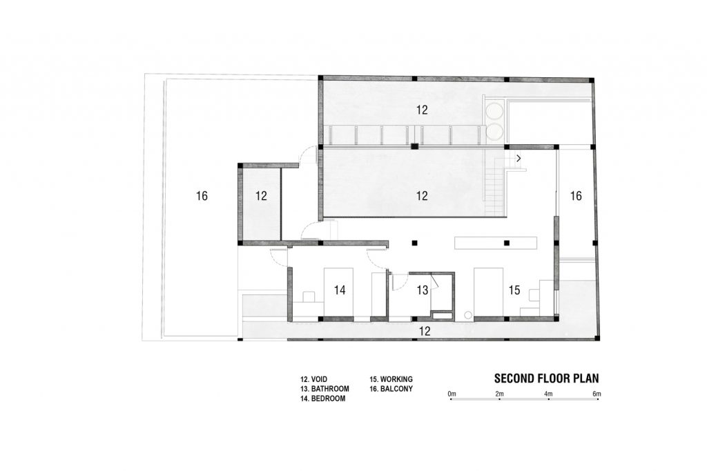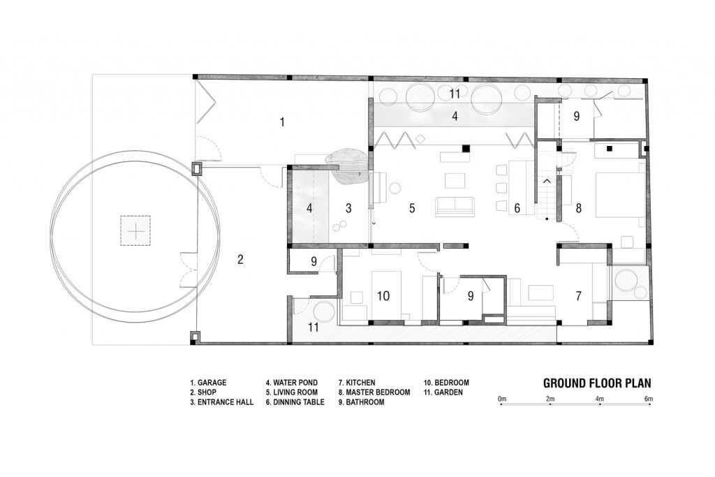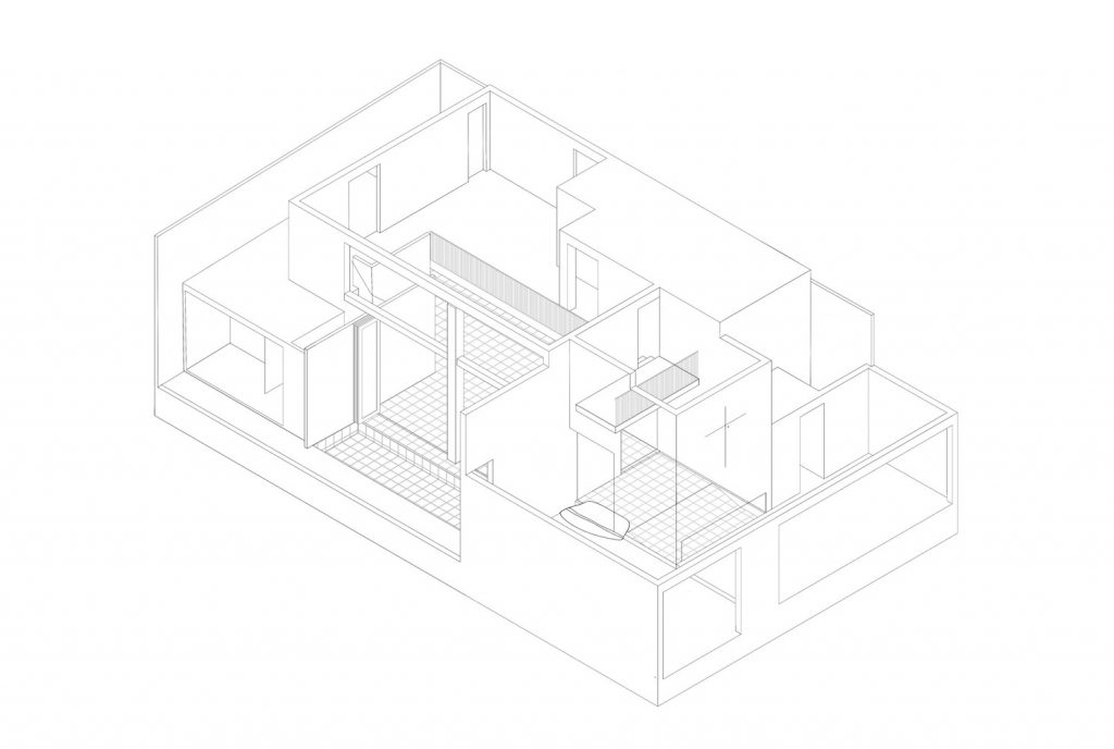 Một ngã rẽ đơn giản làm cho tầm nhìn đột nhiên được mở rộng. Hai khối chiều dọc được kết nối theo chiều ngang với khoảng thông tầng mở lớn ra hướng khu vườn ngoài trời. Các mảng tường được đặt một cách chiến lược để phân chia không gian thành các phòng chức năng. Sự đan xen hài hòa giữa bố cục theo chiều ngang với sự mở rộng theo chiều dọc làm tăng chiều sâu và cảm giác tự do về không gian. Ranh giới giữa nội và ngoại thất, không gian sống và sân vườn, dường như tan biến một cách khiêm tốn.
