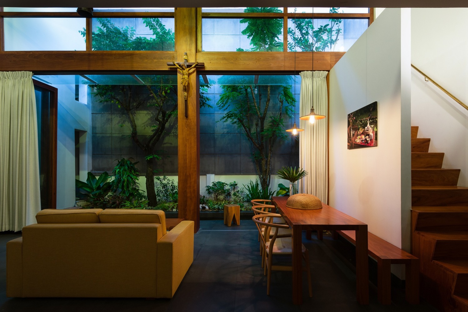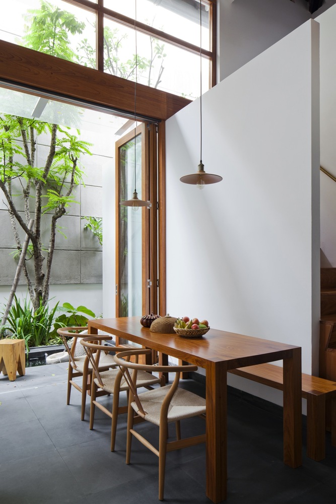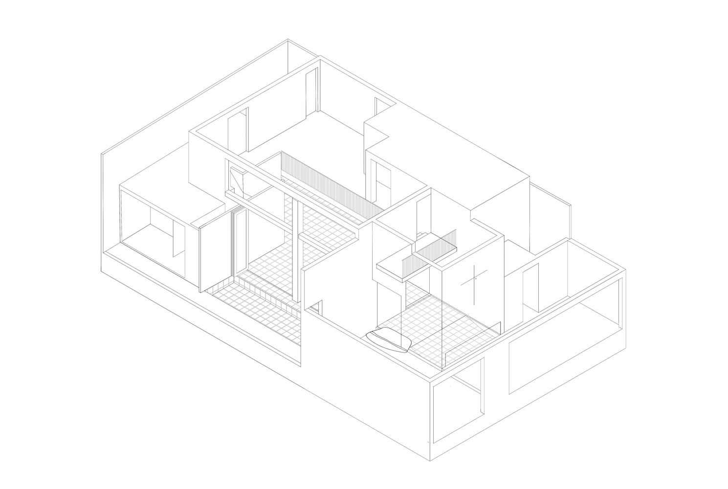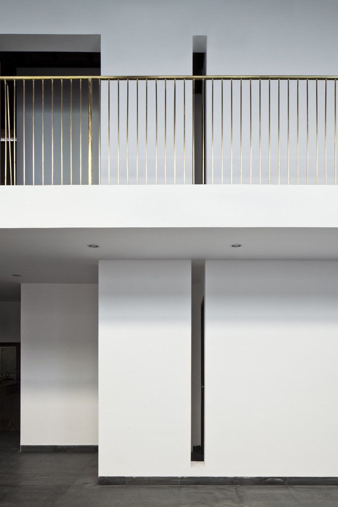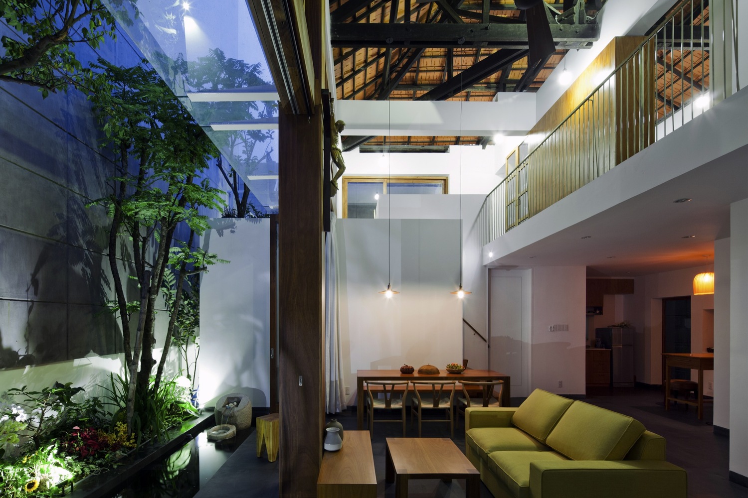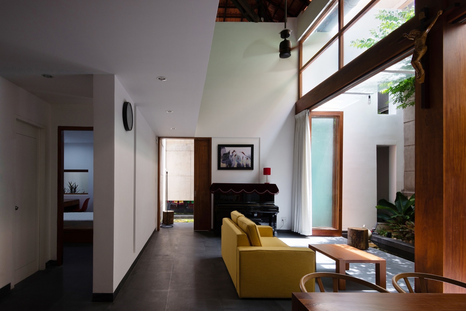 Một ngã rẽ đơn giản làm cho tầm nhìn đột nhiên được mở rộng. Hai khối chiều dọc được kết nối theo chiều ngang với khoảng thông tầng mở lớn ra hướng khu vườn ngoài trời. Các mảng tường được đặt một cách chiến lược để phân chia không gian thành các phòng chức năng. Sự đan xen hài hòa giữa bố cục theo chiều ngang với sự mở rộng theo chiều dọc làm tăng chiều sâu và cảm giác tự do về không gian. Ranh giới giữa nội và ngoại thất, không gian sống và sân vườn, dường như tan biến một cách khiêm tốn.