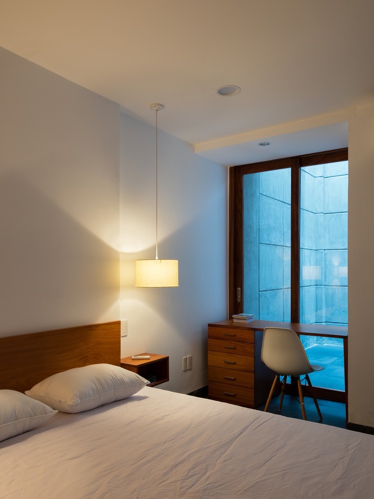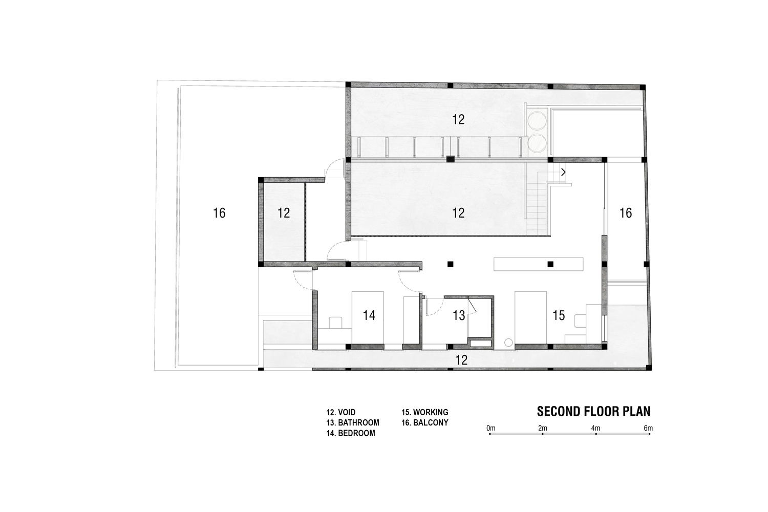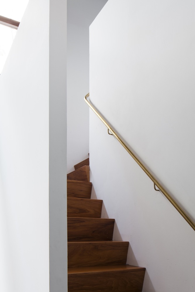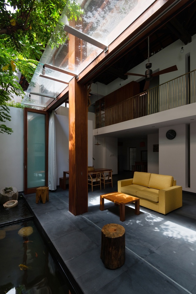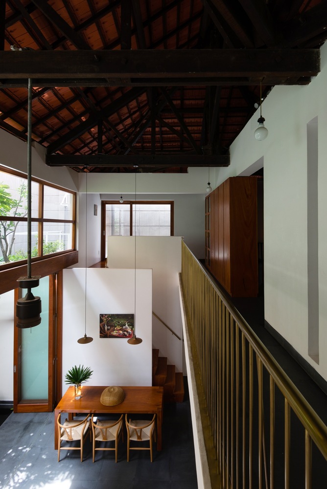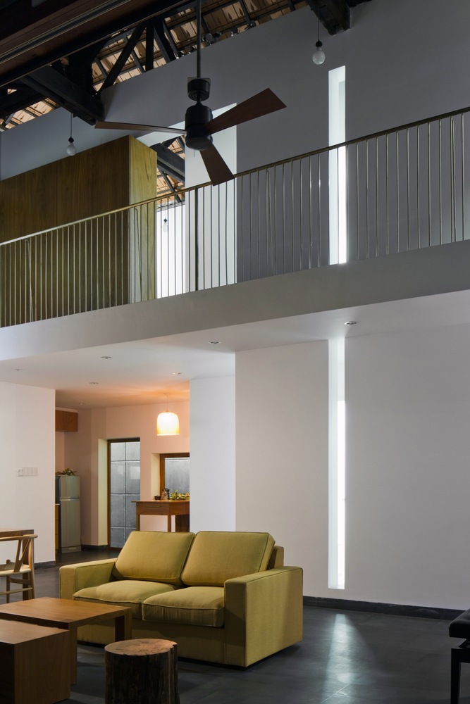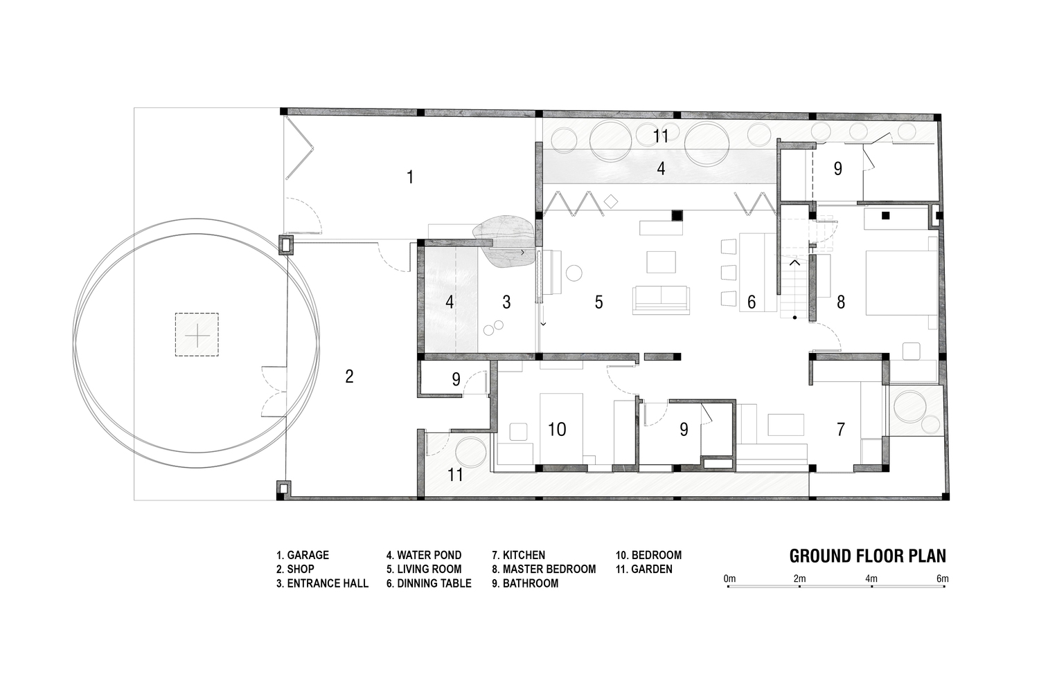 Một ngã rẽ đơn giản làm cho tầm nhìn đột nhiên được mở rộng. Hai khối chiều dọc được kết nối theo chiều ngang với khoảng thông tầng mở lớn ra hướng khu vườn ngoài trời. Các mảng tường được đặt một cách chiến lược để phân chia không gian thành các phòng chức năng. Sự đan xen hài hòa giữa bố cục theo chiều ngang với sự mở rộng theo chiều dọc làm tăng chiều sâu và cảm giác tự do về không gian. Ranh giới giữa nội và ngoại thất, không gian sống và sân vườn, dường như tan biến một cách khiêm tốn.