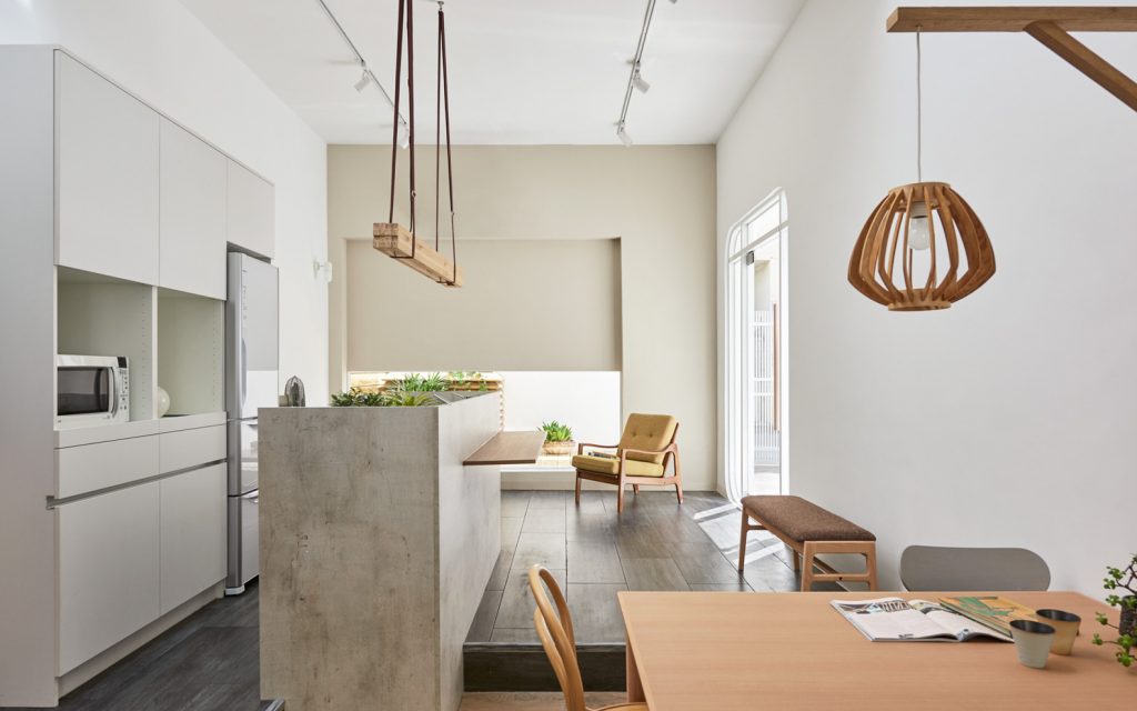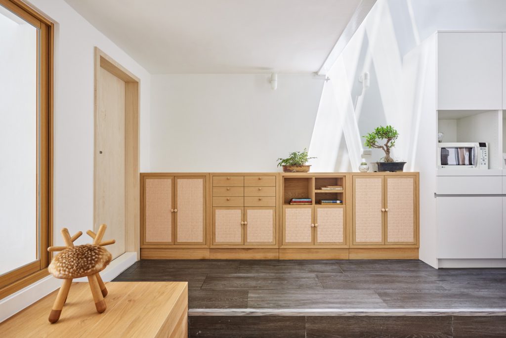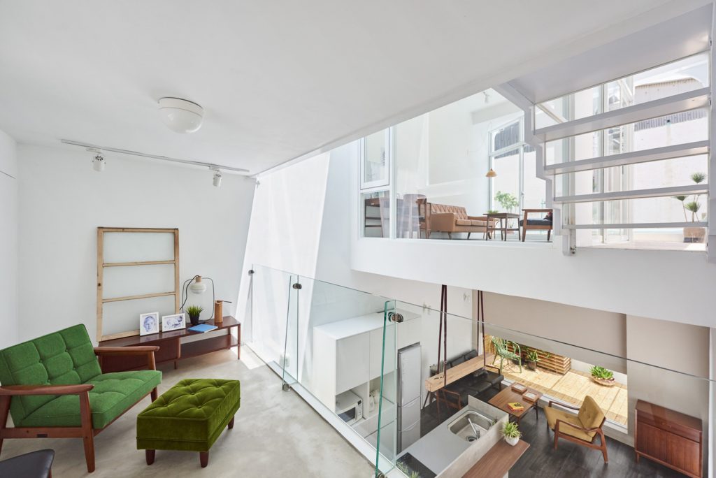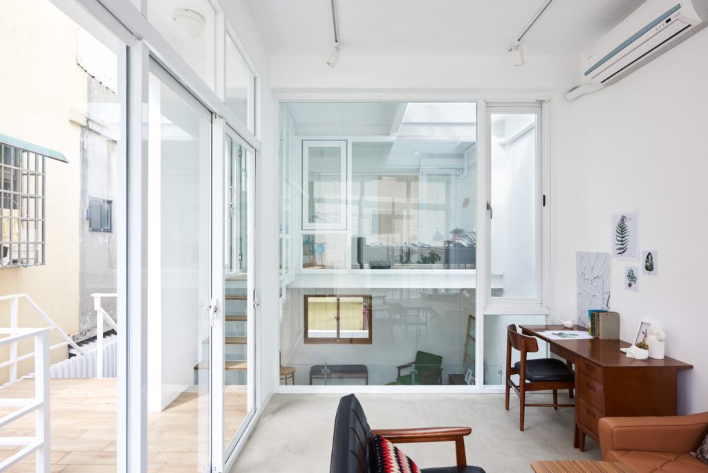 Sau đó, nhóm thiết kế đã mở rộng không gian bằng cách sử dụng kính cho phép ánh sáng xuyên qua tự do, do đó cải thiện khả năng tương tác. Để làm nổi bật các đặc điểm đẹp của nhà phố, chẳng hạn như vát tròn của cửa sổ, họ sử dụng màu trắng để tạo ra một không gian sạch sẽ, không lộn xộn để trưng bày đồ nội thất.