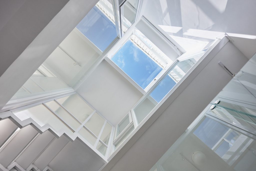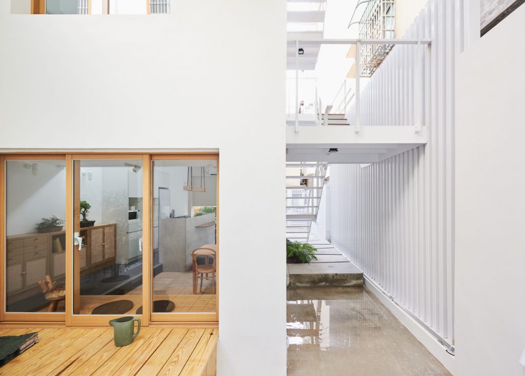 Đối với cầu thang, bây giờ chúng là thứ duy nhất kết nối các tầng riêng lẻ với nhau. Để thêm một cái gì đó mới cho việc leo lên và xuống cầu thang, họ thêm một góc nghiêng cho các cửa sổ phong cách Pháp trên tầng hai để mọi người sẽ bước lên một nền tảng hình tam giác khi di chuyển ra ngoài qua cầu thang bên ngoài. Điều này cũng tạo ra một mặt tiền sống động hơn. Con đường xuyên qua ngôi nhà được nối với nhau bằng cầu thang bên ngoài để người dân và du khách ra vào dễ dàng, tận hưởng sự thú vị khi khám phá tất cả các không gian khác nhau.