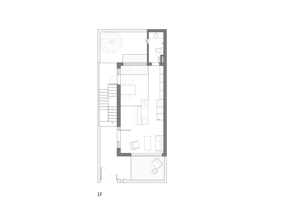 Tầng đầu tiên của tòa nhà là có diện tích khoảng 36 mét vuông. Với mặt tiền hẹp, bên trong không cho nhiều ánh sáng, che khuất vẻ ngoài đẹp đẽ của tòa nhà. Kiến trúc sư đã cho tháo cầu thang bên trong, các cửa sổ bằng sắt đối diện với đường phố và lán kim loại (là một nhà bếp) được thêm vào phía sau của tầng một. Họ đã tạo ra không gian bằng cách thêm cầu thang bên ngoài và một khoảng sân, để cho ngôi nhà cũ lấy lại phong cách và nét duyên dáng ban đầu.