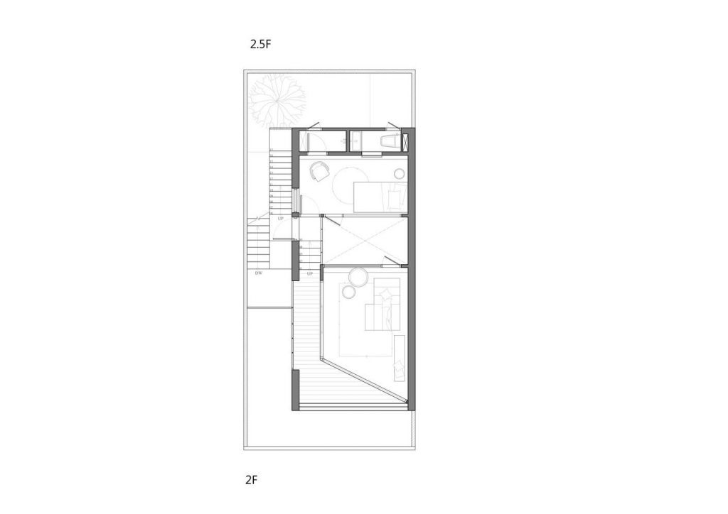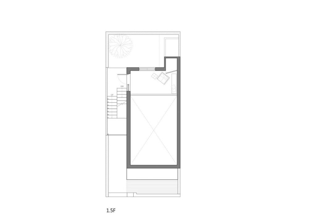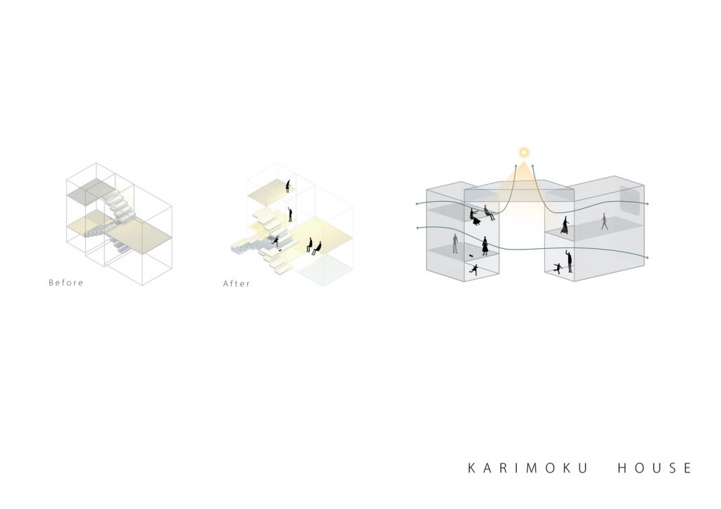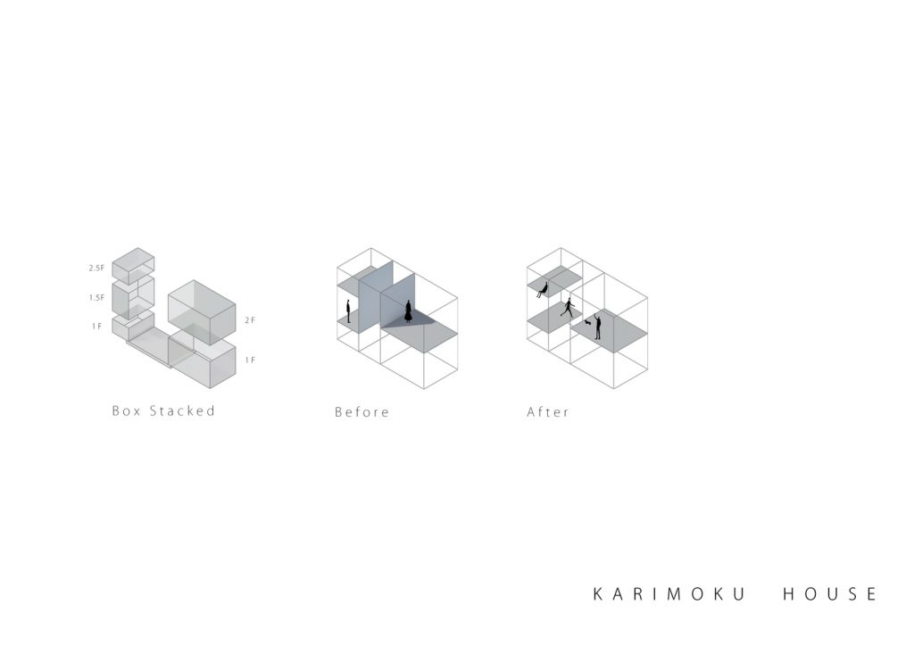 Không gian ban đầu được chỉ định là một phòng thu và không gian triển lãm cho đồ nội thất Nhật Bản, nhưng do sơ đồ tầng, ba phòng của tòa nhà được ngăn cách bởi các bức tường vững chắc và bị chặn bởi cầu thang. Toàn bộ không gian bị phân mảnh và không mạch lạc. Vì vậy, họ loại bỏ các bức tường ngăn cách các tầng so le và di chuyển cầu thang ra bên ngoài để mở rộng không gian bên trong của cấu trúc để ánh sáng từ sân có thể đi vào.
