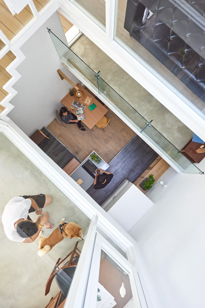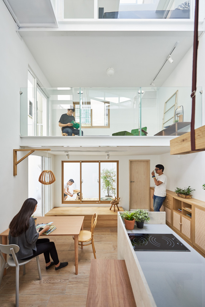Sau đó, nhóm thiết kế đã mở rộng không gian bằng cách sử dụng kính cho phép ánh sáng xuyên qua tự do, do đó cải thiện khả năng tương tác. Để làm nổi bật các đặc điểm đẹp của nhà phố, chẳng hạn như vát tròn của cửa sổ, họ sử dụng màu trắng để tạo ra một không gian sạch sẽ, không lộn xộn để trưng bày đồ nội thất.