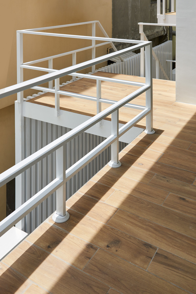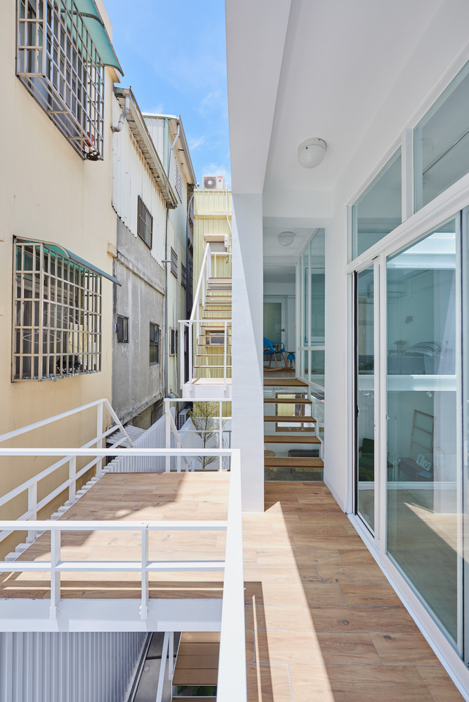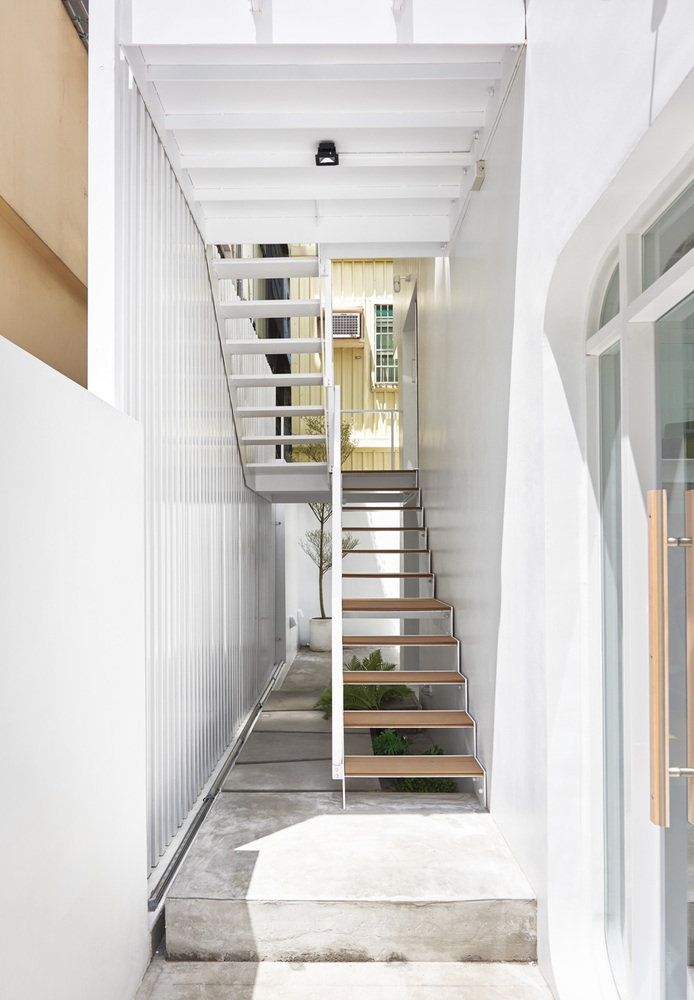 Đối với cầu thang, bây giờ chúng là thứ duy nhất kết nối các tầng riêng lẻ với nhau. Để thêm một cái gì đó mới cho việc leo lên và xuống cầu thang, họ thêm một góc nghiêng cho các cửa sổ phong cách Pháp trên tầng hai để mọi người sẽ bước lên một nền tảng hình tam giác khi di chuyển ra ngoài qua cầu thang bên ngoài. Điều này cũng tạo ra một mặt tiền sống động hơn. Con đường xuyên qua ngôi nhà được nối với nhau bằng cầu thang bên ngoài để người dân và du khách ra vào dễ dàng, tận hưởng sự thú vị khi khám phá tất cả các không gian khác nhau.