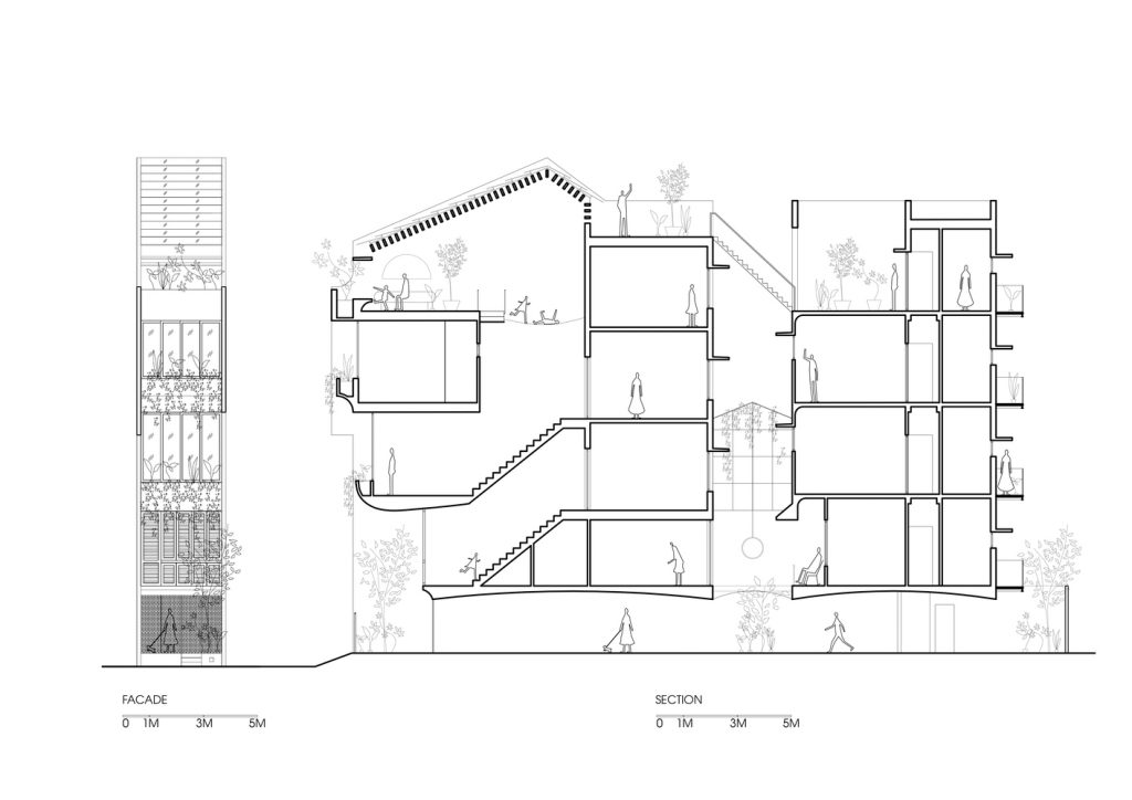 / House được coi là một “Không gian chứa đựng”: không gian rộng lớn có nhiều ngôi nhà nhỏ hơn bên trong. Nơi đây chứa đựng hầu hết các hoạt động của các thế hệ trong gia đình. Mỗi phòng là một ngôi nhà xếp theo chiều dọc như một tổ hợp nhỏ. Tạo ra “Không gian chứa đựng” là để kết nối các gia đình nhỏ của gia đình lớn, cũng như nuôi dưỡng và chứa đựng tất cả những thay đổi của chức năng sau đó theo thời gian.