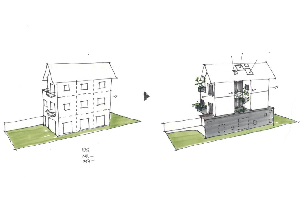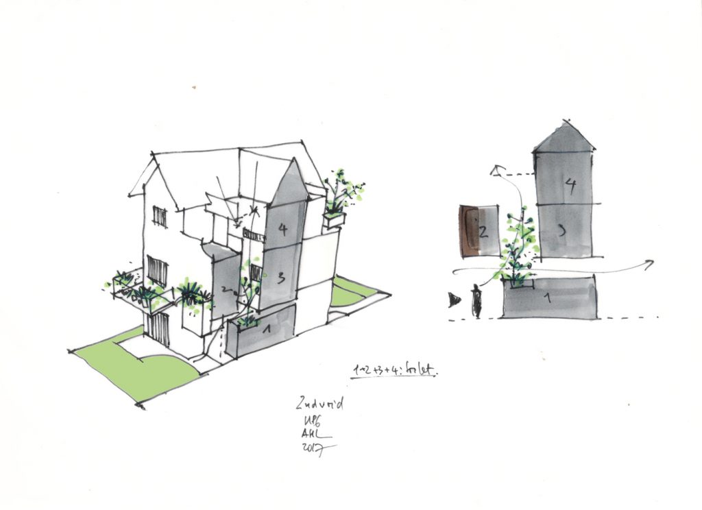 Giải pháp KTS đưa ra là cần tạo nhiều hơn hai hướng cho không gian của ngôi nhà. Một khoảng trống ở trung tâm ngôi nhà được cơi nới, nâng lên để làm sân trong, nơi đặt hệ thống phòng ngủ với góc nhìn, khoảng lấy sáng, thông gió và tạo không gian riêng tư. Hệ thống cửa sổ hiện tại quay sang nhà hàng xóm không còn giá trị, bị chặn cũng không sao.