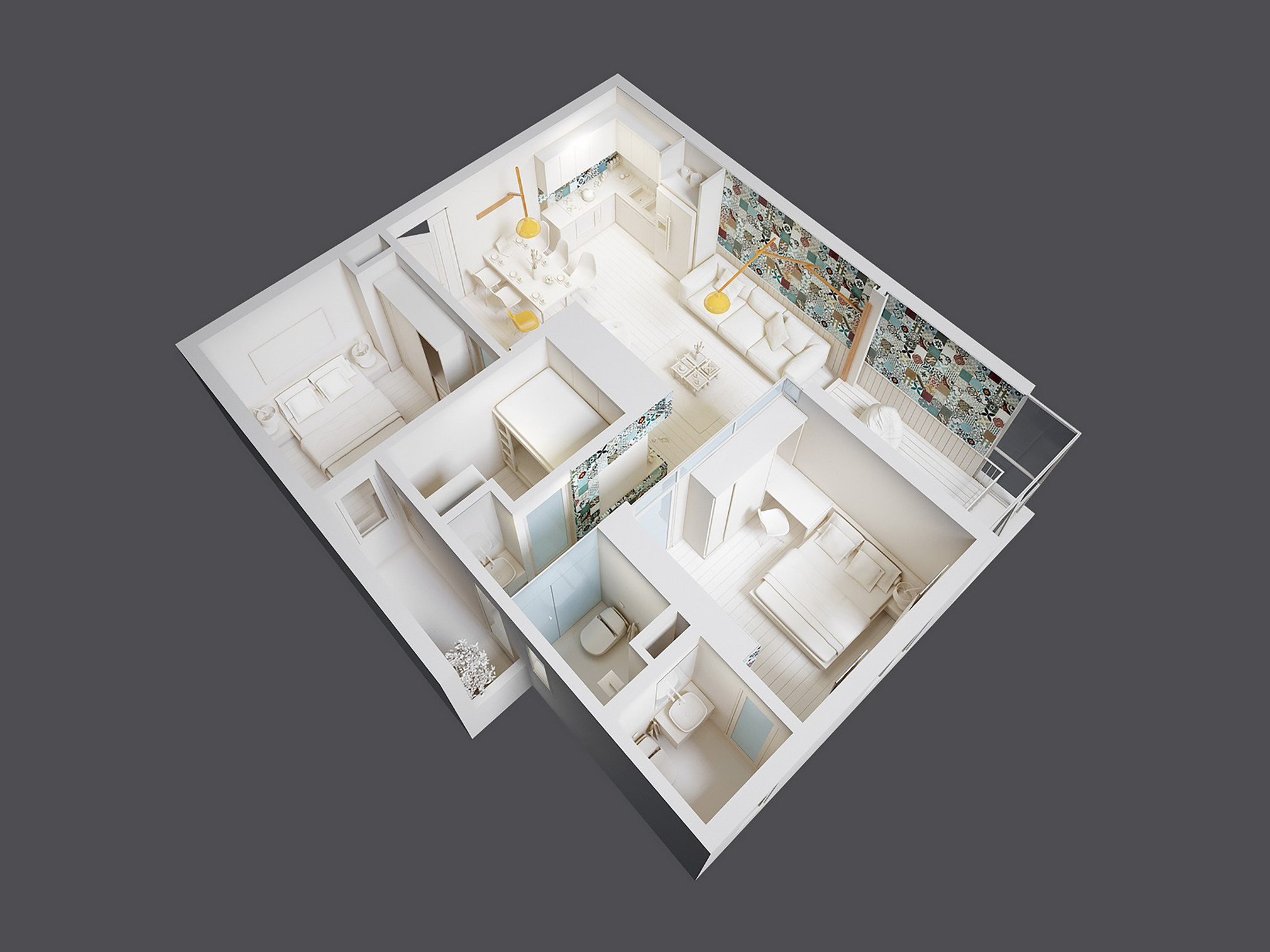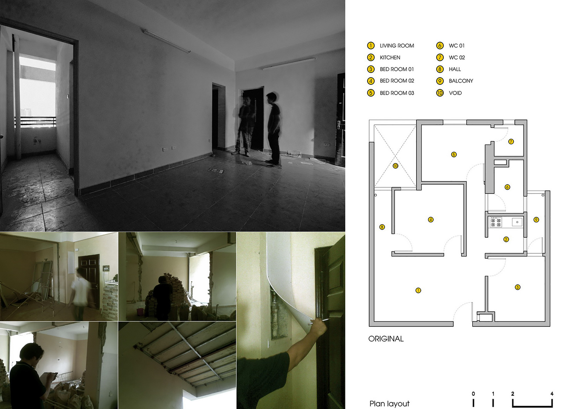 Căn hộ được thiết kế và sửa đổi để cho một cặp vợ chồng trẻ + 1 con nhỏ + ông bà sinh sống. Mặt bằng hiện trạng gồm 3 phòng ngủ với diện tích gần như bằng nhau, phòng bếp được bố trí độc lập. Không gian phòng khách nhỏ và hầu như không có ánh sáng, thông gió kém.