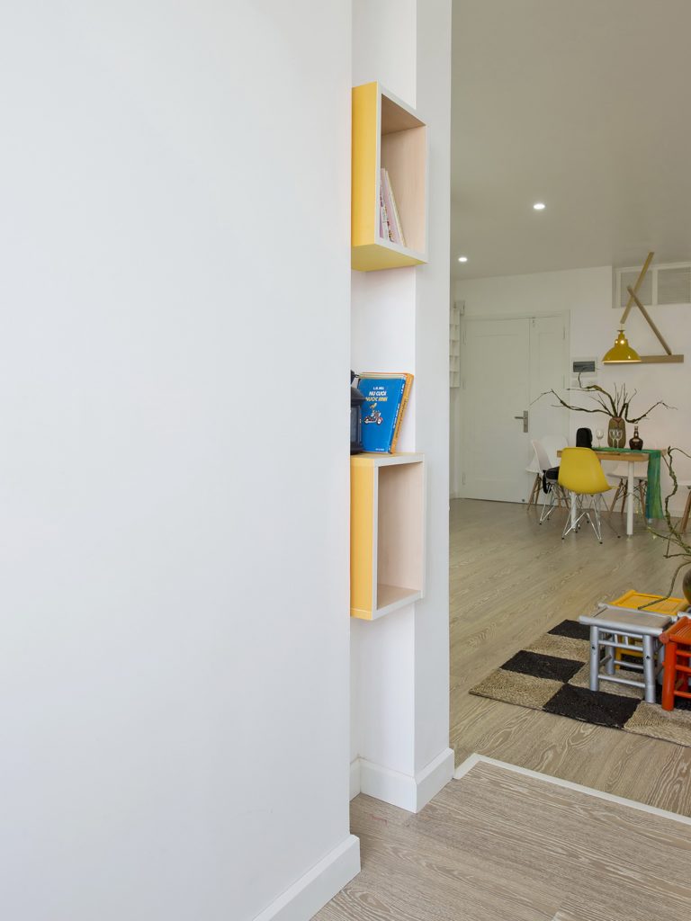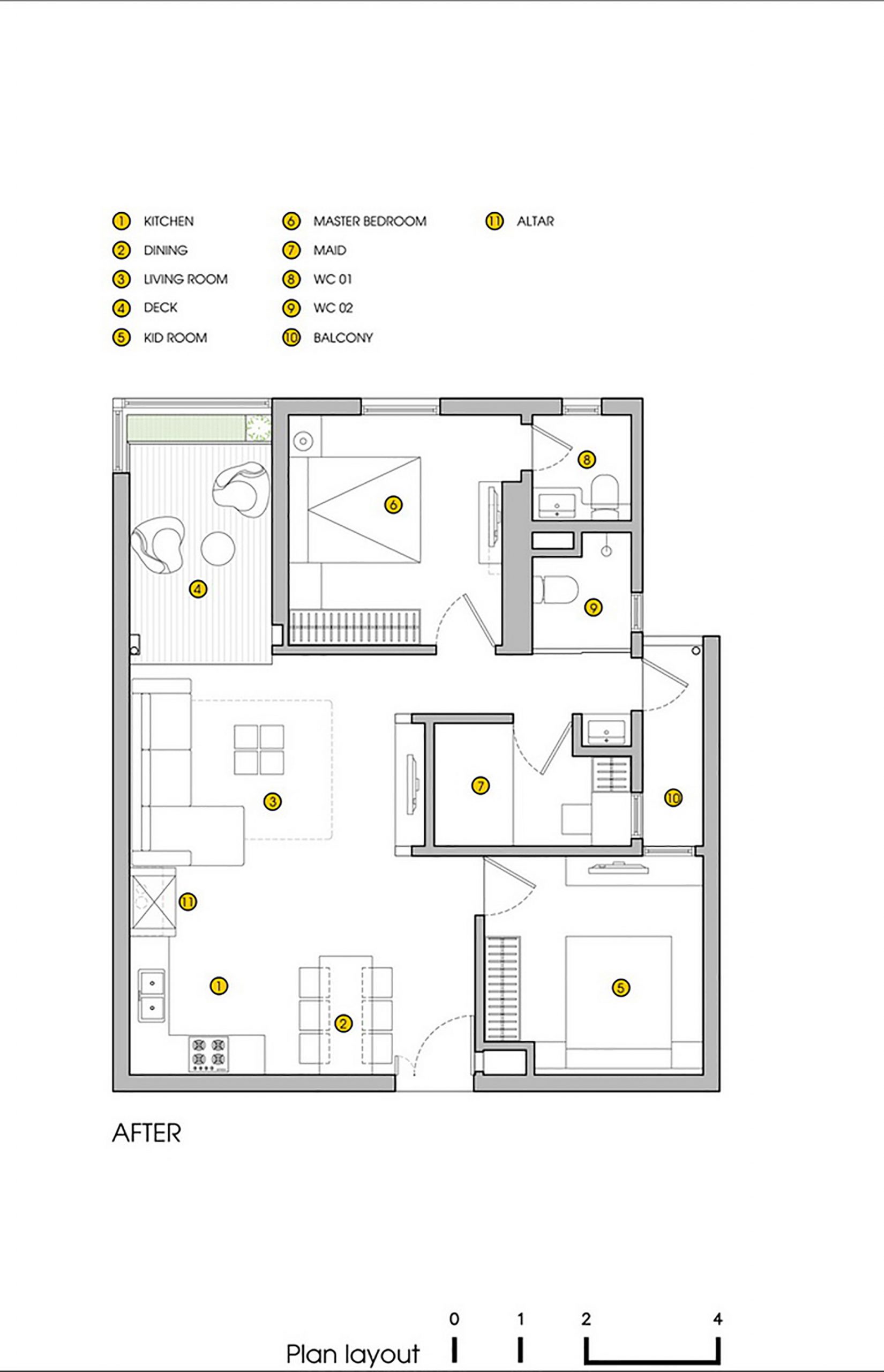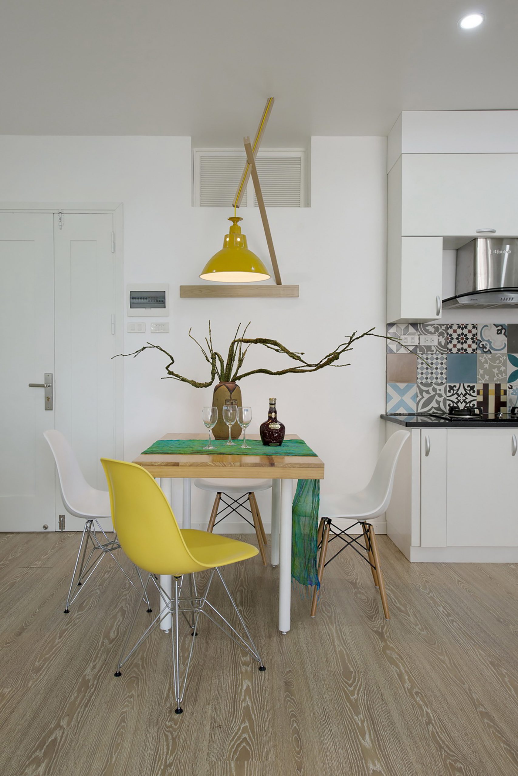 KTS đã phá bỏ một phòng ngủ ở trung tâm căn hộ để tạo thành không gian chung (phòng khách + phòng ăn + bếp + hiên), bốn không gian có thể “mượn” diện tích giao thông để tạo ra sự liên hoàn các chức năng khác nhau của các phòng thành một không gian rộng lớn với thông gió và ánh sáng tốt.