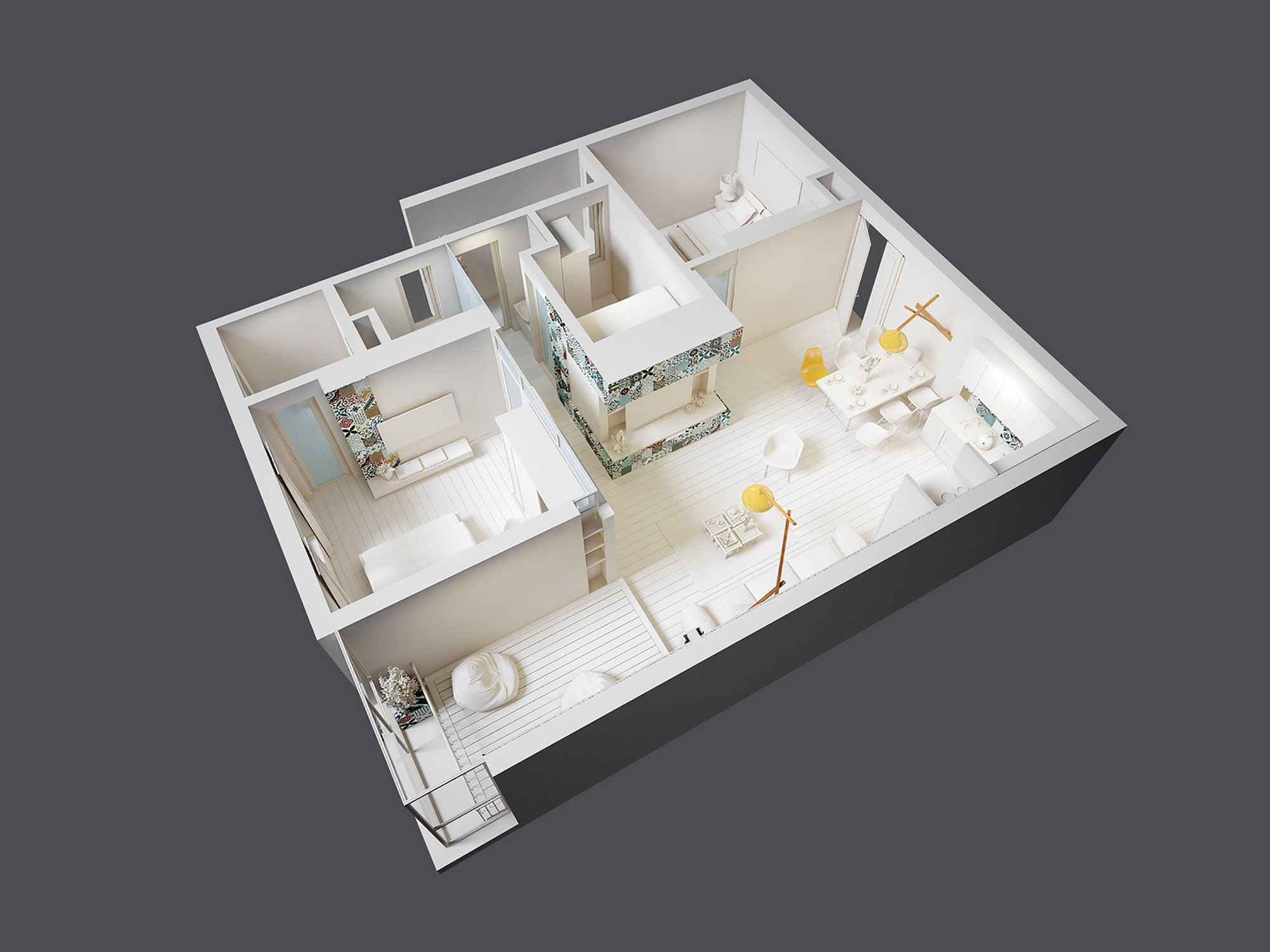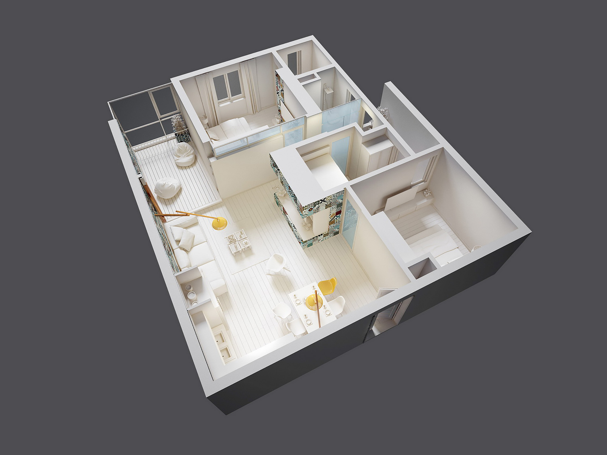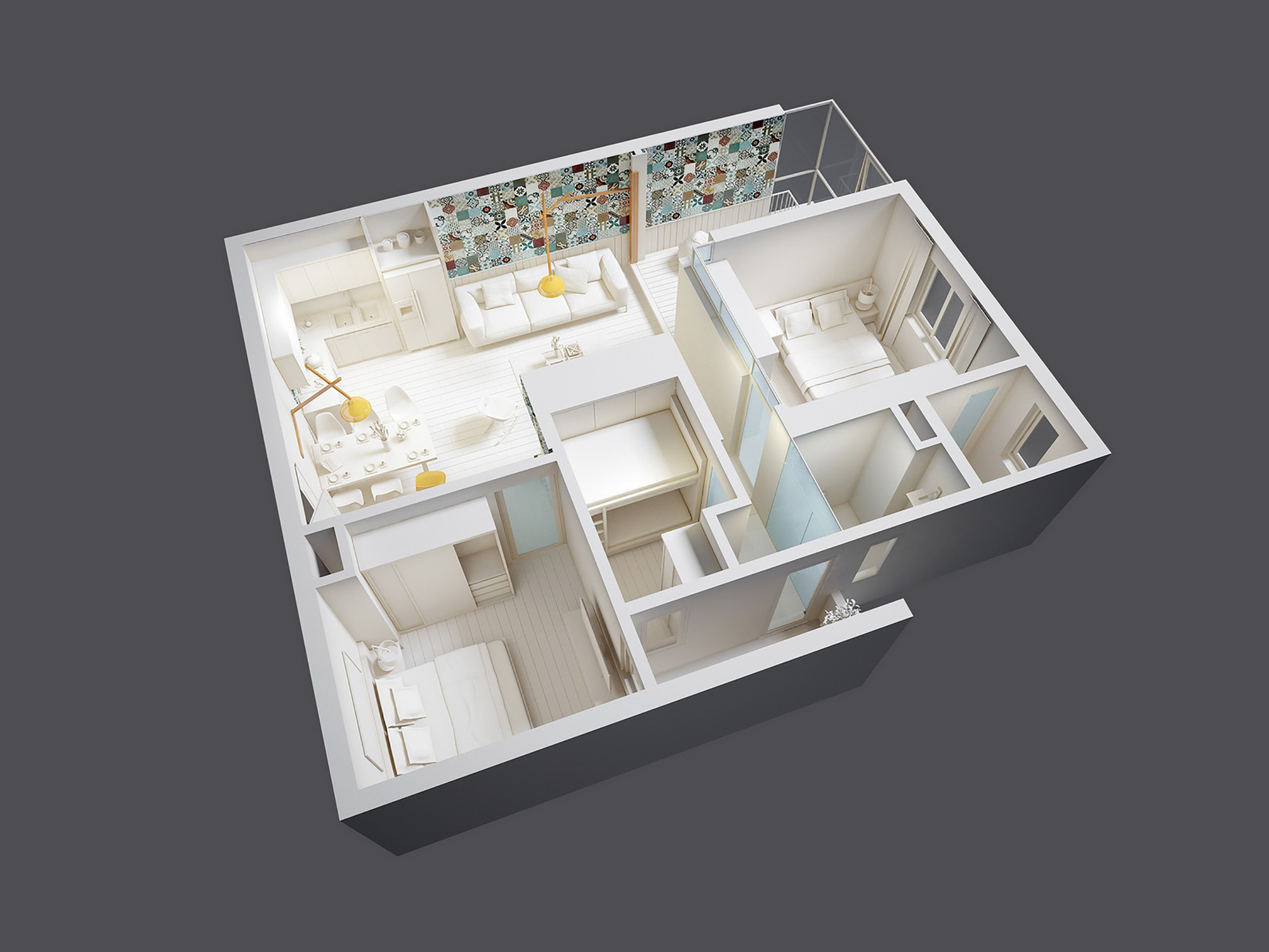 KTS đã phá bỏ một phòng ngủ ở trung tâm căn hộ để tạo thành không gian chung (phòng khách + phòng ăn + bếp + hiên), bốn không gian có thể “mượn” diện tích giao thông để tạo ra sự liên hoàn các chức năng khác nhau của các phòng thành một không gian rộng lớn với thông gió và ánh sáng tốt.