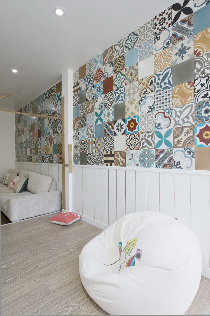 Gạch men hoa văn được sử dụng làm vật liệu trang trí (loại gạch xuất hiện ở Việt Nam vào những năm 90 được sử dụng phổ biến để lát nền nhà). Nó đi vào tâm trí của người dân Việt Nam để nhớ về một thời kỳ khó khăn của nền kinh tế. Nhưng hiện nay, vật liệu này được sản xuất trở lại với vai trò trang trí làm đẹp cho các không gian nội thất nghệ thuật. Trong căn hộ này, KTS đã ép gạch vào khối tủ ti vi trong phòng khách, một ít trong phòng ngủ chính và một chút trong nhà bếp. Bằng cách này, chủ nhà có thể cảm nhận được cảm giác “Nghệ thuật” ở mức vừa đủ và ở khắp mọi nơi trong nhà.