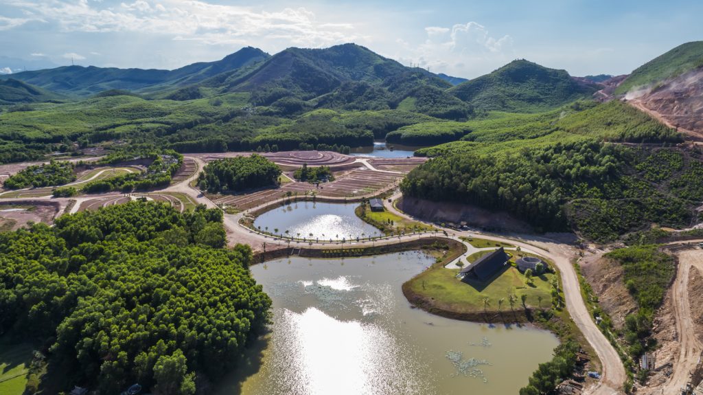 Được bao quanh bởi mạng lưới bốn bề là hồ nước và núi non, công viên nghĩa trang Hương An Viên là nơi sinh sống của cây cối, hoa lá và nhiều loại thảm thực vật khác, giúp tạo cảm giác nhẹ nhàng và tươi sáng hơn. Về phương diện kiến trúc, mái tre cong vút lấy cảm hứng từ sự mềm mại, dịu dàng của Huế gần đó và sông Hương.