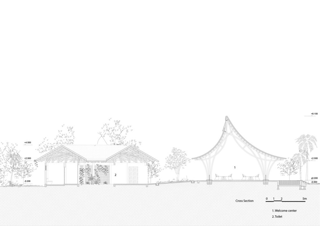 Mái nhà được thiết kế khá thấp để bảo vệ phía bên trong khỏi nắng và mưa trực tiếp, nhưng vẫn giữ được không gian thông thoáng cũng như độ cao thoải mái cho người sử dụng.