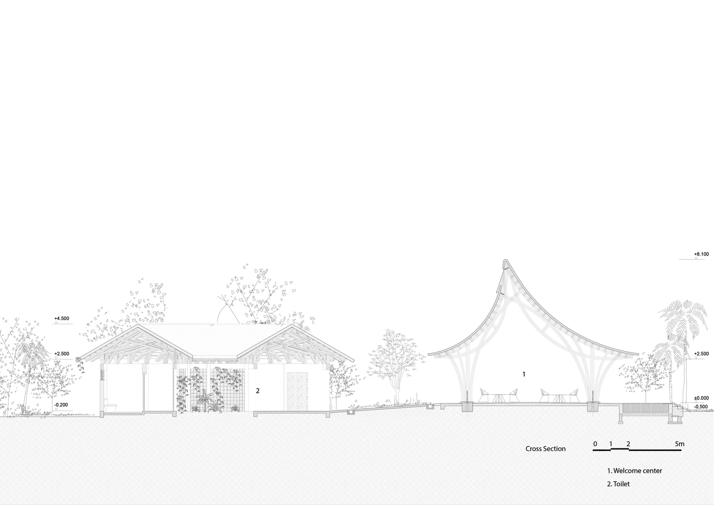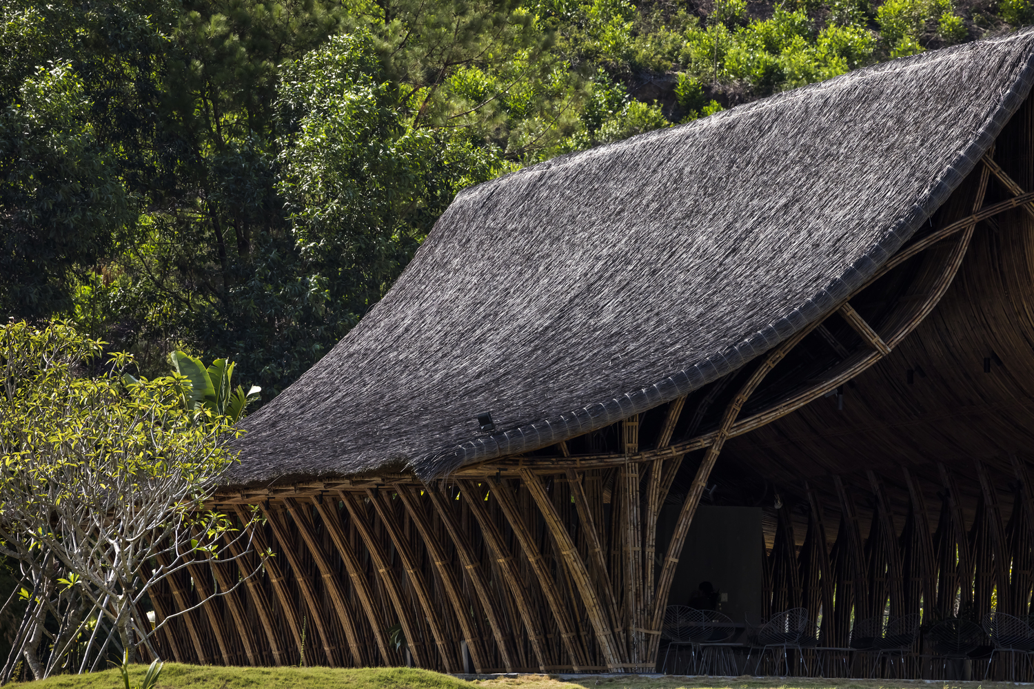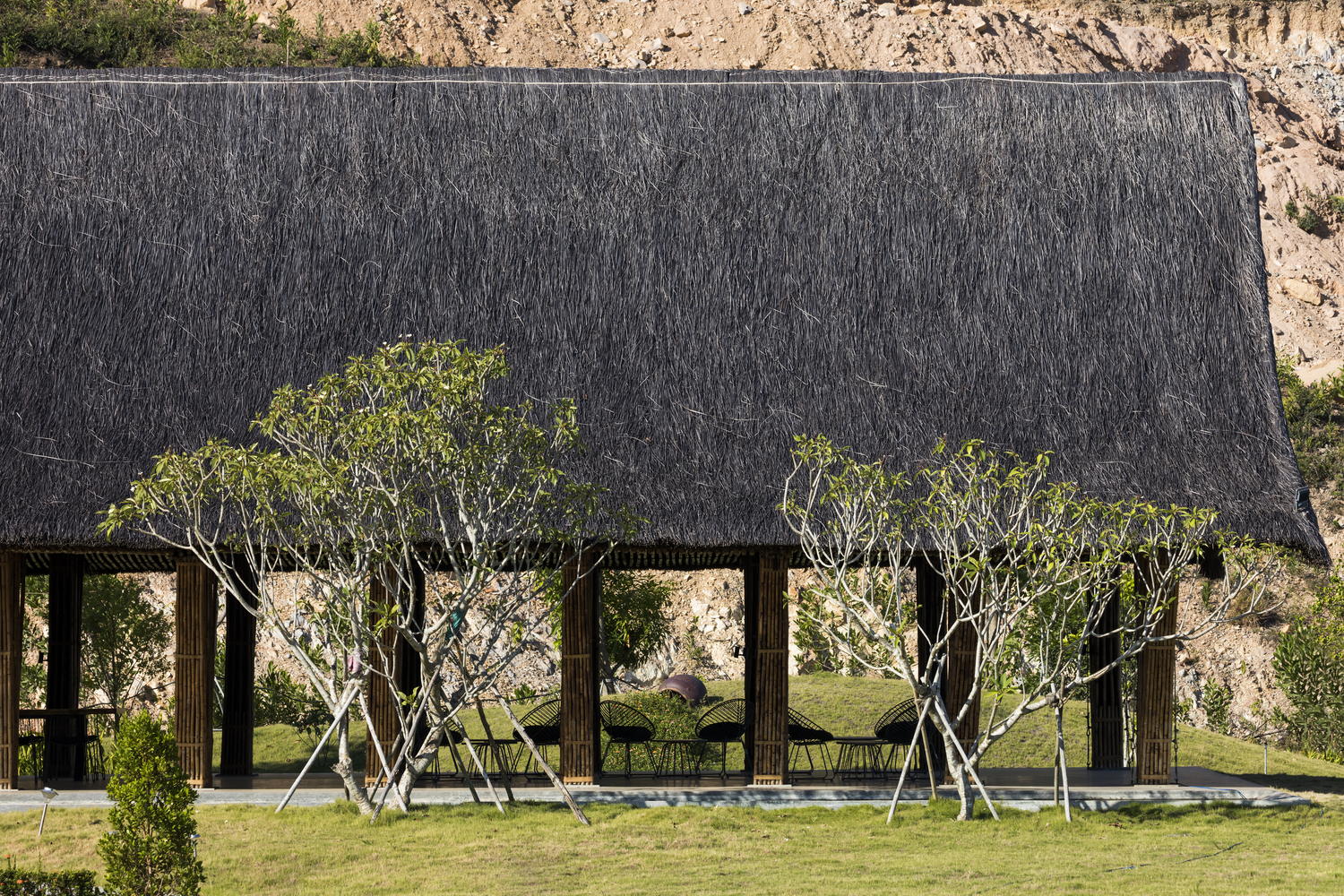 Mái nhà được thiết kế khá thấp để bảo vệ phía bên trong khỏi nắng và mưa trực tiếp, nhưng vẫn giữ được không gian thông thoáng cũng như độ cao thoải mái cho người sử dụng.