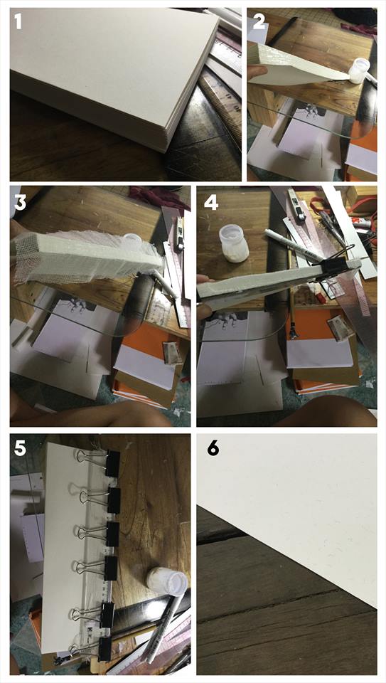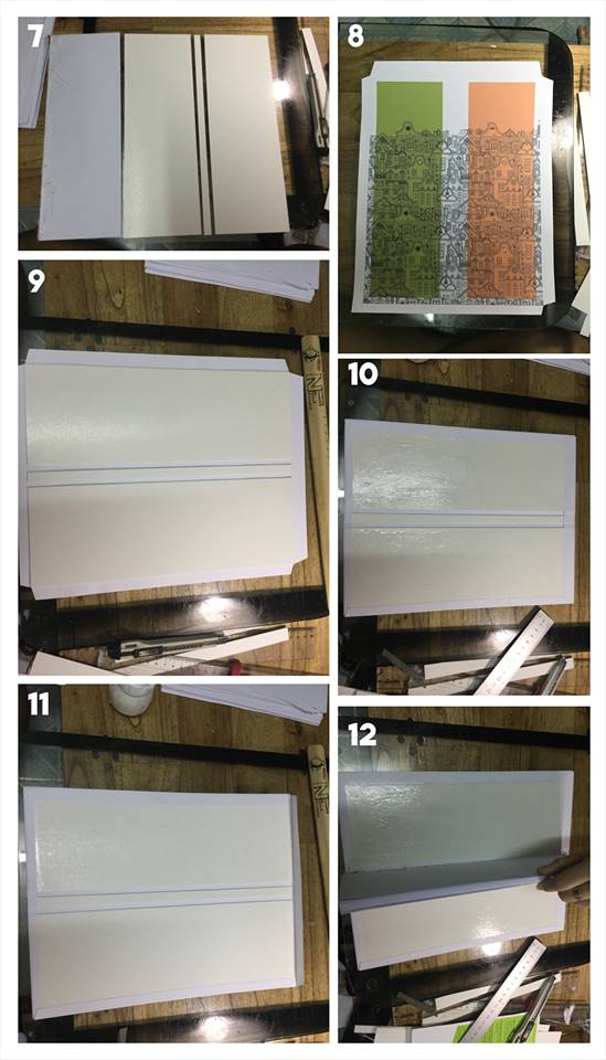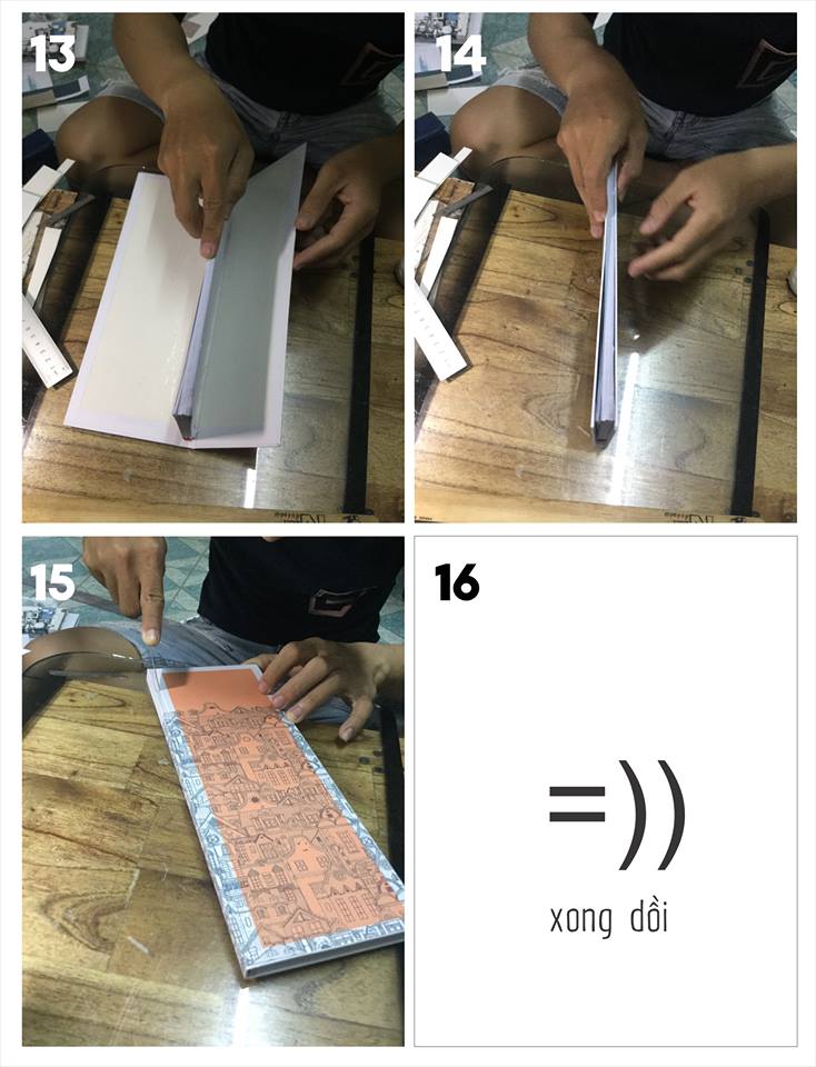 15. Miết theo 2 miếng bìa bên trong để tạo nếp. Có thể dùng vật nặng đè lên cho dính. Để khoảng 2~3 tiếng là ổn.