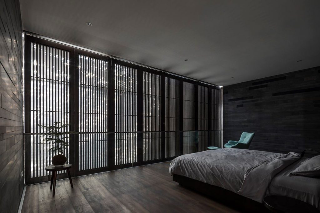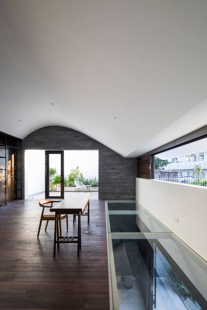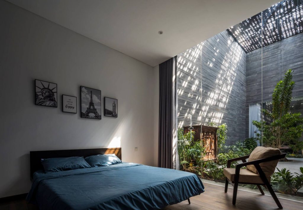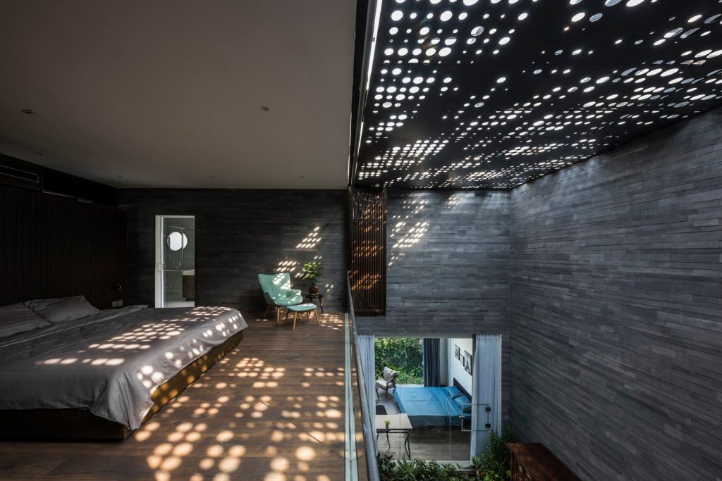 Tầng trên dành toàn bộ cho gia đình trẻ 3 thành viên, liên kết cấu trúc qua 2 khoảng trống thông tầng phía trước và sau của không gian chính.
