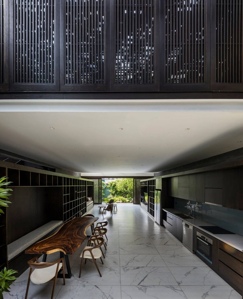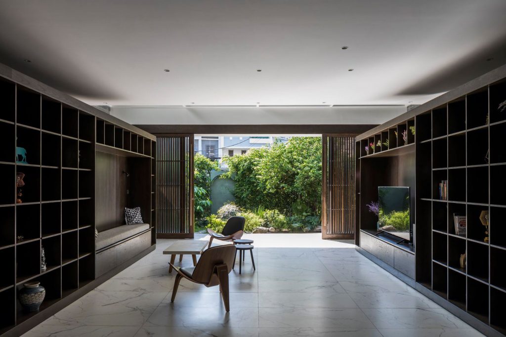 Với việc trong gia đình có 3 người lớn tuổi giải pháp đầu tiên đưa ra là tập trung các không gian sinh hoạt và nghỉ ngơi ở một mặt phẳng. Các không gian này được kết nối với nhau bằng một khoảng không gian rỗng rộng lớn, trải dài liên tục từ đầu nhà đến cuối nhà. Tất cả các hoạt động thường nhật như nấu ăn, chăm sóc cây cối, trẻ con vui chơi, người già tập thể dục… đều được diễn ra và kết nối trong không gian rỗng này.