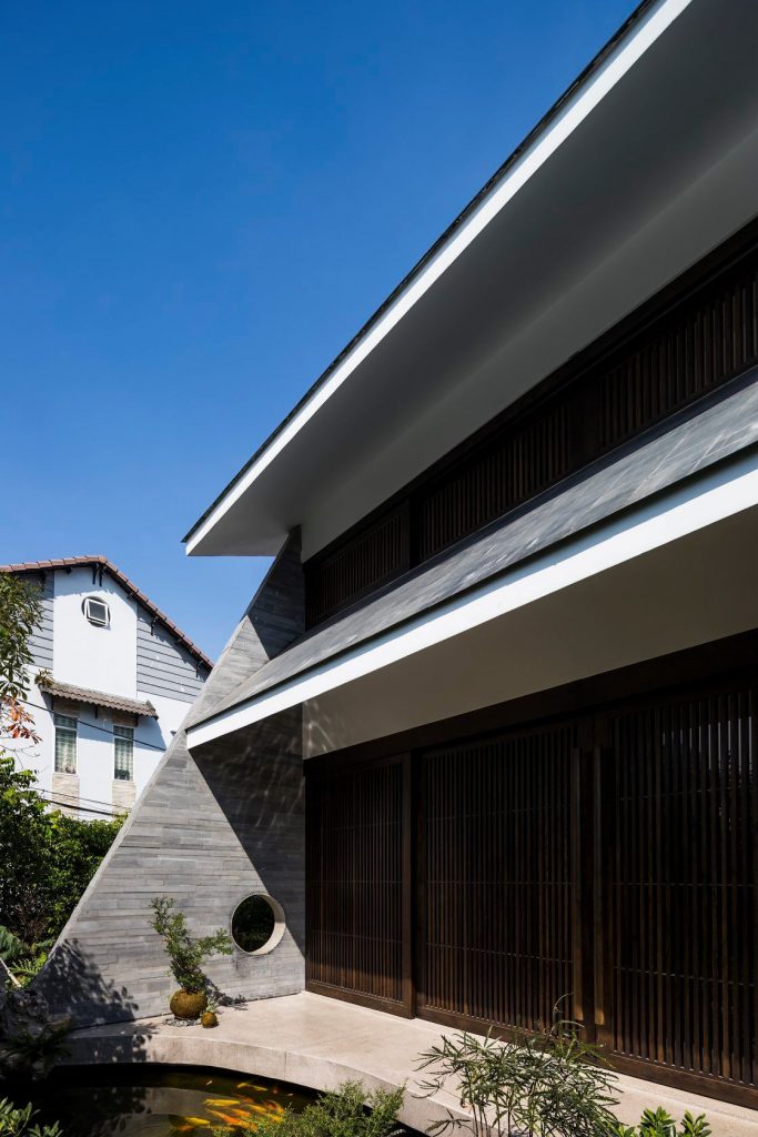 Toàn bộ công trình được lùi sâu vào bên trong, hệ mái hạ thấp nhằm xoá đi cảm giác đồ sộ của khối tích công trình. Bên cạnh việc sử dung tất cả tường rào cây xanh và các cây lớn có tán lá tạo thành một ốc đảo xanh trong lòng phố thị, công trình hiện lên thấp thoáng và ẩn mình trong thiên nhiên vây quanh.