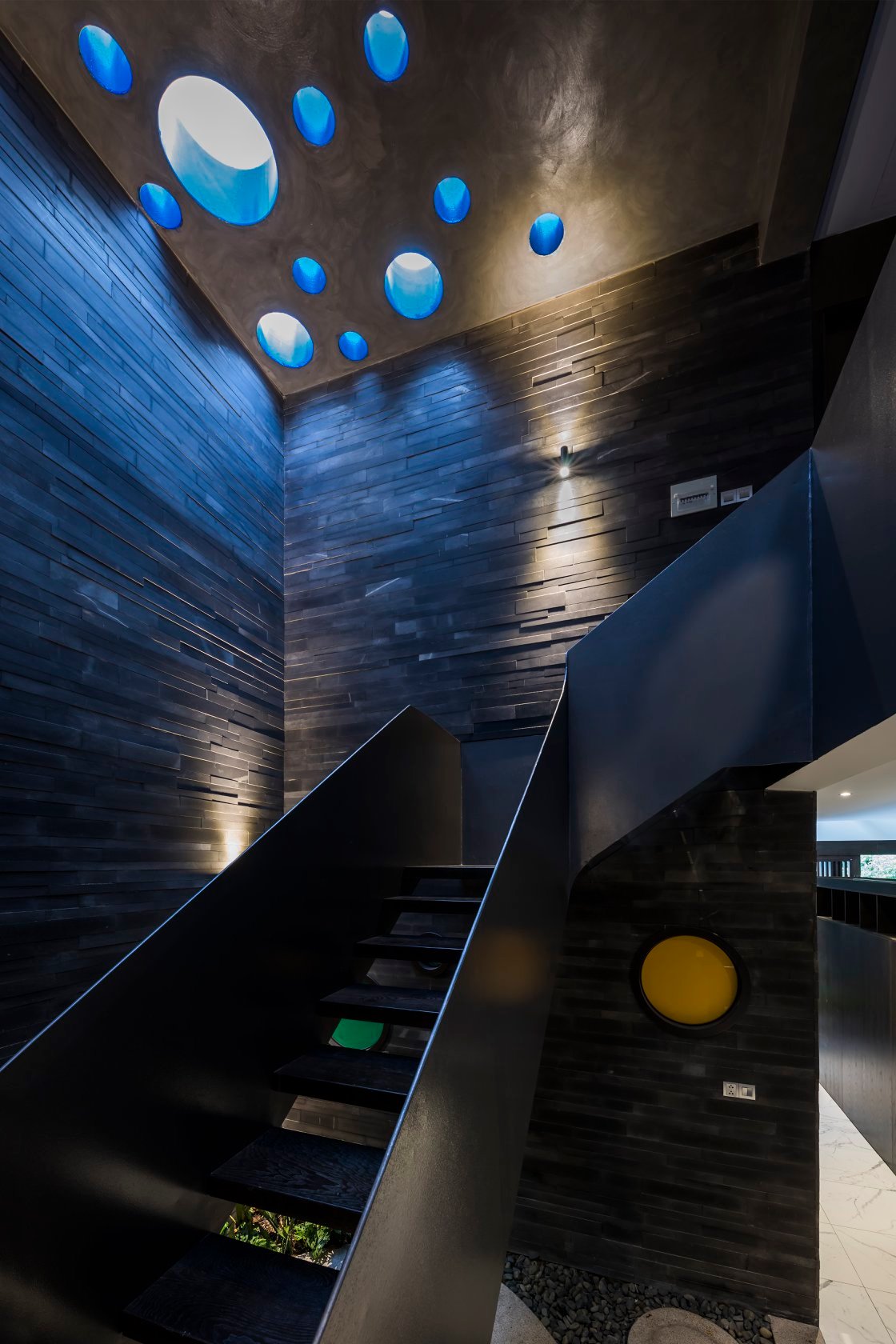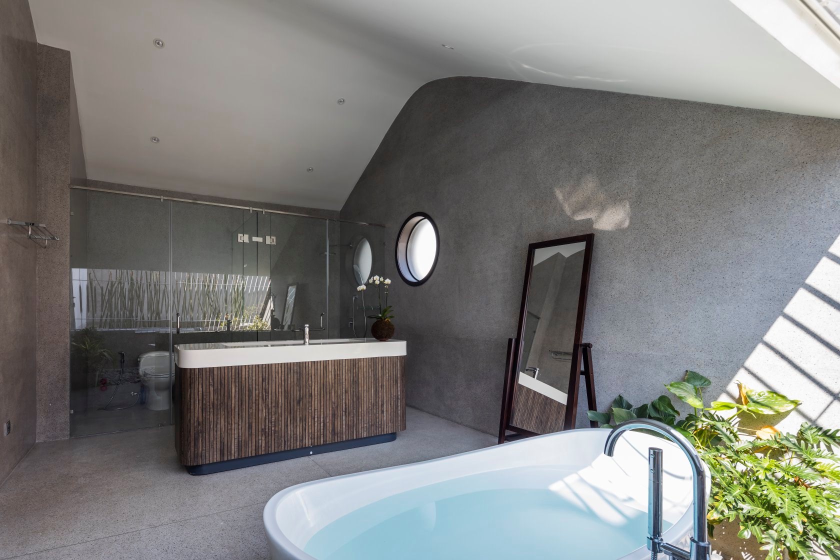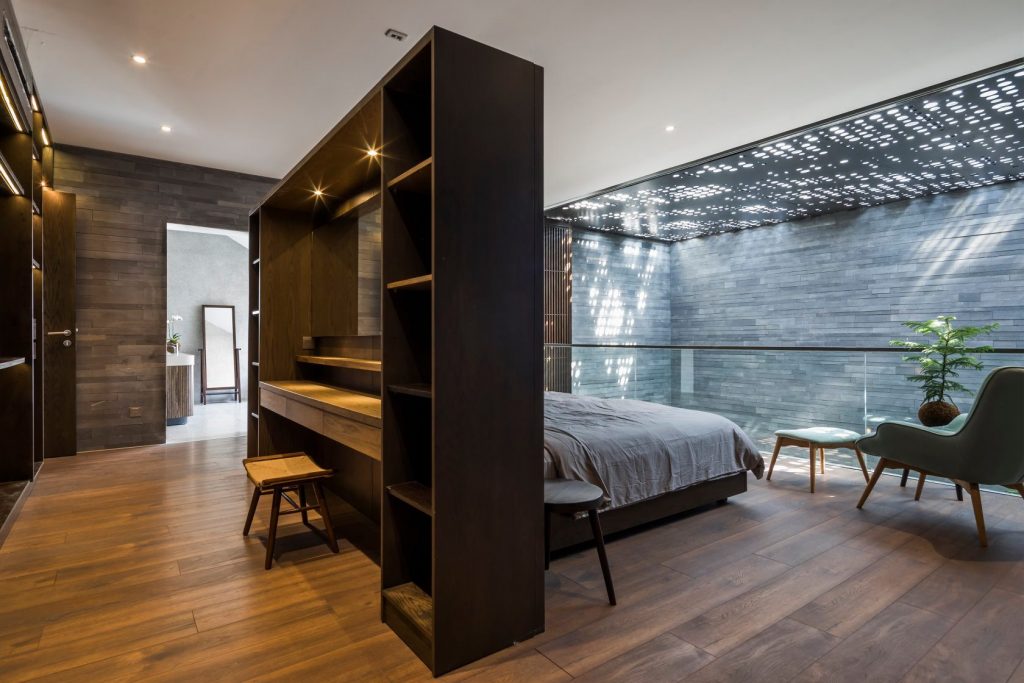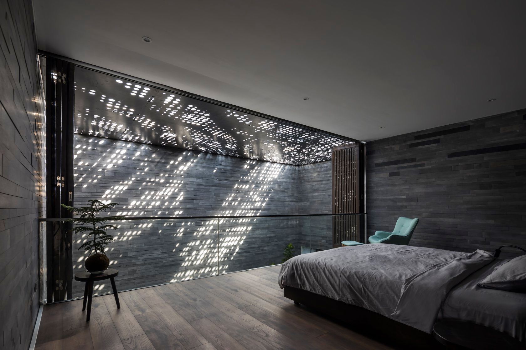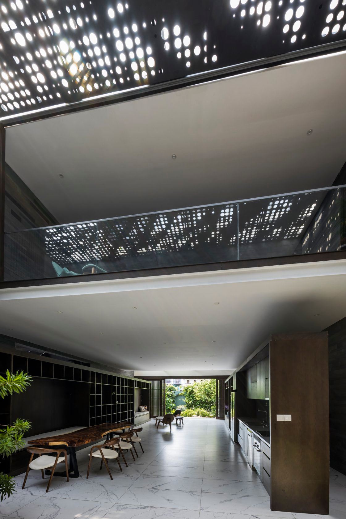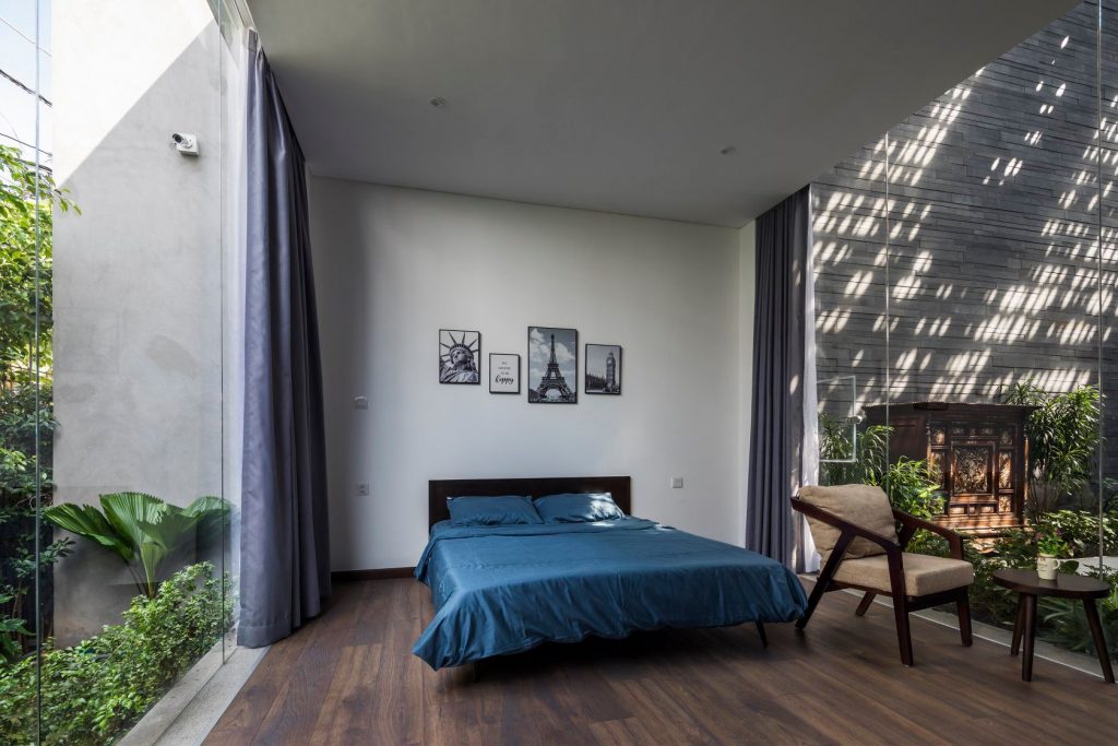 Tầng trên dành toàn bộ cho gia đình trẻ 3 thành viên, liên kết cấu trúc qua 2 khoảng trống thông tầng phía trước và sau của không gian chính.