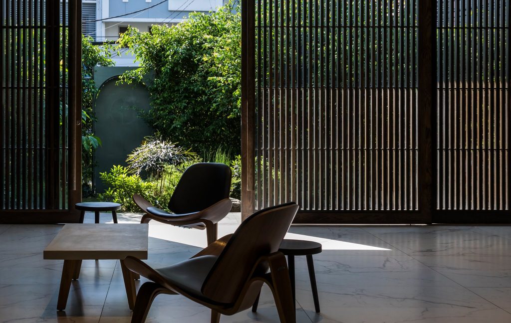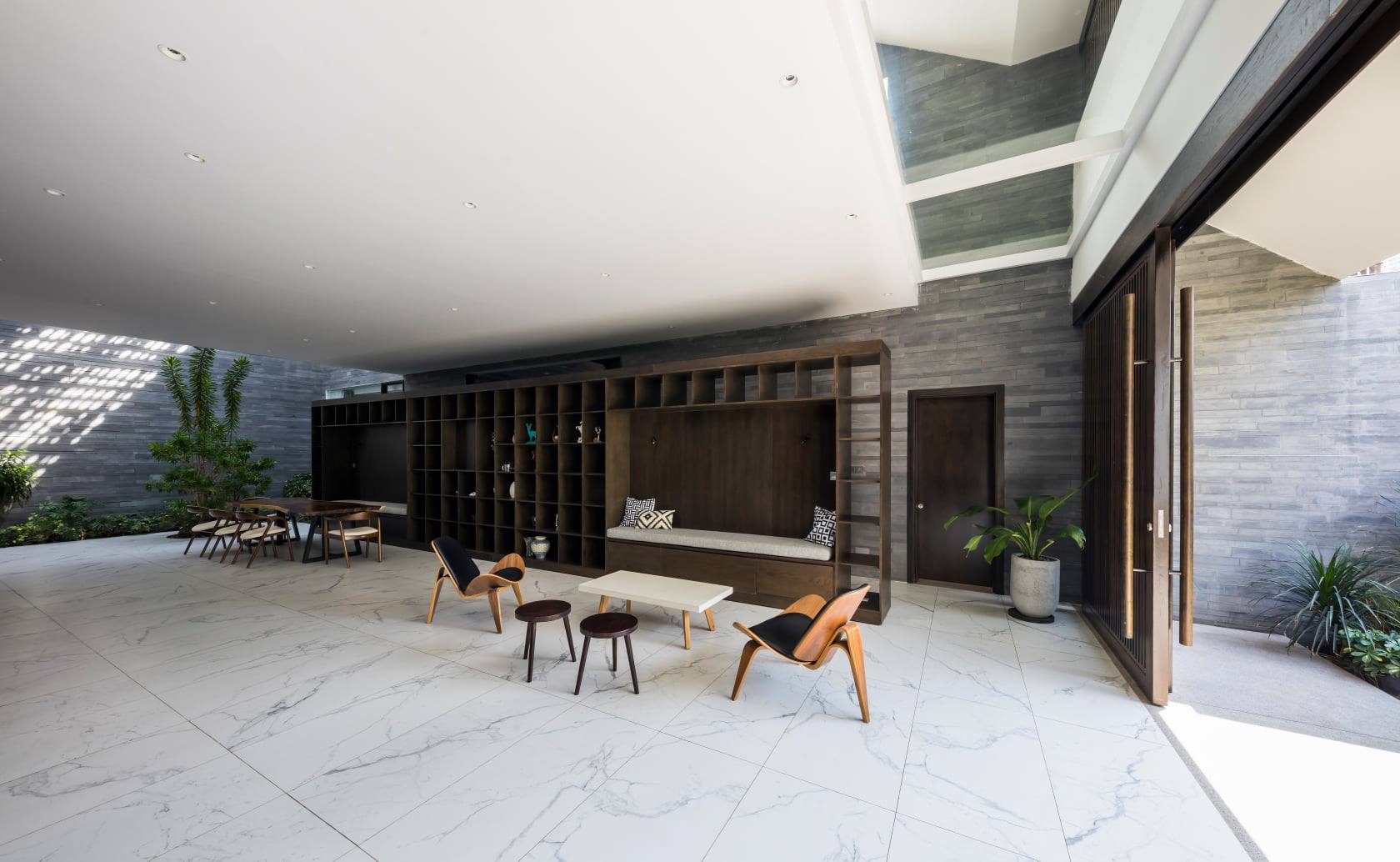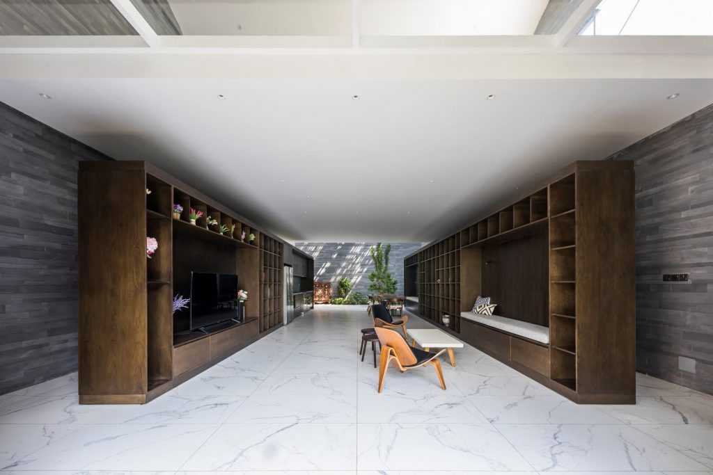 Với việc trong gia đình có 3 người lớn tuổi giải pháp đầu tiên đưa ra là tập trung các không gian sinh hoạt và nghỉ ngơi ở một mặt phẳng. Các không gian này được kết nối với nhau bằng một khoảng không gian rỗng rộng lớn, trải dài liên tục từ đầu nhà đến cuối nhà. Tất cả các hoạt động thường nhật như nấu ăn, chăm sóc cây cối, trẻ con vui chơi, người già tập thể dục… đều được diễn ra và kết nối trong không gian rỗng này.