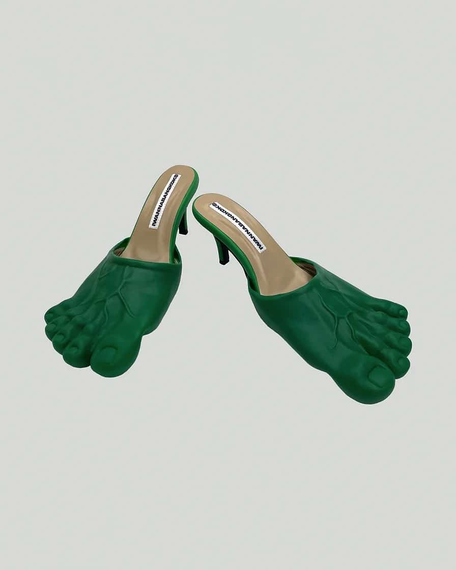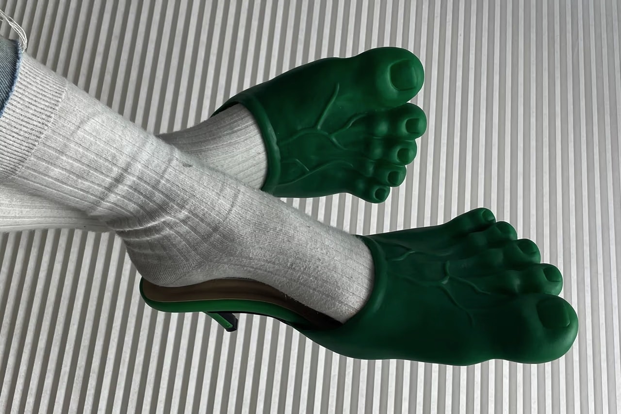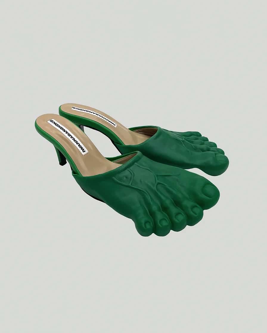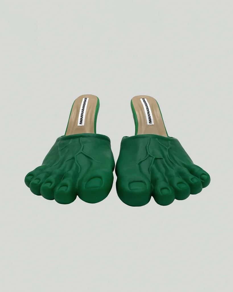 Được đặt tên là Hulkfoot và Bigfoot, cặp giày gót cao unisex này được làm thủ công từ da với các đường gân chạy dọc khắp đôi chân khổng lồ.