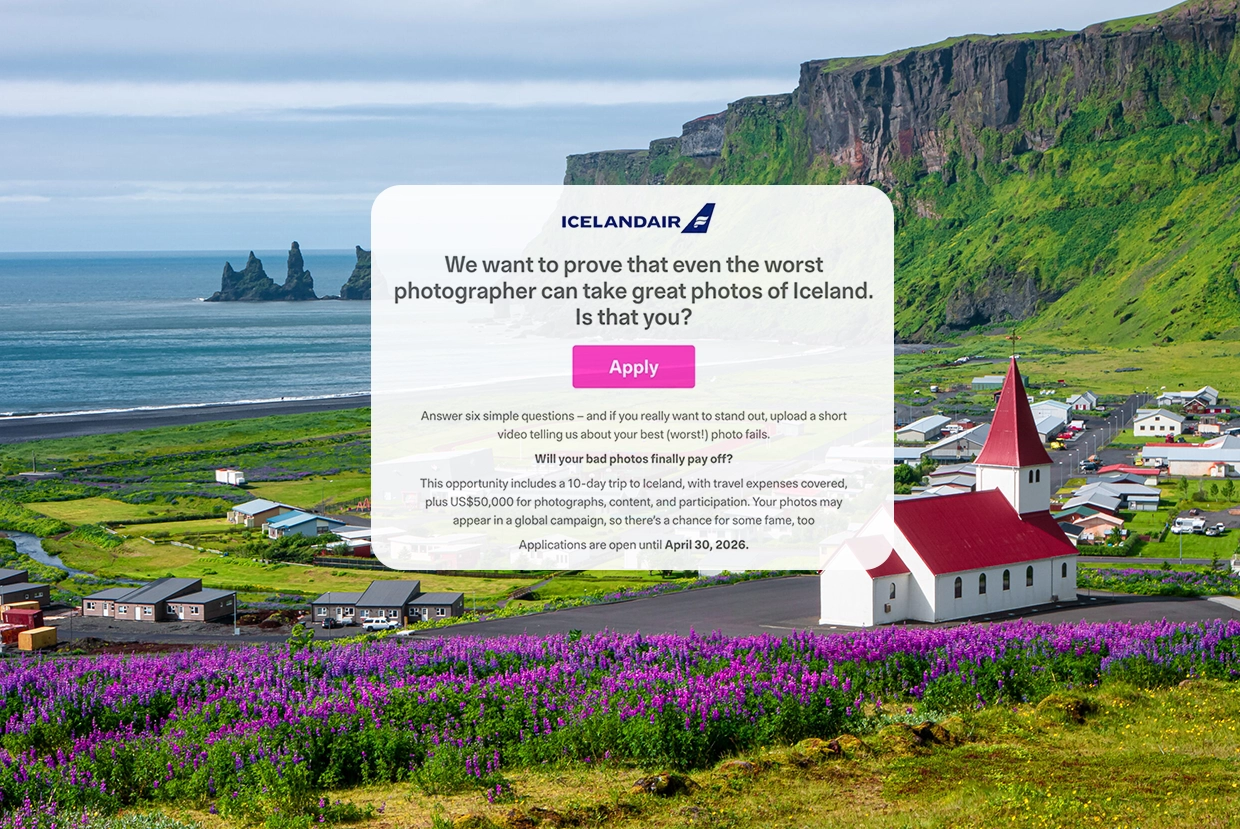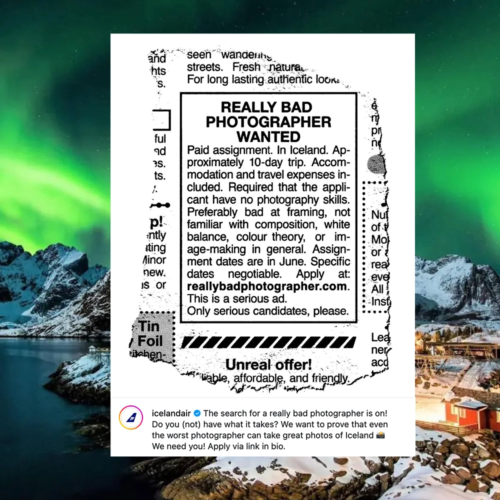 Icelandair đang tìm kiếm một “nhiếp ảnh gia cực kỳ tệ” theo đúng nghĩa đen cho một chiến dịch nhằm chứng minh rằng ngay cả người chụp dở nhất cũng có thể tạo ra những bức ảnh đẹp tại Iceland.